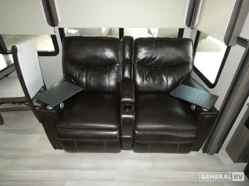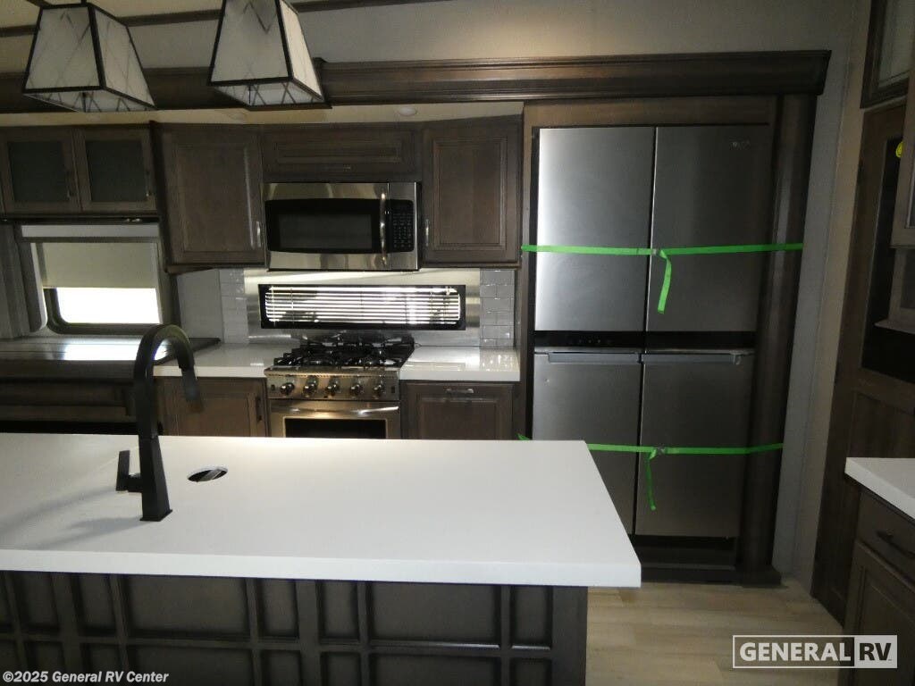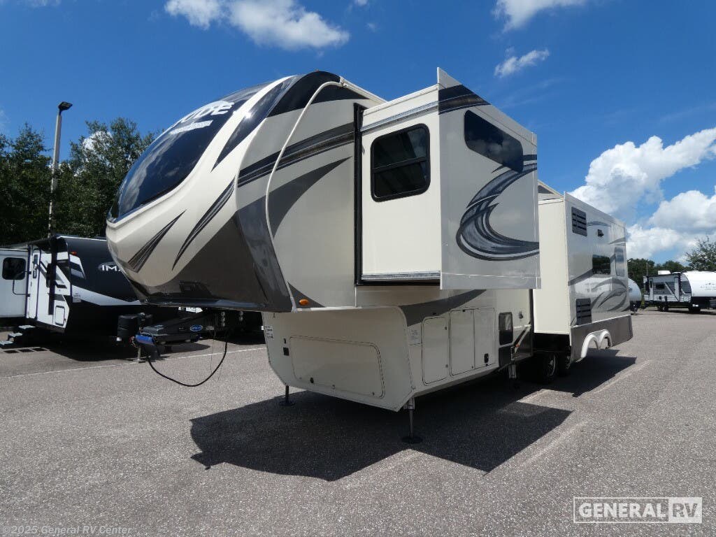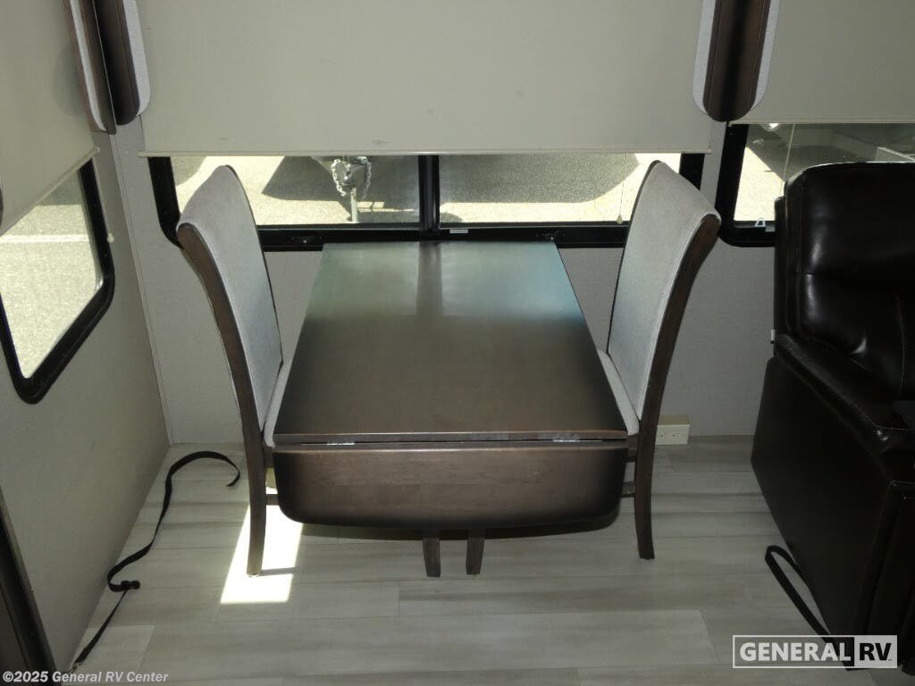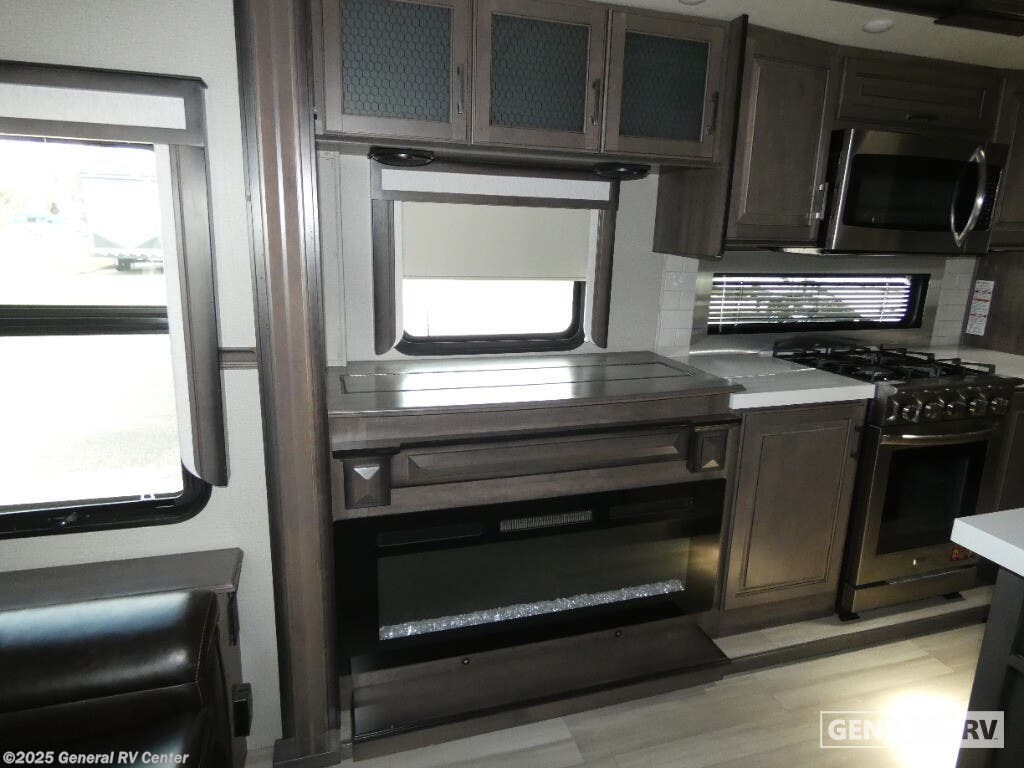 Discover the 2021 Grand Design Solitude 310GK, where luxury meets functionality in a beautifully crafted fifth wheel. This spacious RV, stretching nearly 35 feet, offers a harmonious blend of comfort and modern design. The rear living area is perfect for relaxation, featuring a tri-fold sofa and theatre seating, all centered around an entertainment center with a telescoping TV and fireplace. The kitchen is a chef's delight, boasting a full-size refrigerator, three-burner cooktop, and ample counter space, making meal preparation a breeze. With a free-standing dinette, you can enjoy meals in style and comfort. The Solitude 310GK is designed for restful nights with a king bed in the front bedroom, complete with a flip-top dresser and LED TV for your entertainment. The center bath offers a touch of elegance with a shower skylight and practical amenities. With generous storage solutions, including pass-thru storage and a pull-out kitchen, this RV ensures that everything you need is at your fingertips. Whether you're enjoying the powered retractable awnings or appreciating the convenience of washer/dryer prep, this RV promises a home-like experience on the road. For more details, visit your nearest General RV Dealership.