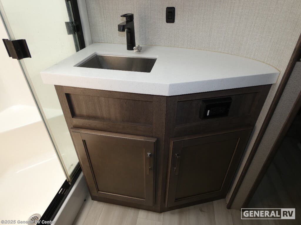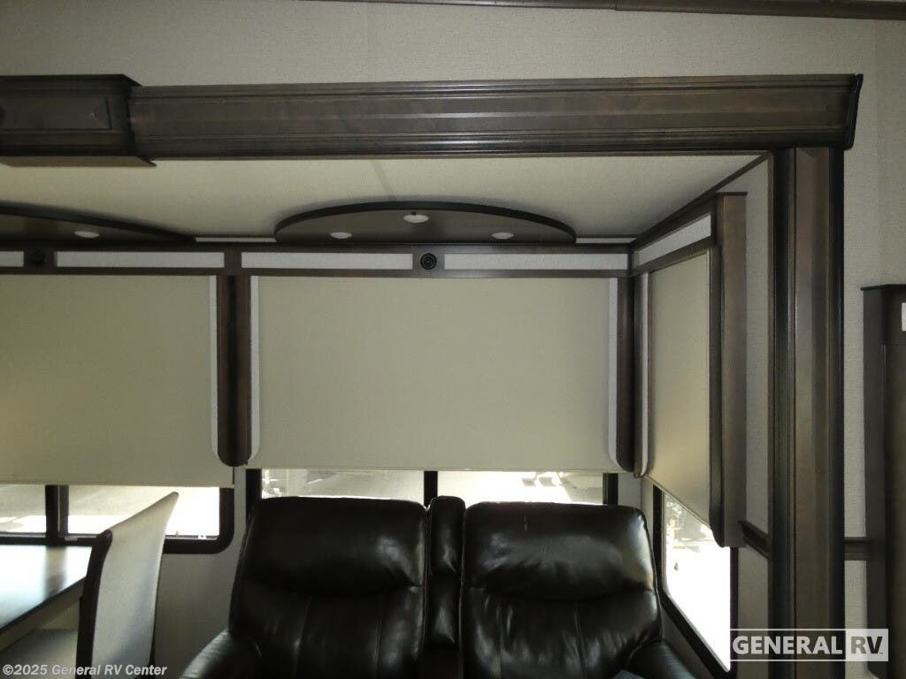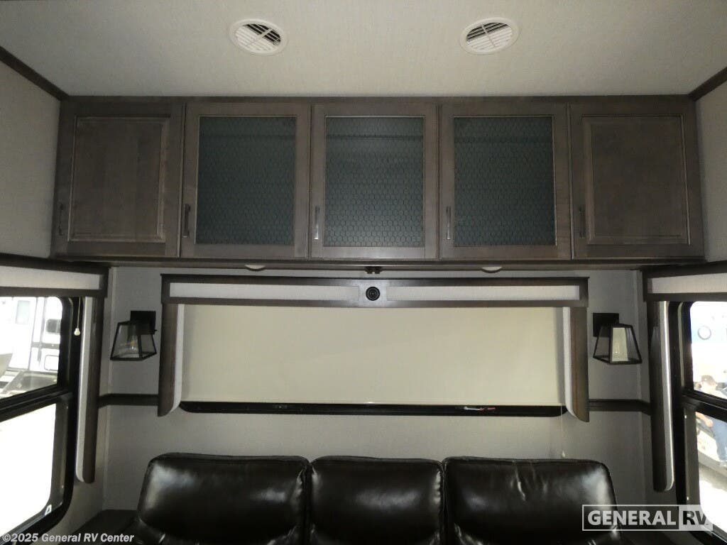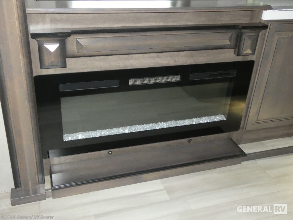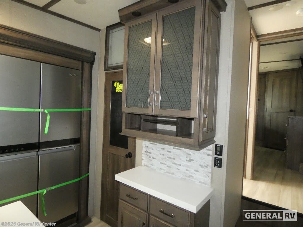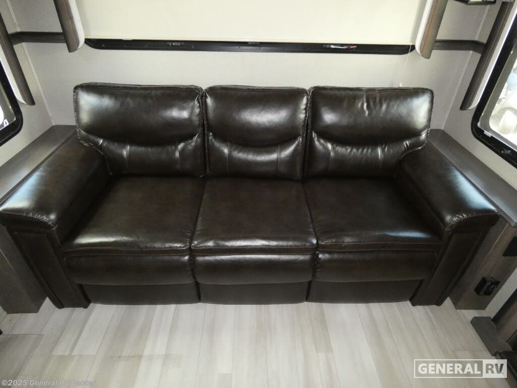 Discover the 2021 Grand Design Solitude 310GK, where luxury meets functionality in a beautifully crafted fifth wheel. This spacious RV, stretching nearly 35 feet, offers a harmonious blend of comfort and modern design. The rear living area is perfect for relaxation, featuring a tri-fold sofa and theatre seating, all centered around an entertainment center with a telescoping TV and fireplace. The kitchen is a chef's delight, boasting a full-size refrigerator, three-burner cooktop, and ample counter space, making meal preparation a breeze. With a free-standing dinette, you can enjoy meals in style and comfort. The Solitude 310GK is designed for restful nights with a king bed in the front bedroom, complete with a flip-top dresser and LED TV for your entertainment. The center bath offers a touch of elegance with a shower skylight and practical amenities. With generous storage solutions, including pass-thru storage and a pull-out kitchen, this RV ensures that everything you need is at your fingertips. Whether you're enjoying the powered retractable awnings or appreciating the convenience of washer/dryer prep, this RV promises a home-like experience on the road. For more details, visit your nearest General RV Dealership.