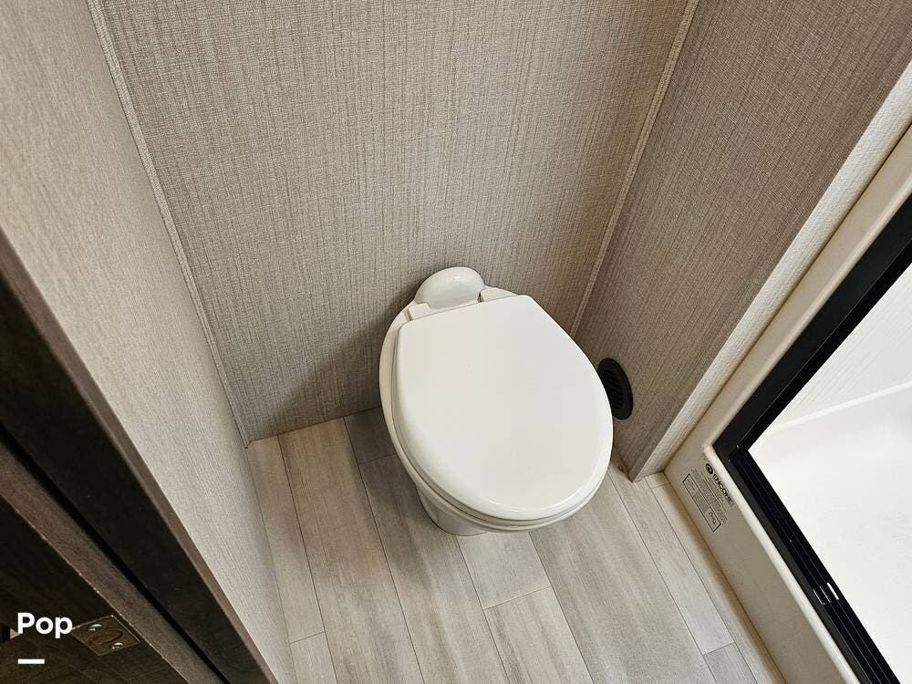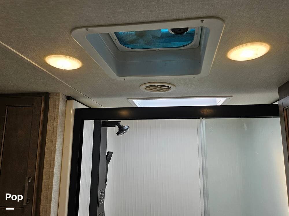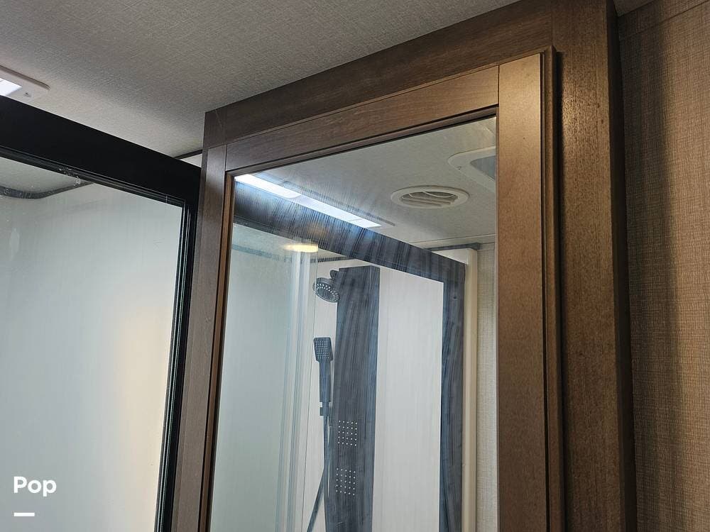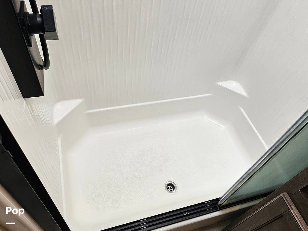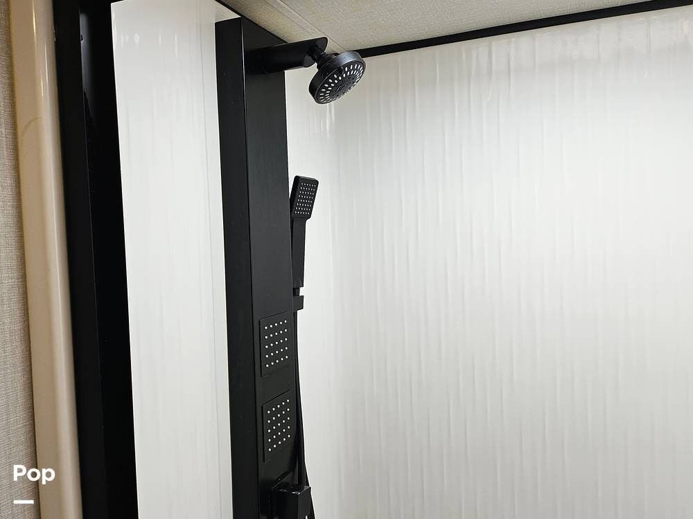 As you move toward the front of the RV, you find a large full bathroom with a large shower, vanity, toilet, and a privacy door.