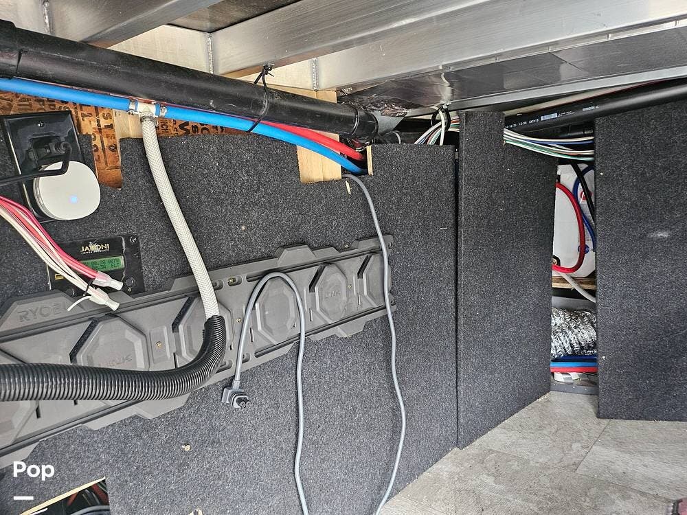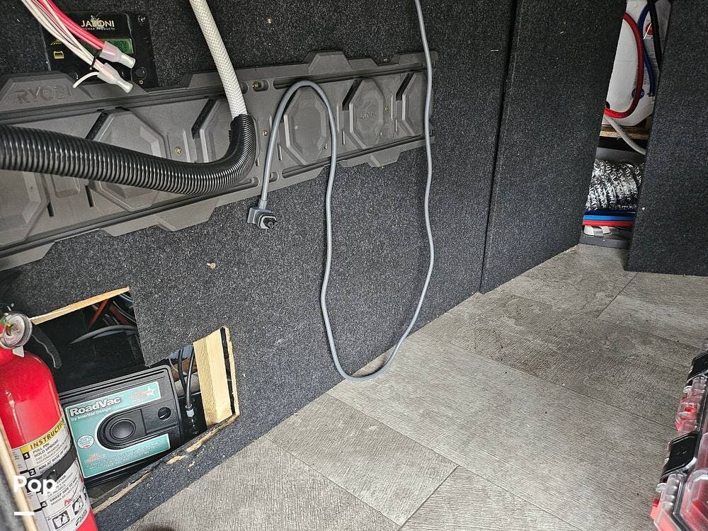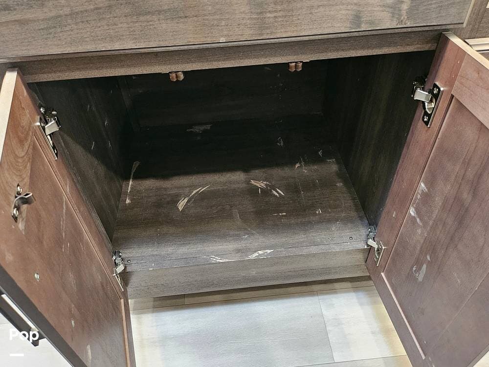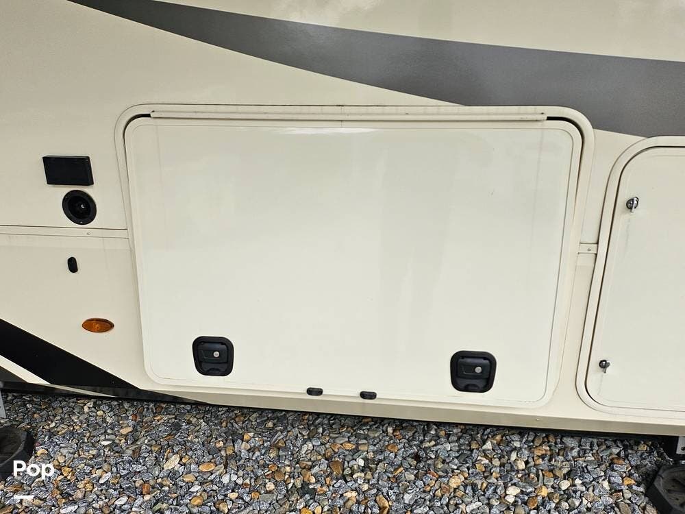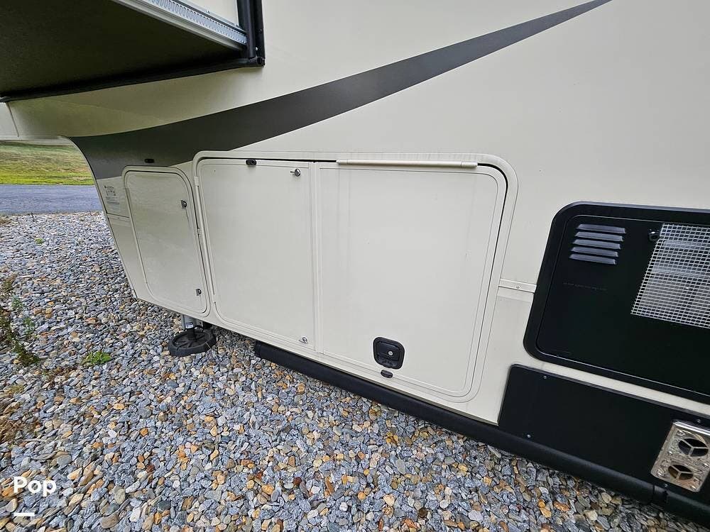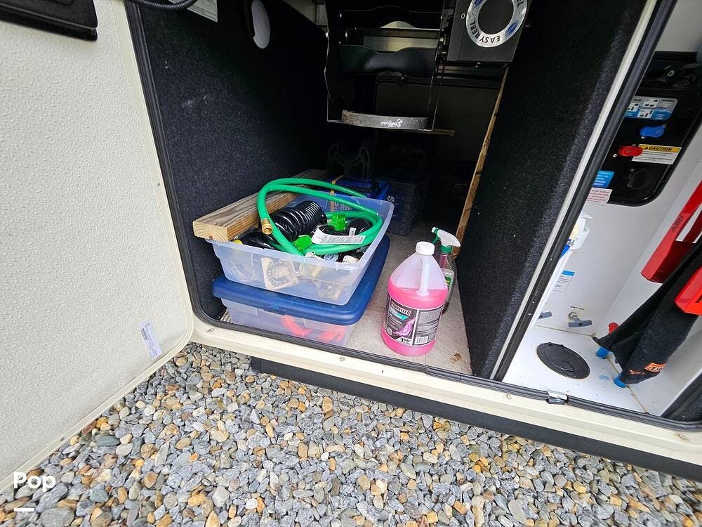 Outside are multiple storage bays with a front pass-through storage compartment.