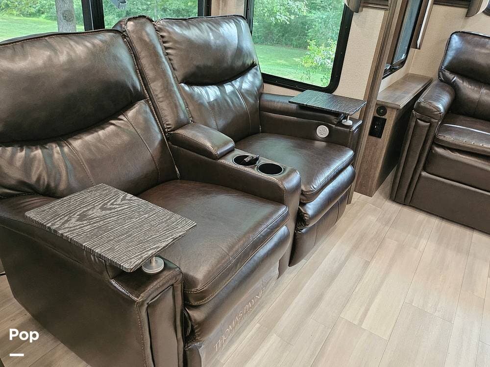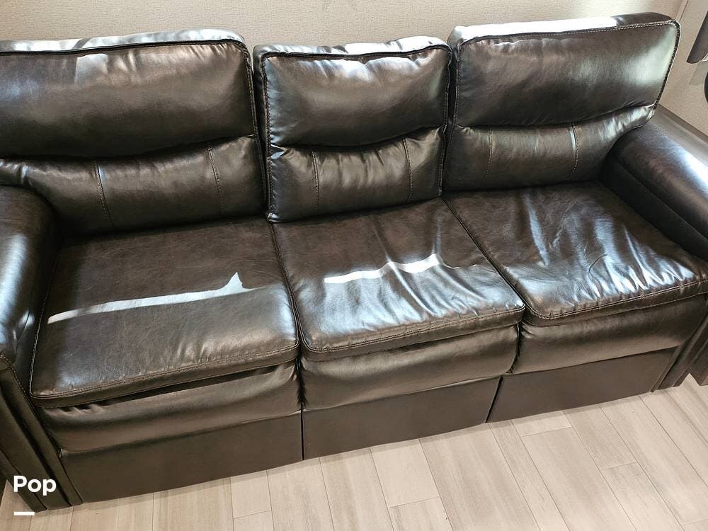 This 2021 Solitude (by Grand Design) 310GK-R floor plan features a rear living area. The area has a tri-fold sofa, stadium-style recliners, an LED fireplace, and excellent lighting.