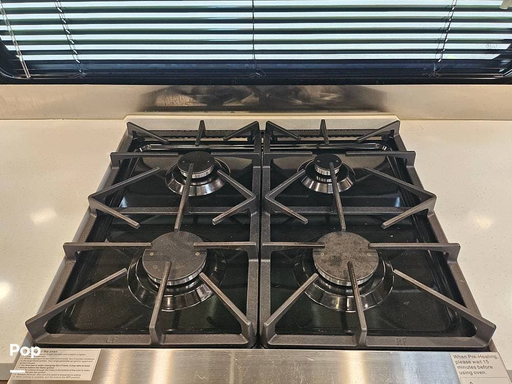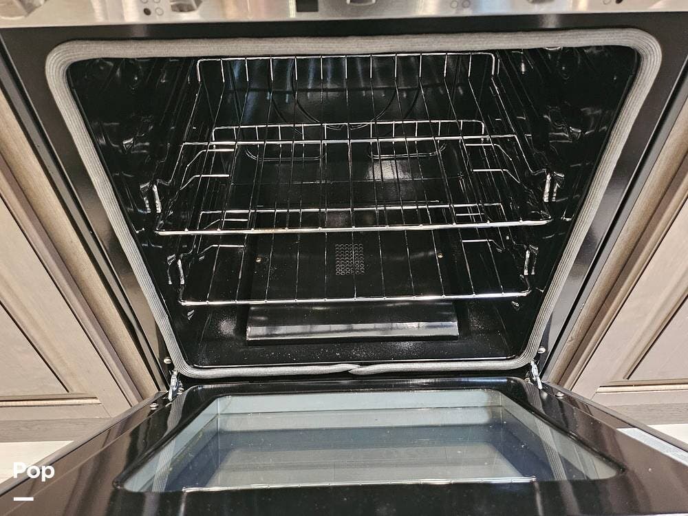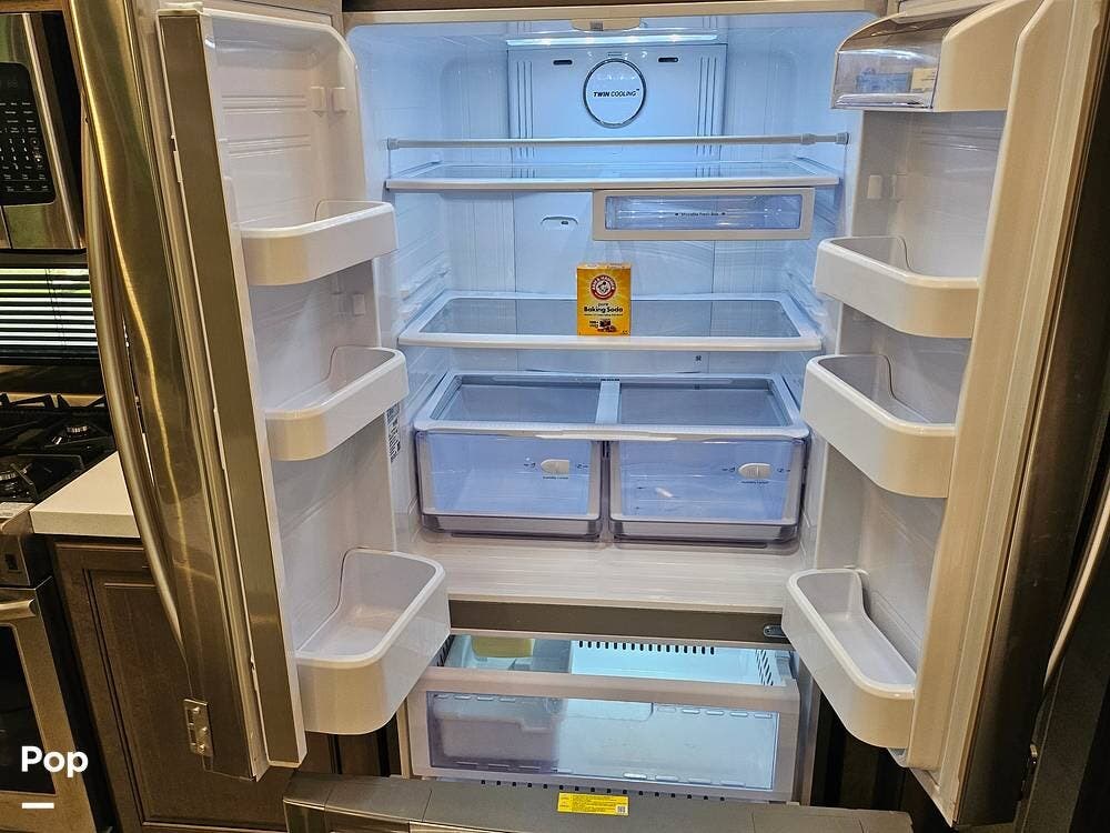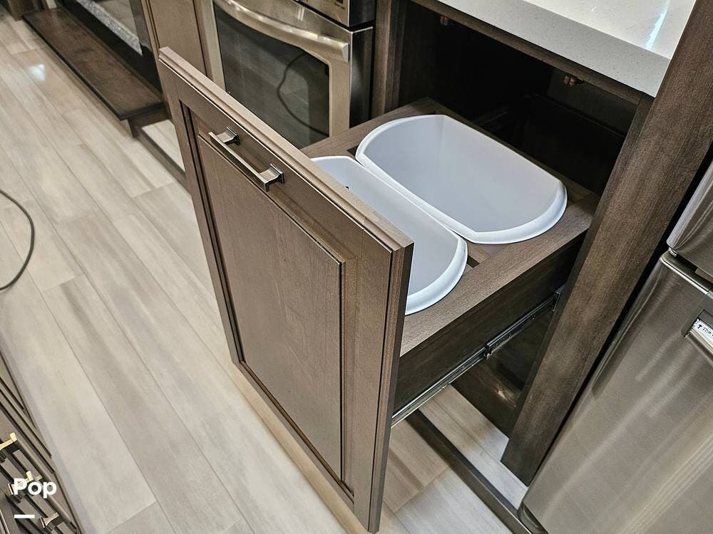The kitchen features a large island with a double stainless steel sink and ample storage. The full-size refrigerator operates on either propane or electricity. A great feature is the hidden "pull-out" waste/trash cans.