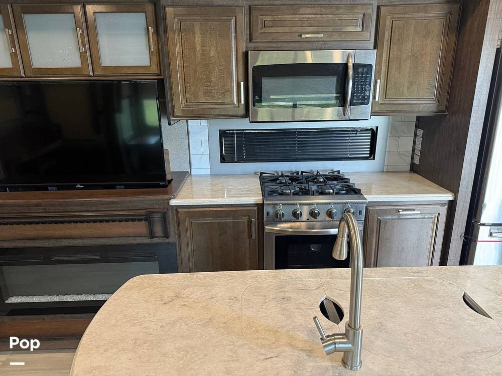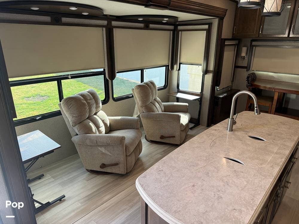 The rear living area offers theater seating, two La-Z-Boy swivel recliners, a bar height dining table with two chairs, and a fireplace. The gourmet kitchen is equipped with an island, a residential refrigerator, and a four-burner stove.