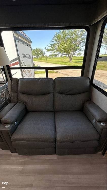 This RV is loaded with extras, including a generator, an upgraded suspension, an upgraded Reese Goosebox 20k hitch, a trailer tire pressure monitoring system, and an outdoor TV!