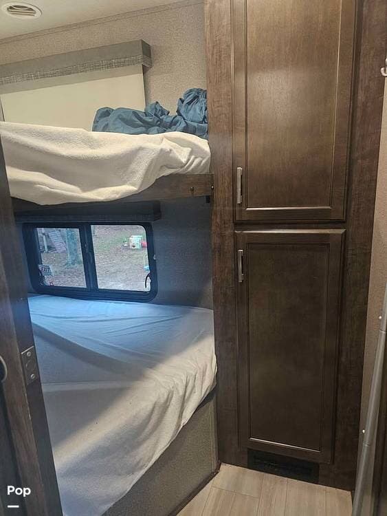 At the back of the RV is the bunk room, featuring double over-and-under bunks.