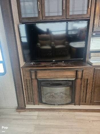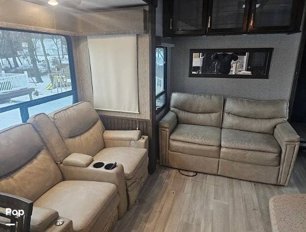 Relax on the tri-fold sofa or the theater seats and enjoy the large flat screen TV with a fireplace below.