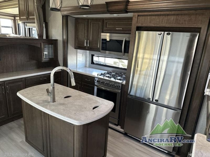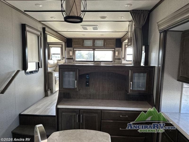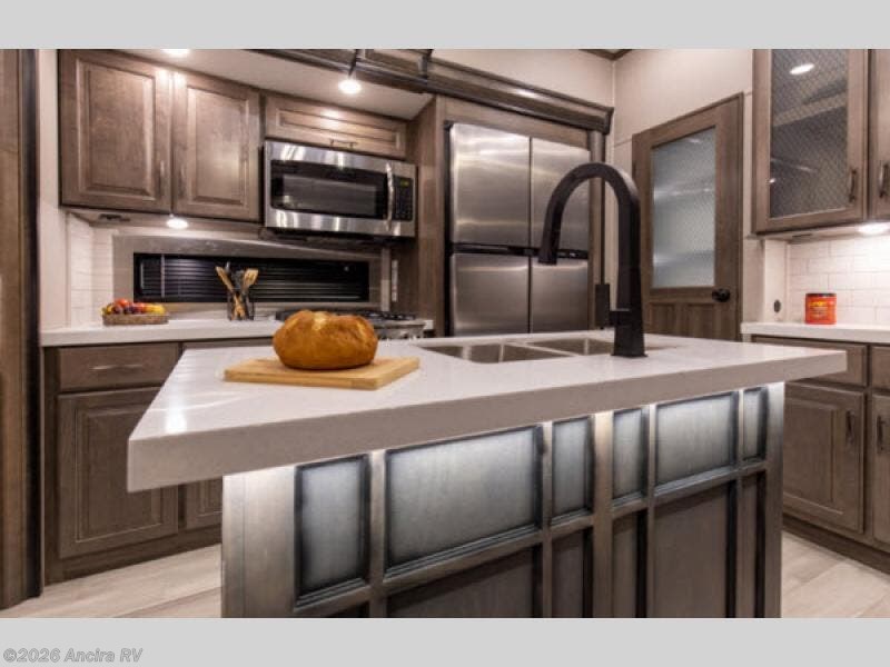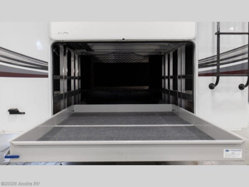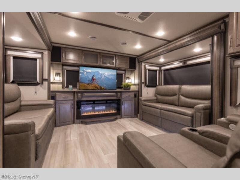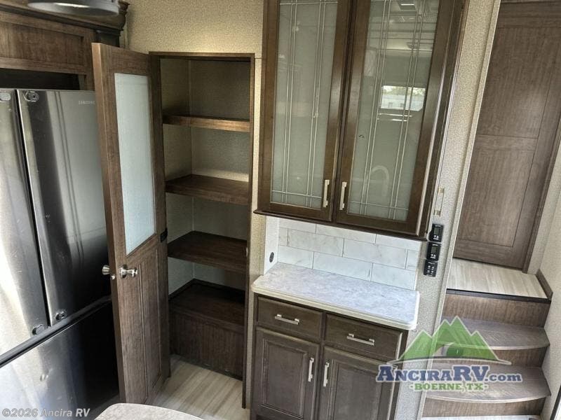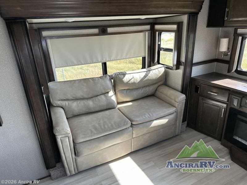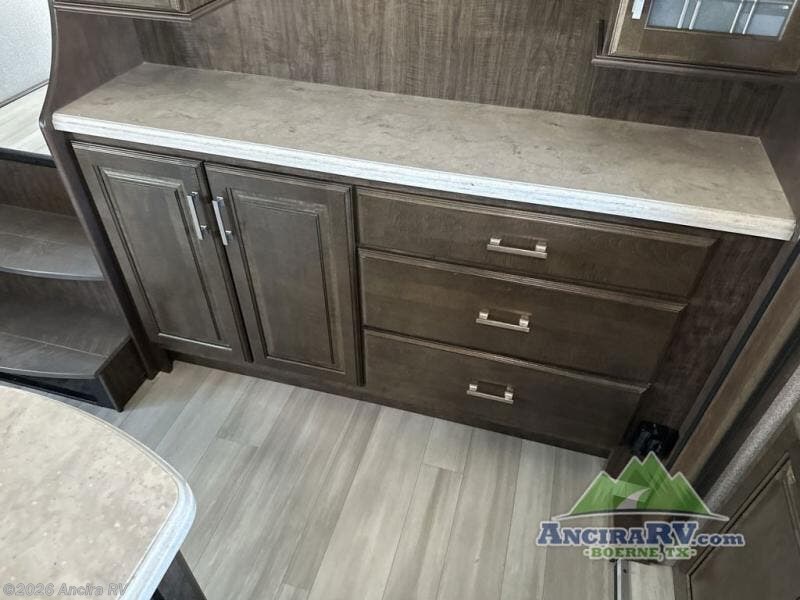 No worries about leaving anything behind with all the storage found throughout the interior and the exterior of this fifth wheel! From the bedroom closet and flip-up dresser, plus the overhead cabinets in the kitchen and separate living area to the exterior rear storage with a sliding tray and side access, there is a place for everything. Everyone can visit in the rear living area with an entertainment center, an LED TV, a fireplace and a window for great views while sitting on the dual tri-fold sofa slides and the theater seating. The buffet area can be utilized many ways, and the free-standing dinette offers a place to dine and play games. The kitchen offers full amenities including a hutch and oversized pantry. And you can stay refreshed with the full bathroom and get a good night's sleep on the queen bed slide or choose a king option.