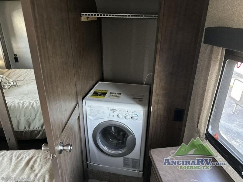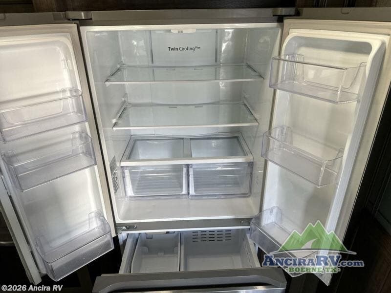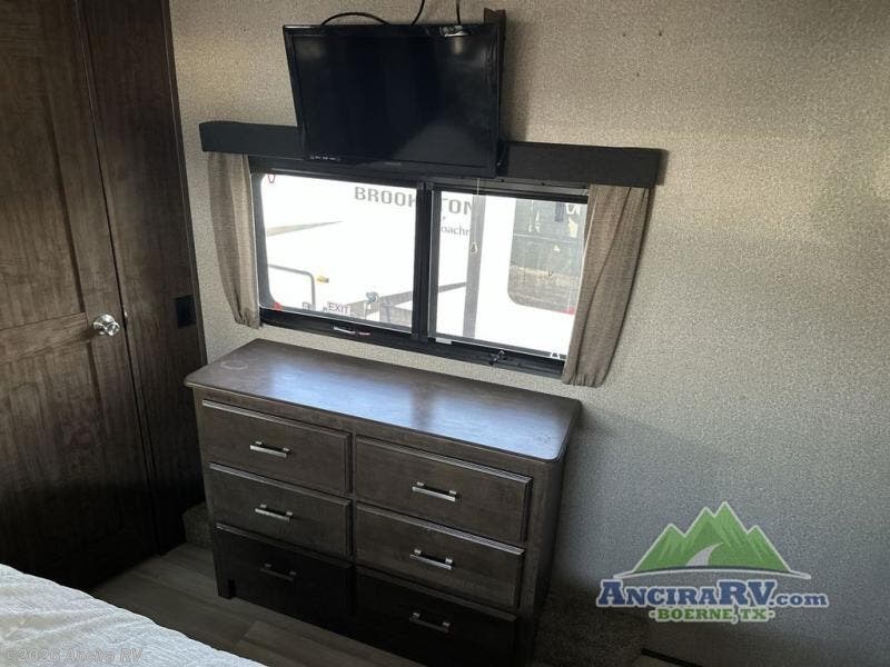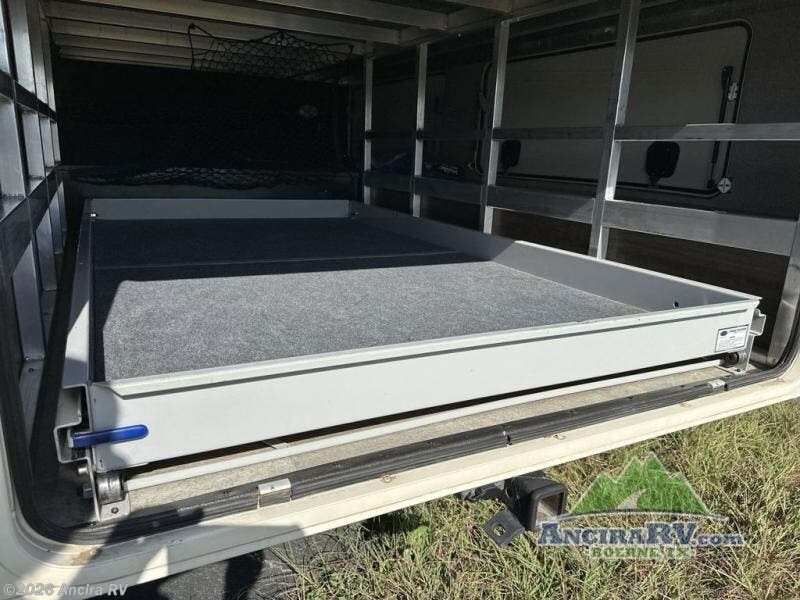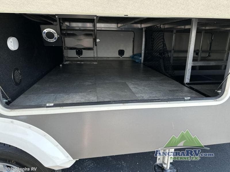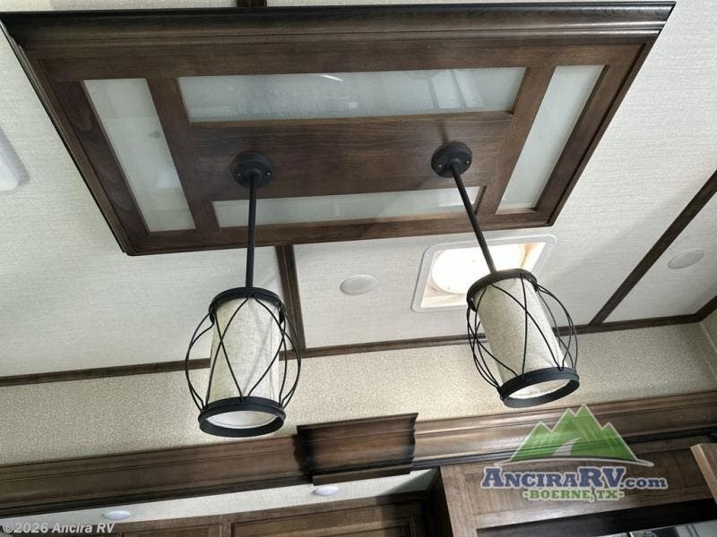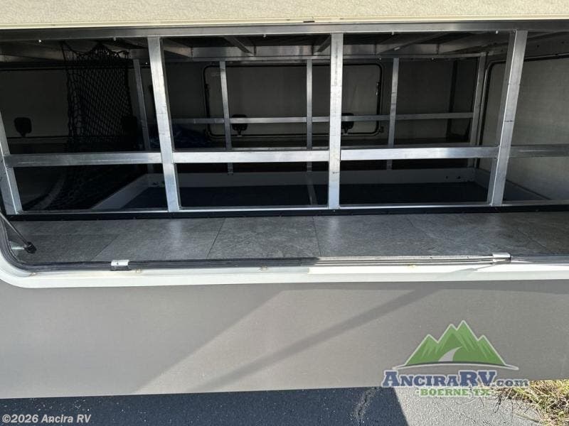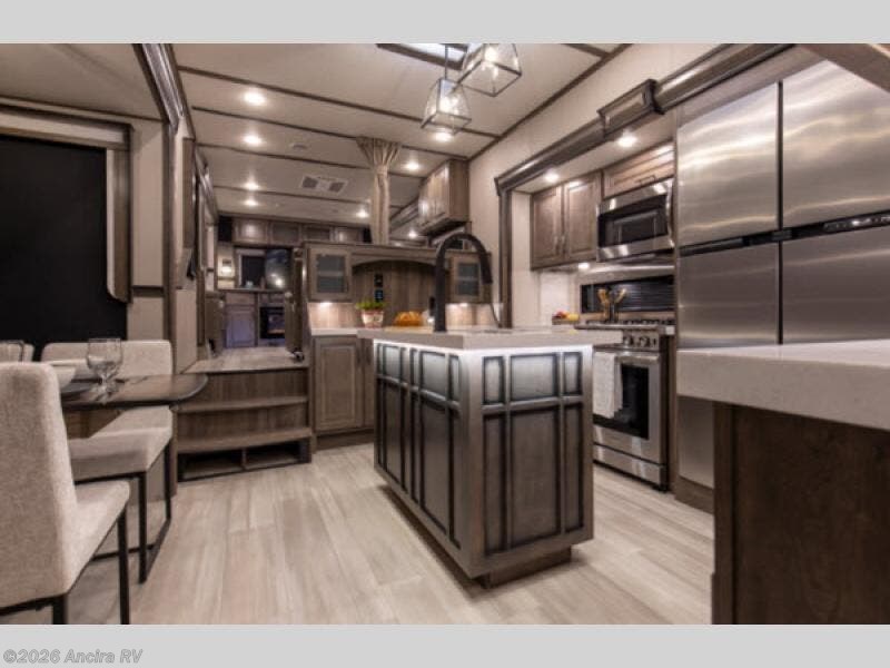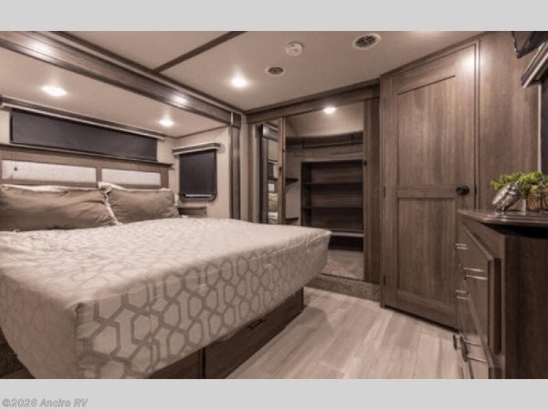 No worries about leaving anything behind with all the storage found throughout the interior and the exterior of this fifth wheel! From the bedroom closet and flip-up dresser, plus the overhead cabinets in the kitchen and separate living area to the exterior rear storage with a sliding tray and side access, there is a place for everything. Everyone can visit in the rear living area with an entertainment center, an LED TV, a fireplace and a window for great views while sitting on the dual tri-fold sofa slides and the theater seating. The buffet area can be utilized many ways, and the free-standing dinette offers a place to dine and play games. The kitchen offers full amenities including a hutch and oversized pantry. And you can stay refreshed with the full bathroom and get a good night's sleep on the queen bed slide or choose a king option.