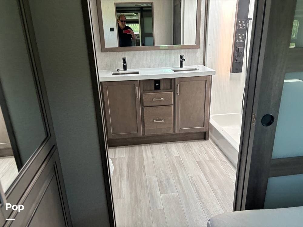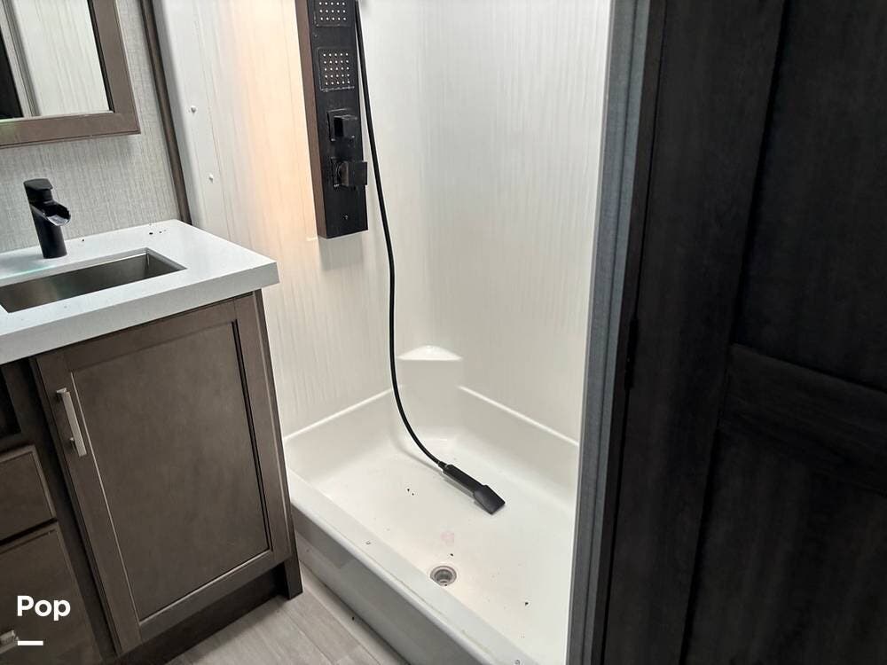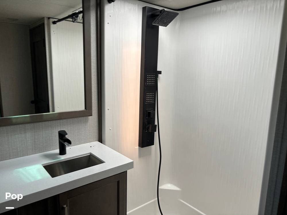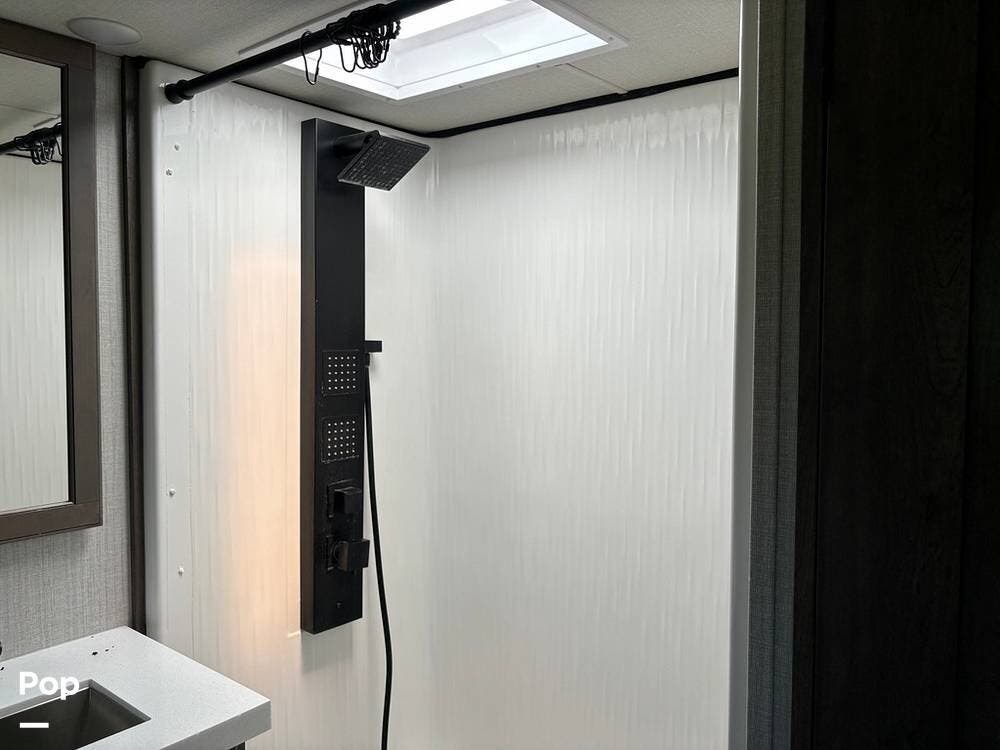 The bedroom is towards the RV's rear and features a king-size bed, a dresser, and a wardrobe. The bathroom is conveniently located adjacent to the bedroom and features a large shower, a porcelain toilet, and a vanity with a sink.