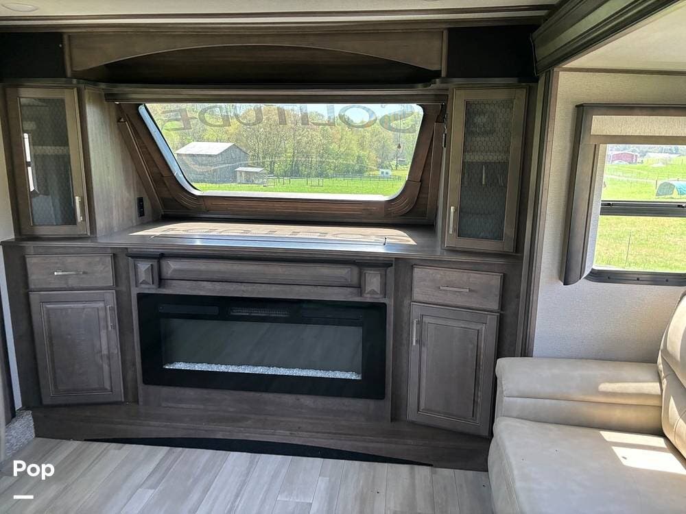 Inside, the Solitude 380FL is equally impressive. The front living area is spacious and comfortable, with a large sofa, theater seating, and a fireplace. There's also a big-screen TV on a televator with a soundbar, making it easy to enjoy your favorite movies or TV shows.