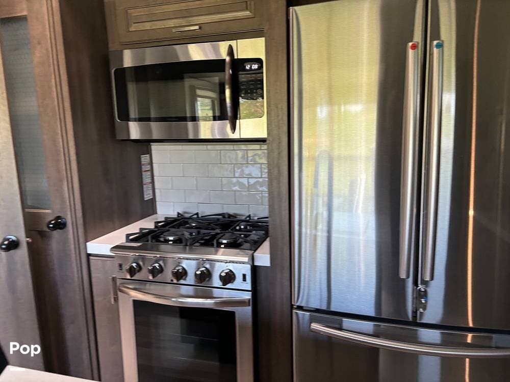The kitchen is well-equipped, with a residential refrigerator, a four-burner stove, an oven, and a microwave. The RV also has a pantry and ample storage space for all your cooking needs.