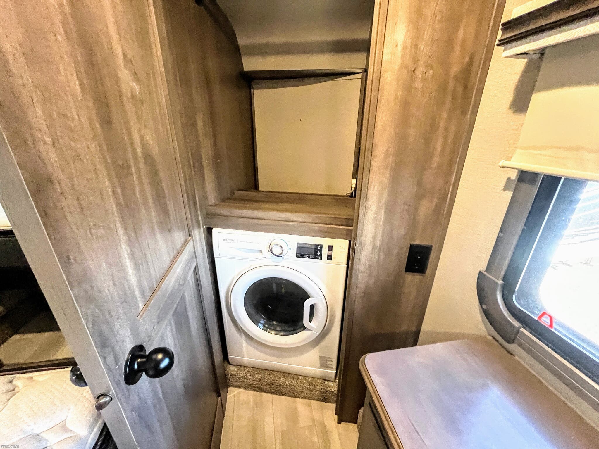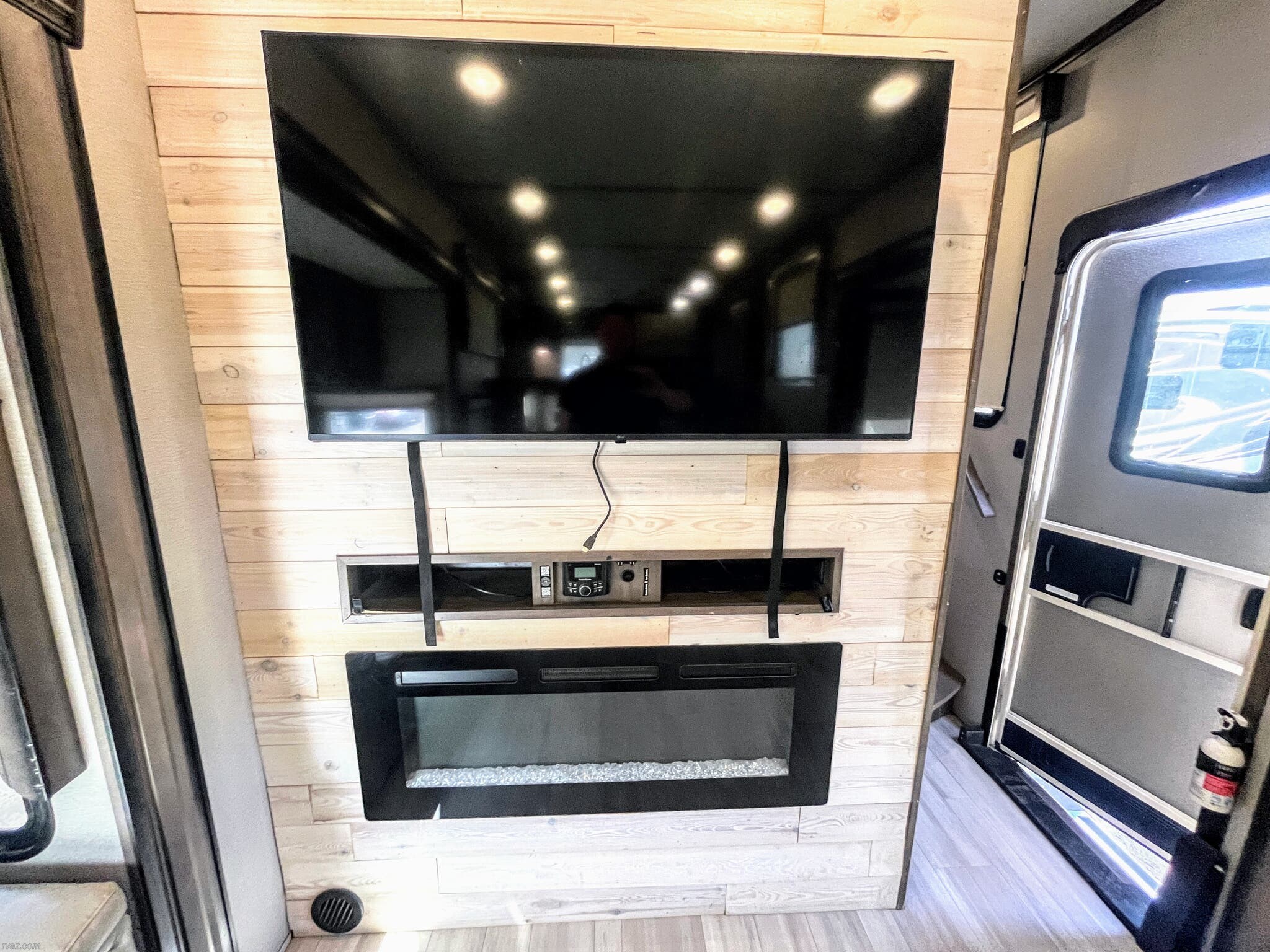 Stay cozy during chilly nights with the in-built fireplace or enjoy fresh air under the awning with exterior speakers. Added amenities like a washer and dryer connection, multiple slideouts, and a power roof vent enhance your overall experience.