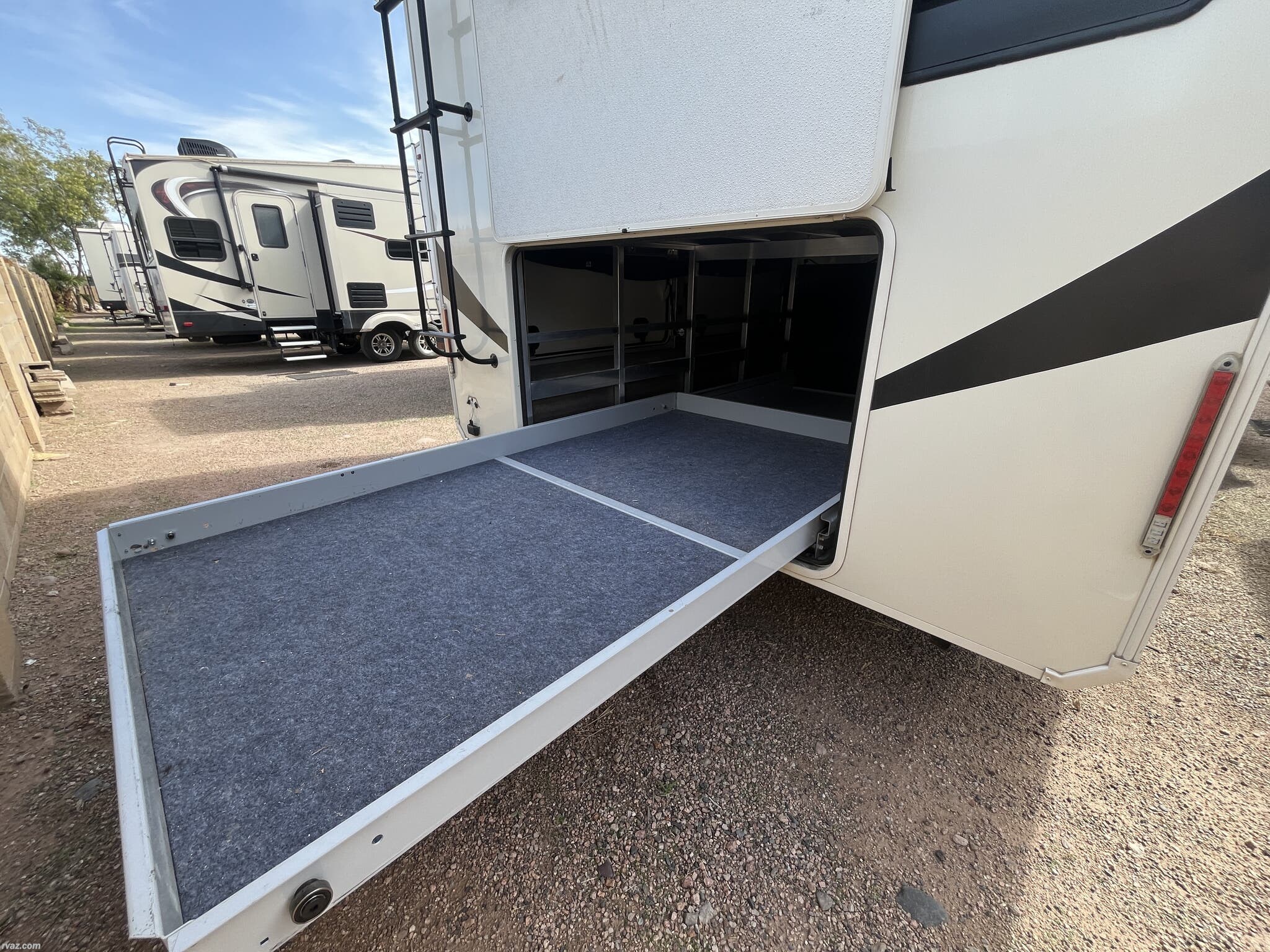 Automatic Leveling Jacks, Black Tank Flush, Detachable Power Cord, Enclosed Underbelly, Exterior Speakers, External Shower, Fiberglass Sidewalls, Heated Underbelly, Ladder, Pass Thru Storage, Power Awning, Power Roof Vent, Screen Door, Second Roof A/C, Skylight, Slideout, Spare Tire Kit, Tinted Windows -