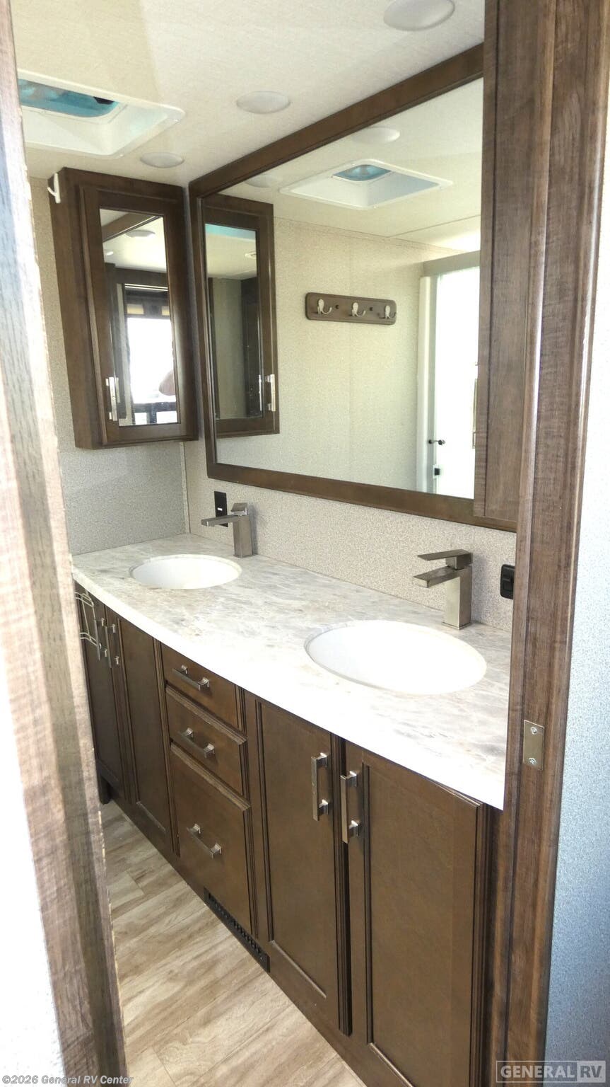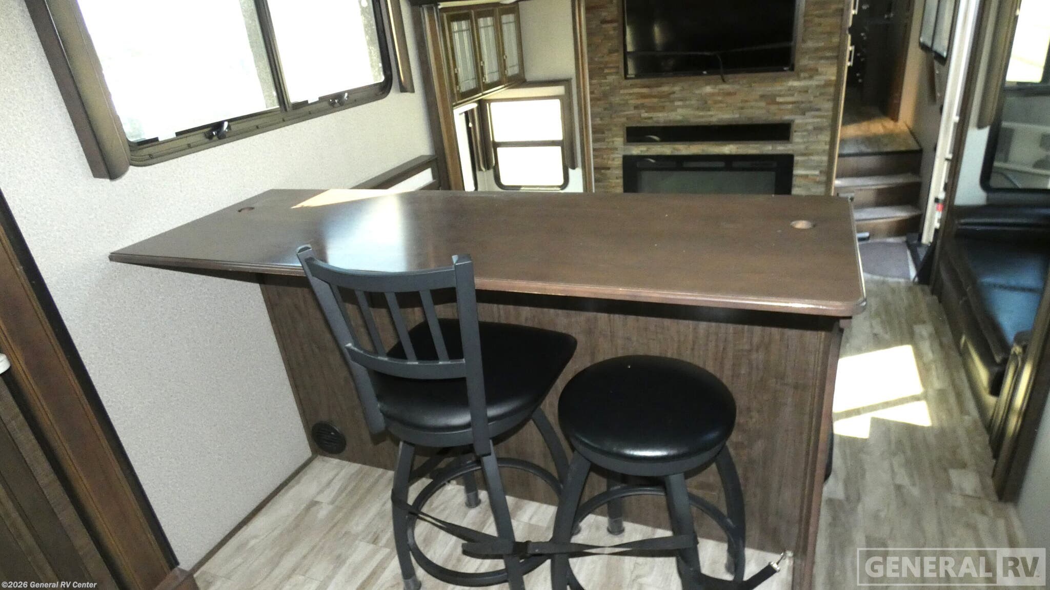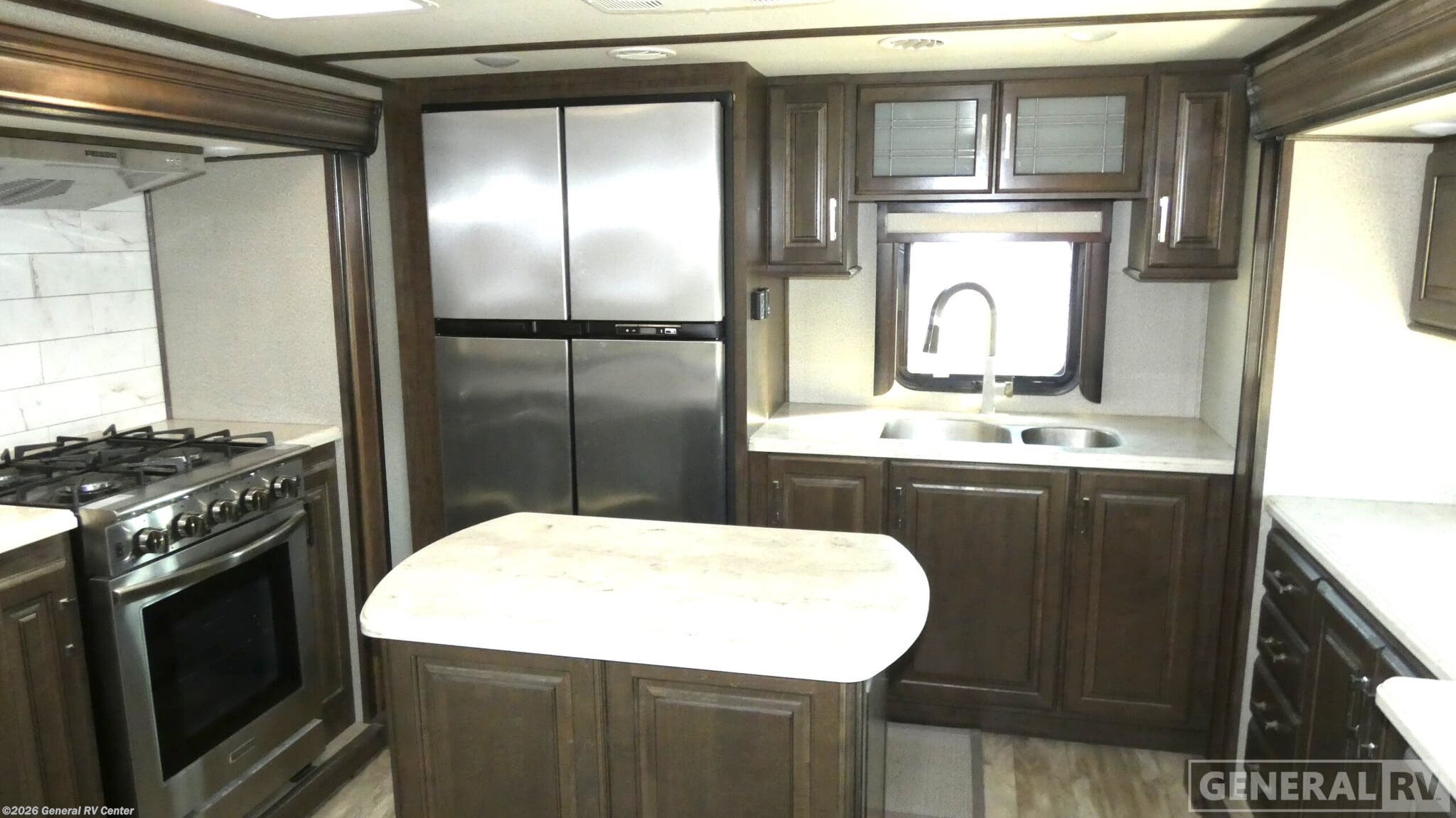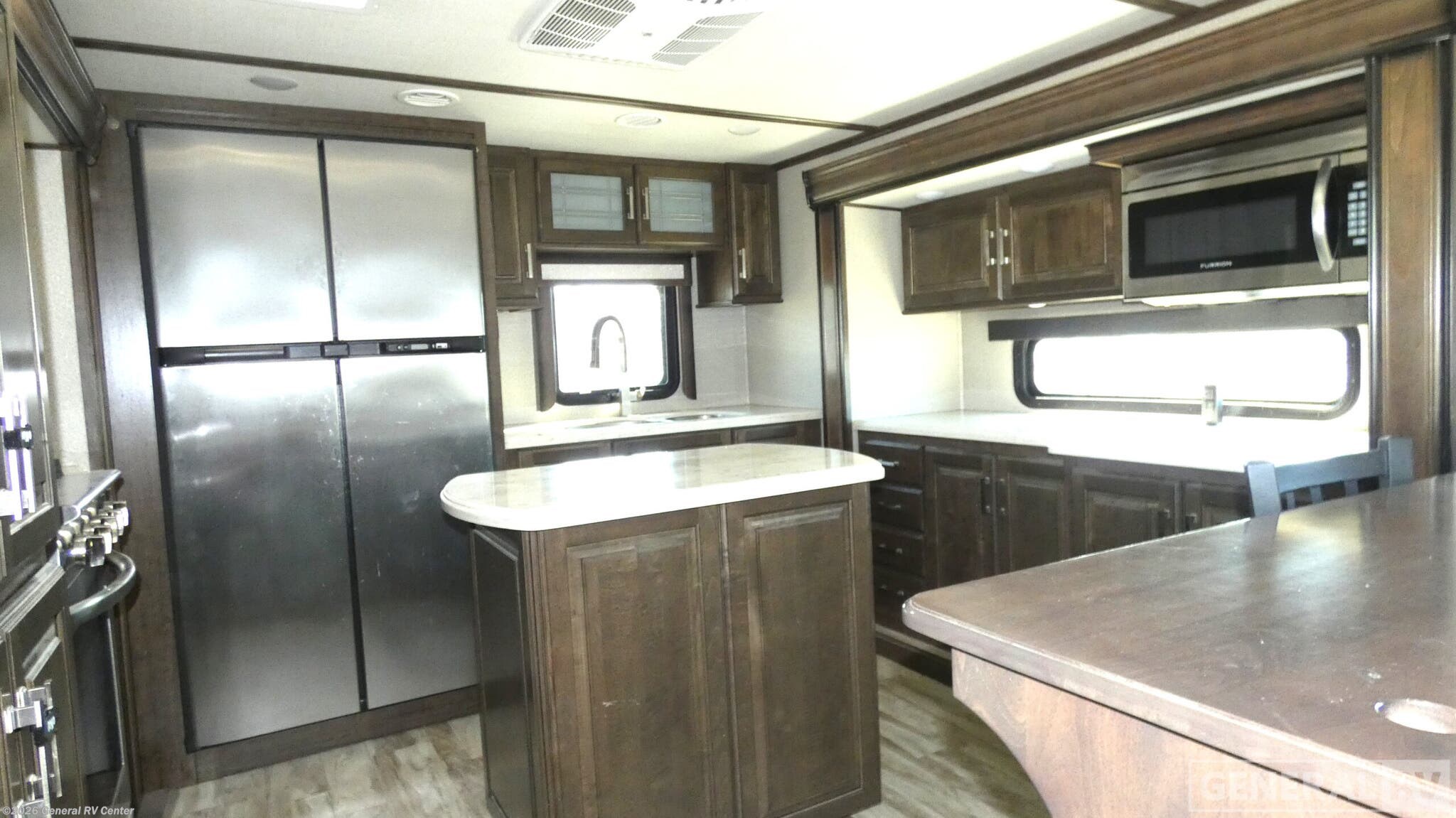 Experience luxury and comfort on the road with the 2021 Grand Design Solitude 390RK. This remarkable fifth wheel redefines what it means to travel in style. Measuring over 41 feet in length, this spacious RV is designed for families and groups, comfortably sleeping up to six with a variety of sleeping arrangements including a queen bed, king bed, and two convertible options. The rear kitchen layout is a culinary enthusiast's dream, featuring a full-size refrigerator and a generous pantry, ensuring you have everything you need to whip up delightful meals on the go. The Solitude 390RK offers an inviting center living area, perfect for relaxation and entertainment. With theater seating and tri-fold sofas, you'll have ample space to unwind after a day of adventure. The LED TV above the fireplace creates a cozy ambiance, making it a perfect spot for movie nights. The center bath is conveniently located and features a stylish plastic and glass shower. Up front, the master bedroom offers a serene retreat with a king or queen bed option, ample storage, and prep for a washer and dryer, adding a touch of home-like convenience. With its robust construction, including five slides and a 16-foot powered retractable awning, this RV is built for both comfort and durability. The impressive water capacities ensure you'll have plenty of resources for extended stays. Whether you're parked at a scenic campsite or exploring the open road, the Solitude 390RK is your ticket to an unforgettable journey. For more details or to see it in person, visit your nearest General RV dealership.