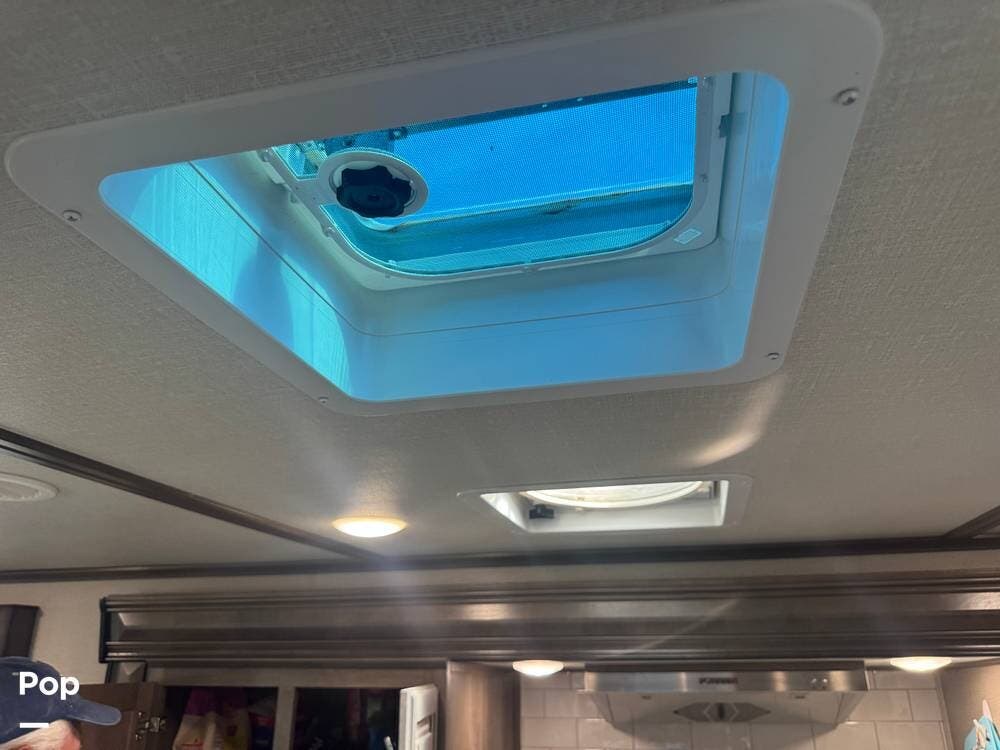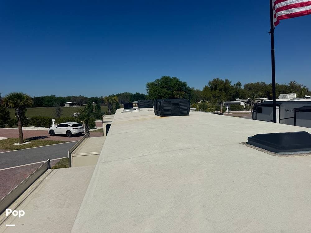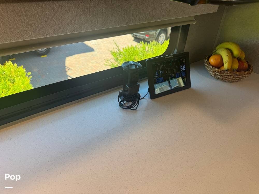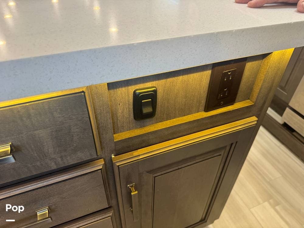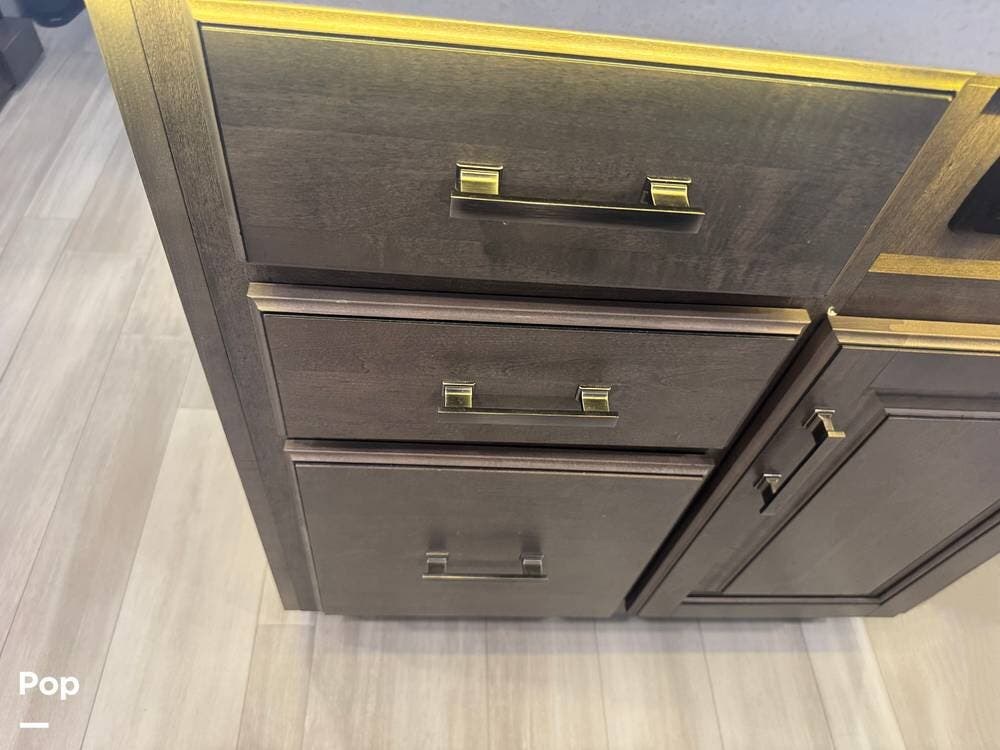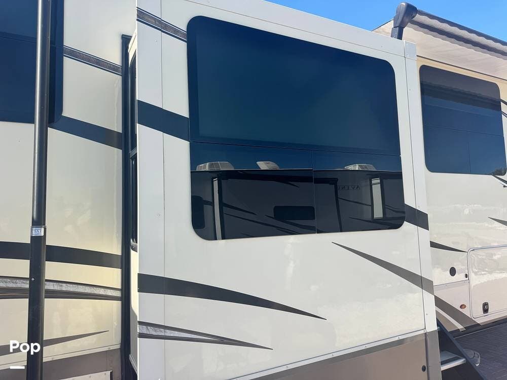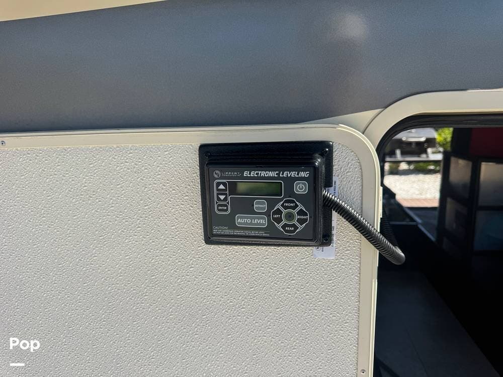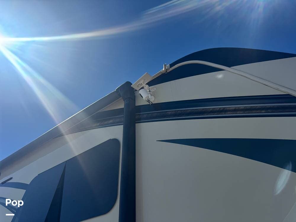 Additional highlights include a power leveling system & large power awning, exterior storage with pass-through compartments, and a full, outdoor kitchen setup. It also includes a 300-watt solar package, backup and side cameras, a home security system, and modern tech features.