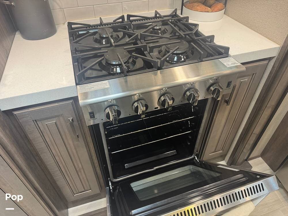 The spacious rear kitchen layout, elevated, has abundant counter space, a full-size residential refrigerator, a 4-burner stove, and tons of storage -- perfect for cooking like you're at home.