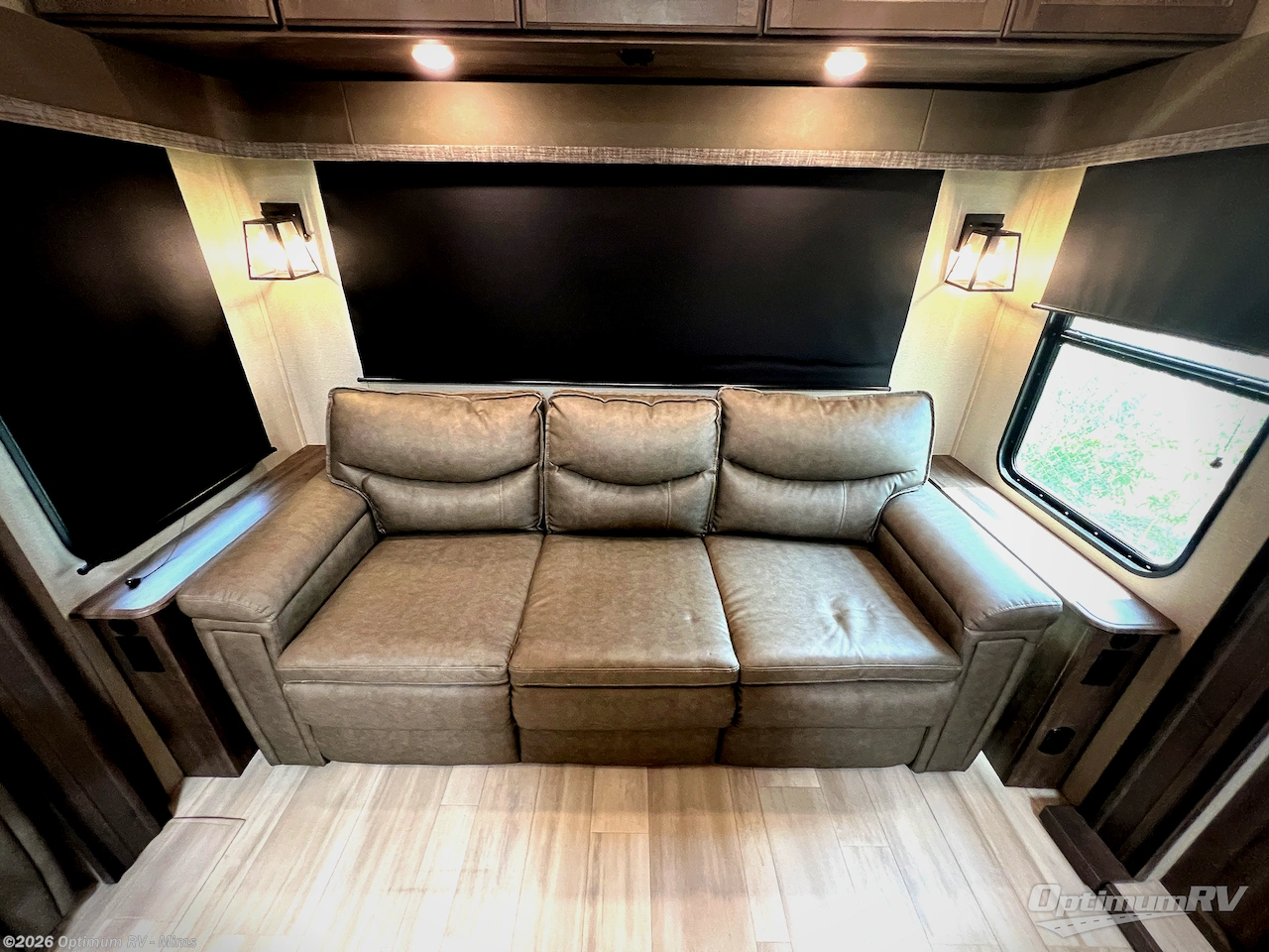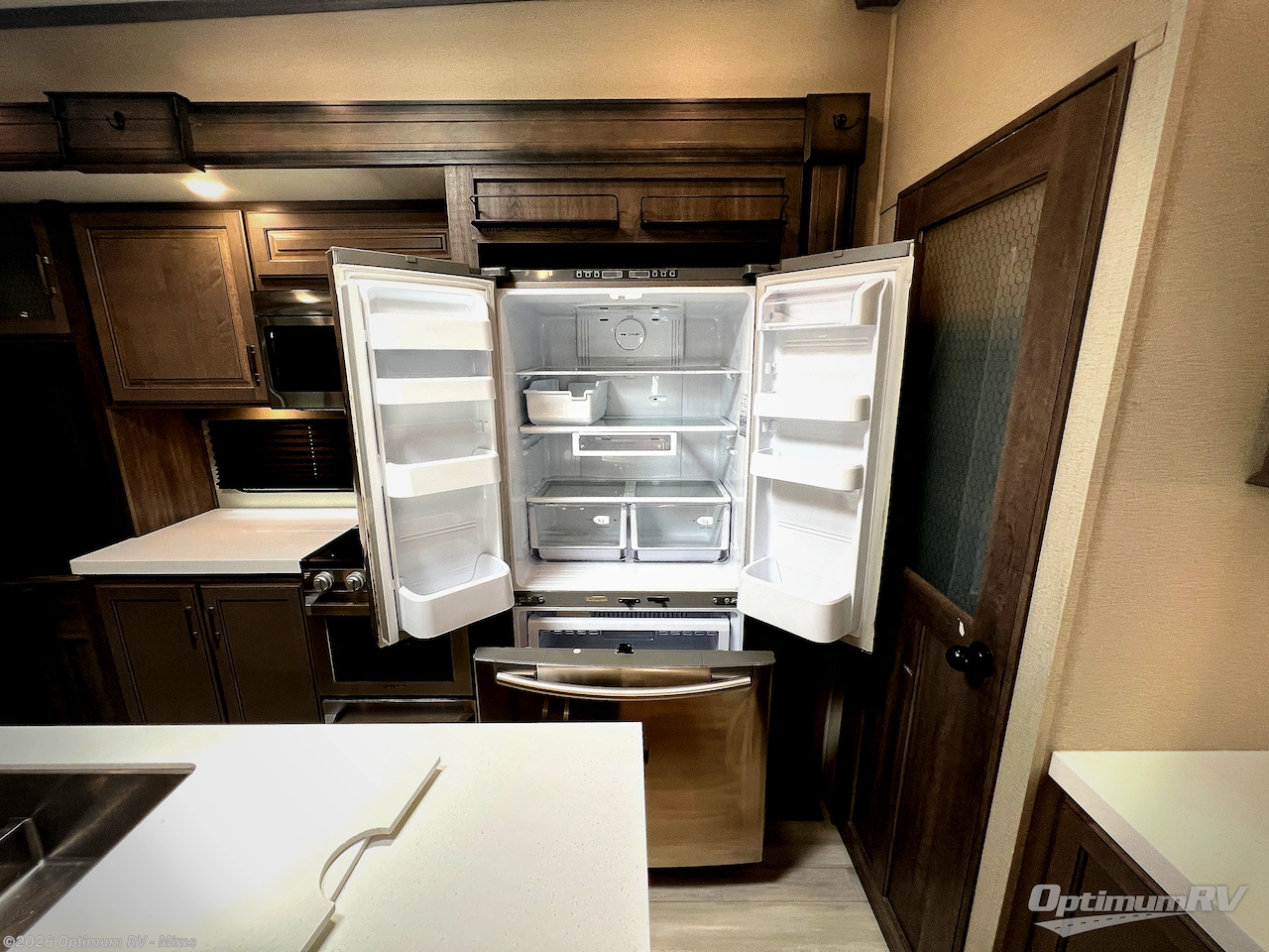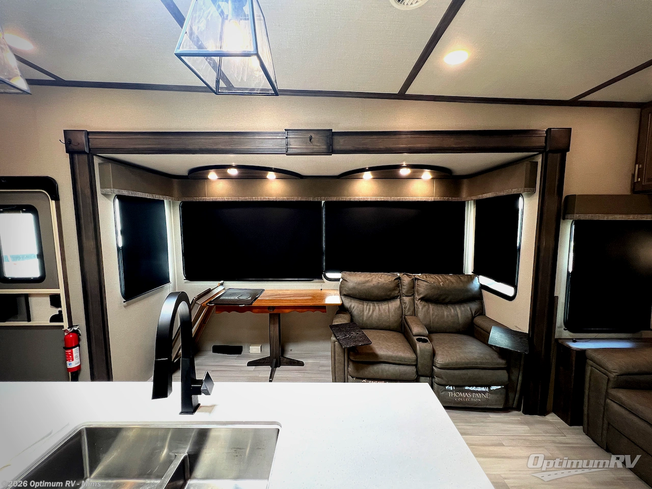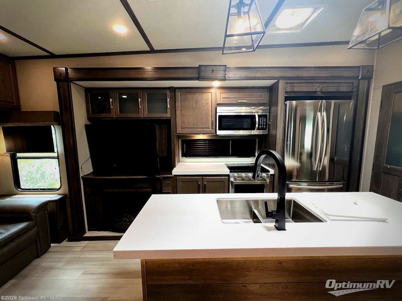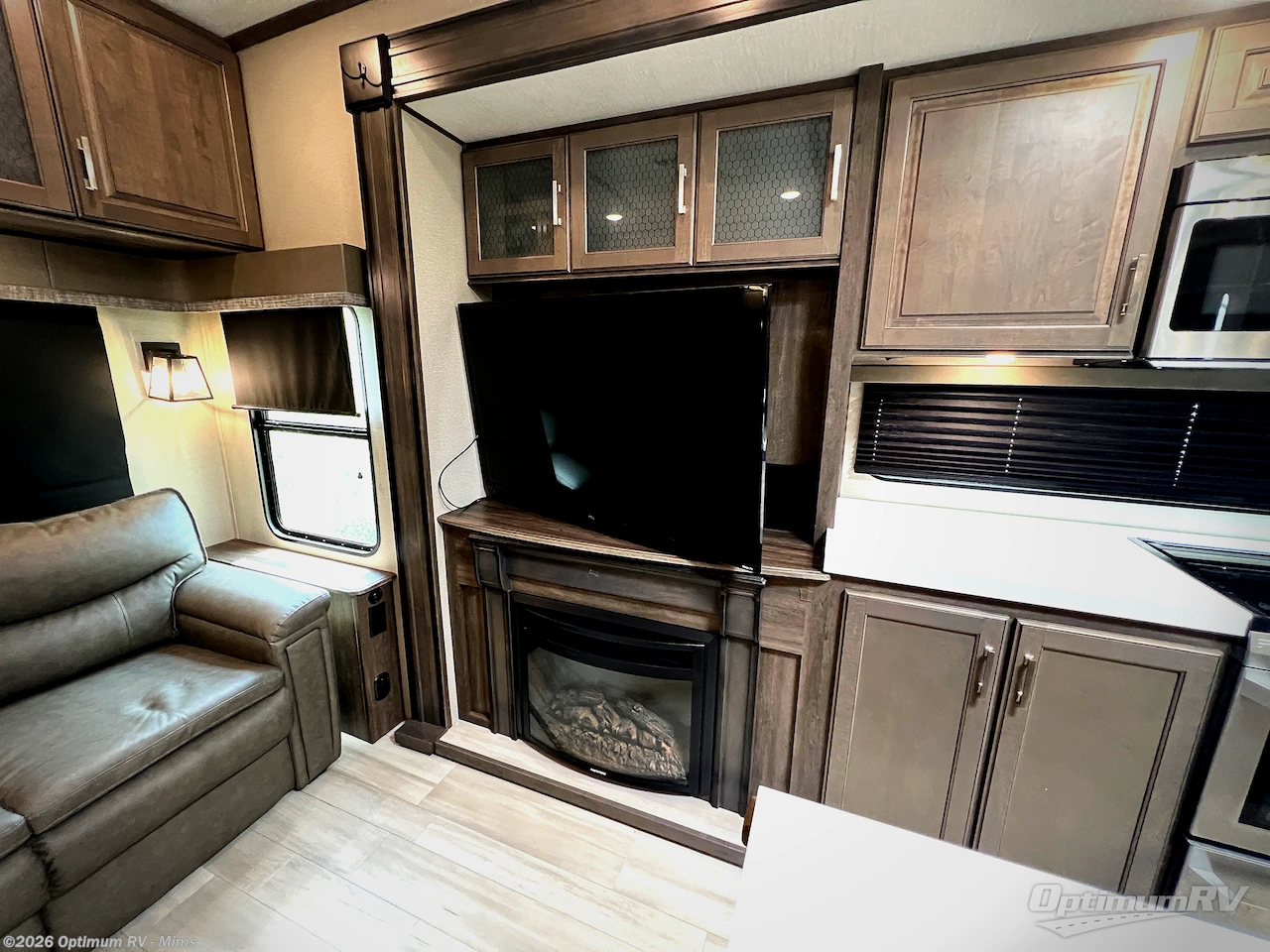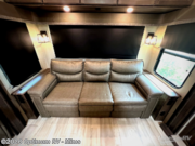 You and your spouse will love living in this fifth wheel with the master suite offering a walk-around queen bed with a king bed option, plus there is a 32" LED TV, and a slide out with a mirrored wardrobe and drawers plus a bathroom sink that stretches into the double-entry bathroom. The main living and kitchen area is spacious as well with two slides opening up the area around the kitchen island giving the cook plenty of space to make meals and you can relax on the theater seats, or the tri-fold sofa which offers sleeping space for guests. You can work or dine from the free-standing dinette while watching the LED Smart TV with fireplace below. And the oversized pantry as well as the hutch offers more storage for the food and picture frames. You might like to add a washer/dryer option if you don't want to use the appliances at the RV park, and there is a solar package option available.