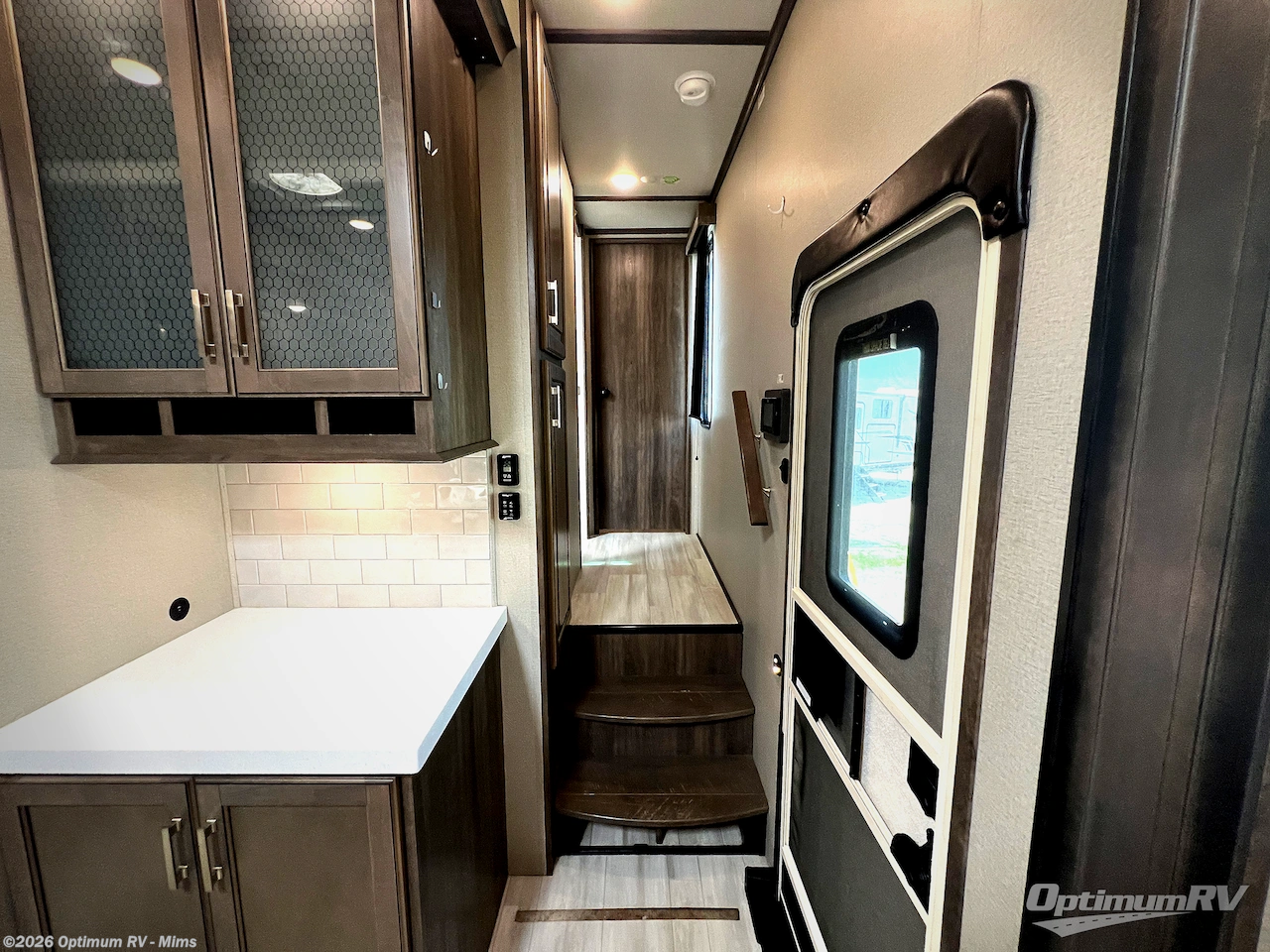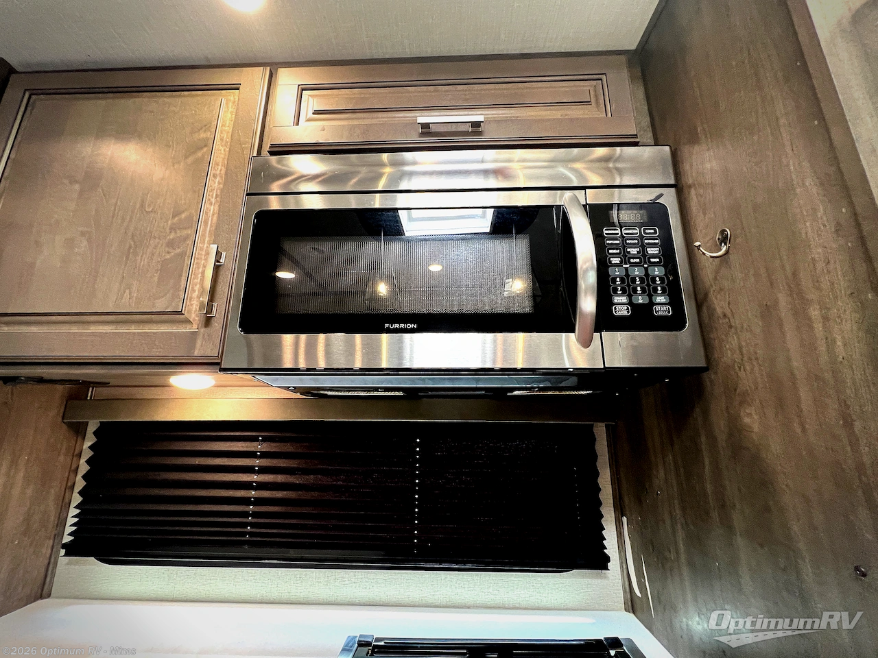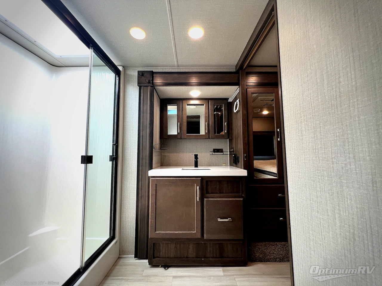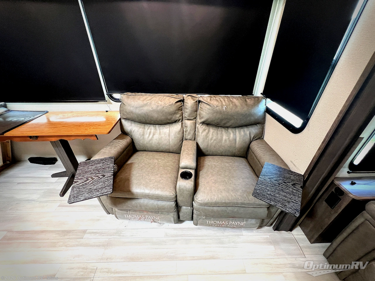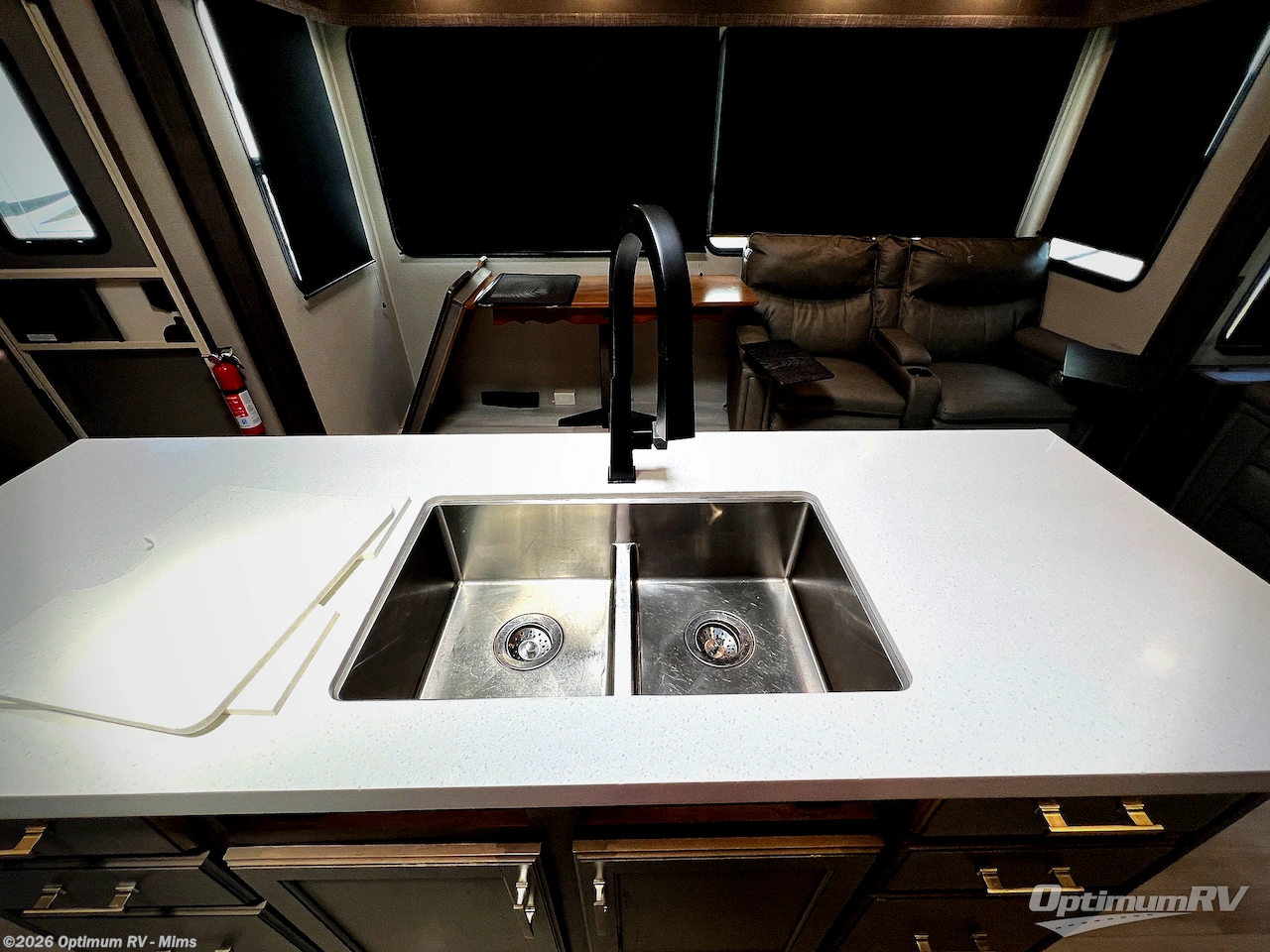 You and your spouse will love living in this fifth wheel with the master suite offering a walk-around queen bed with a king bed option, plus there is a 32" LED TV, and a slide out with a mirrored wardrobe and drawers plus a bathroom sink that stretches into the double-entry bathroom. The main living and kitchen area is spacious as well with two slides opening up the area around the kitchen island giving the cook plenty of space to make meals and you can relax on the theater seats, or the tri-fold sofa which offers sleeping space for guests. You can work or dine from the free-standing dinette while watching the LED Smart TV with fireplace below. And the oversized pantry as well as the hutch offers more storage for the food and picture frames. You might like to add a washer/dryer option if you don't want to use the appliances at the RV park, and there is a solar package option available.