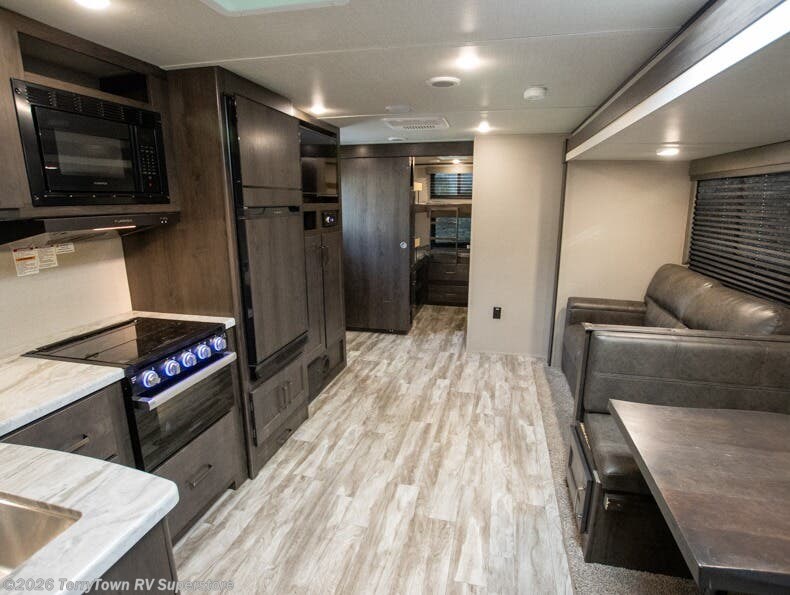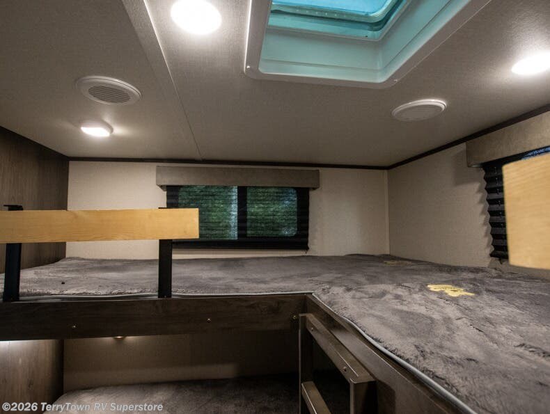 Whether you enjoy cooking indoors or outdoors, you will have the choice each meal with this Transcend Xplor travel trailer. The exterior offers an outside kitchen including a 1.6-cu. ft. outdoor refrigerator and LP quick connect, and the indoor kitchen includes full amenities along an L-shaped counter making it easy to make warm meals to feed the crew. Some may enjoy dining at the booth dinette and theatre seating within the large slide out while others may decide to relax under the 21' power awning outside. The private front bedroom offers the second entry door, plenty of storage, a queen bed, and easy access into the walk-through bathroom. The bunkhouse gives the kiddos their privacy, four bunks to choose from, drawers for storage, and a half bath for convenience.