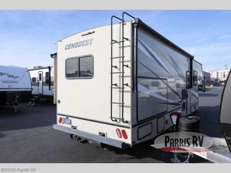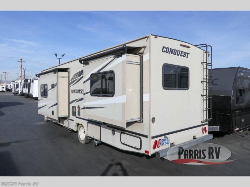 Imagine you and your family exploring new RV parks every chance you get off work with this Conquest Class C gas motorhome. The rear bedroom has a door that you can shut for privacy, and the separated bath has a sky dome above the shower for extra room to rinse off each morning. You can cook meals on the three-burner range and visit with other RVers while relaxing on the jackknife sofa.