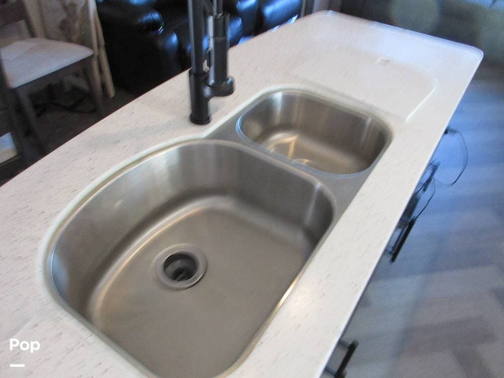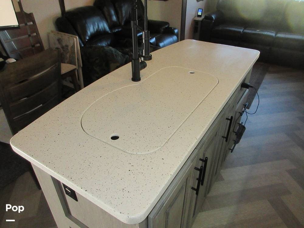 This Big Country 3702FB has three slide-outs for an open floorplan. A rear living area where you can relax on either the theater seating or the rear tri-fold sleeping sofa! A large TV over the fireplace. Also area with a desk and chairs next to the kitchen island that provides a large sink, extra storage and counter space to prepare home cooked meals.