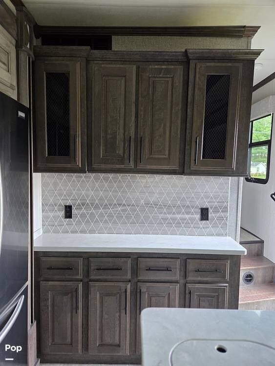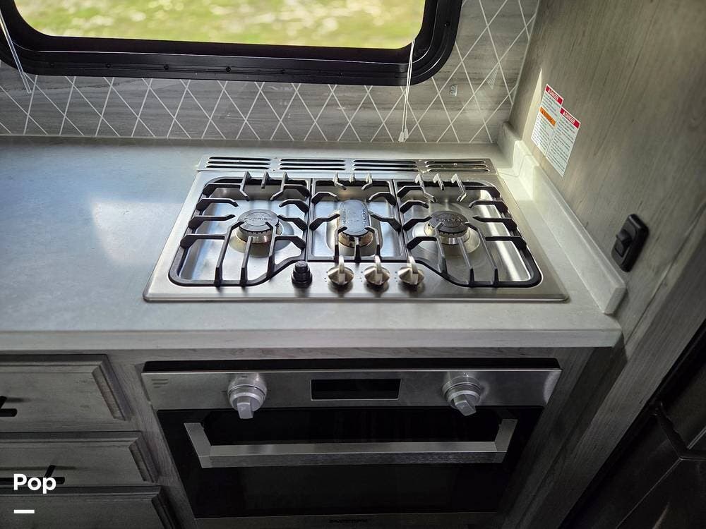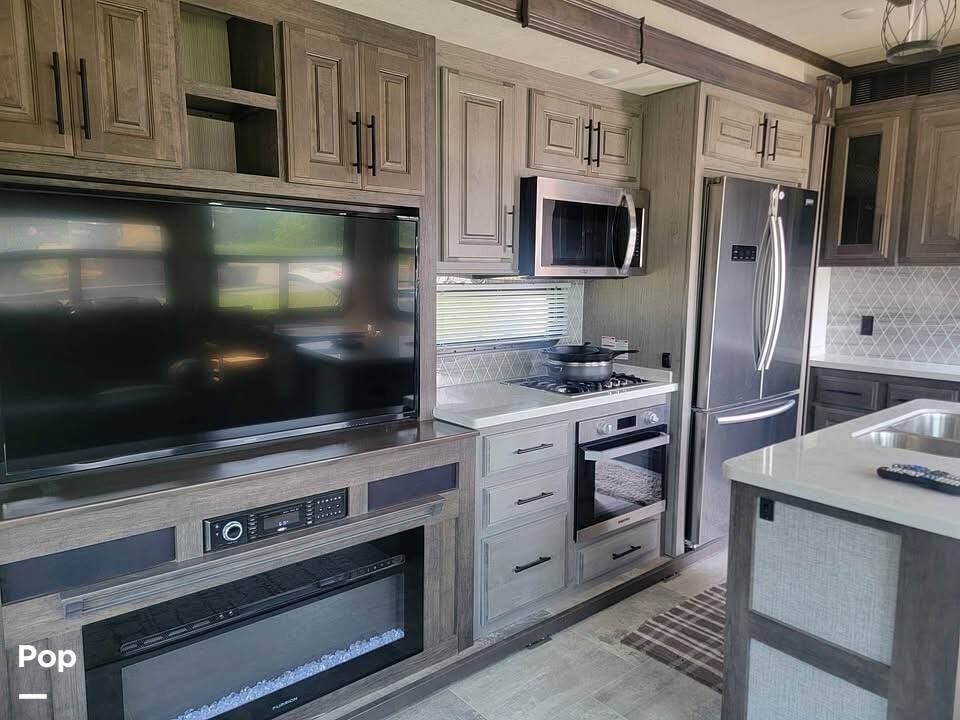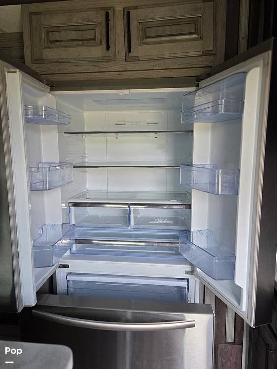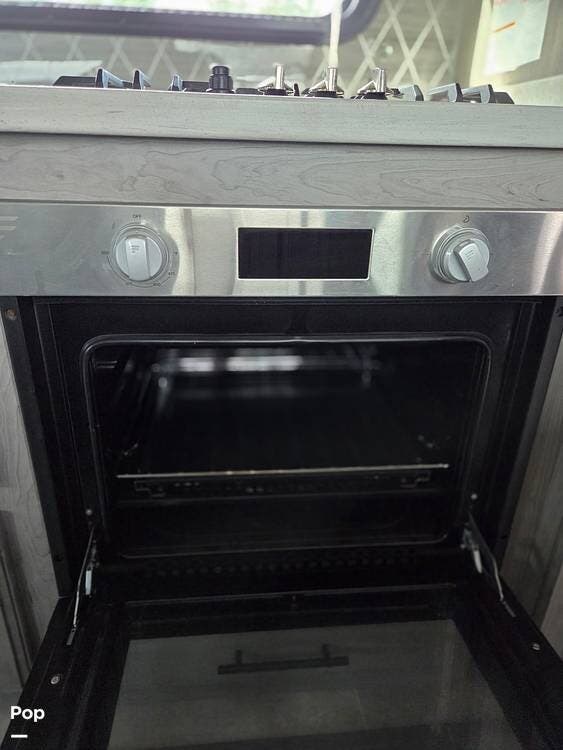 The kitchen area for those camping meals comes fully equipped with a stove with an oven, a convection microwave, and a full-sized electric double French door refrigerator/drawer freezer, allowing for extended stays in the "backwoods."