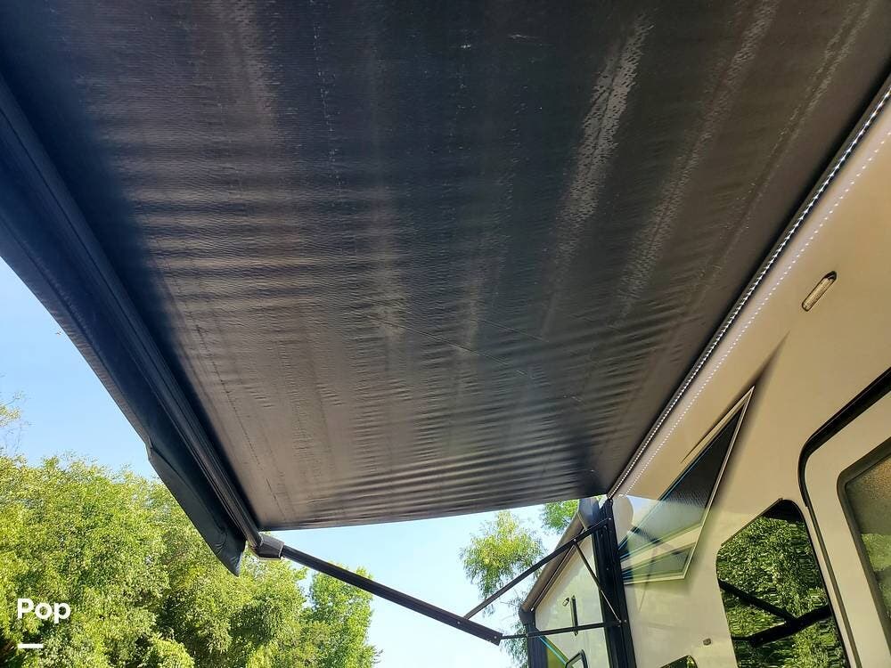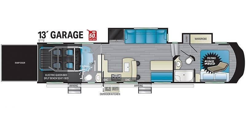 It's just big. This toy hauler is almost 45' long with lots of options for enjoying the outdoors. Two awnings shade the campsite side, and an awning in the back covers most of the gated raised patio.