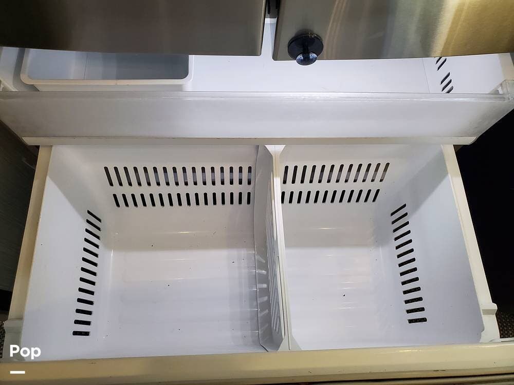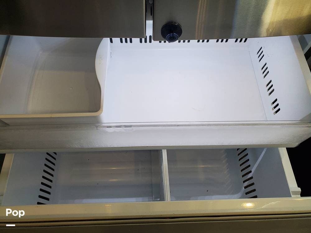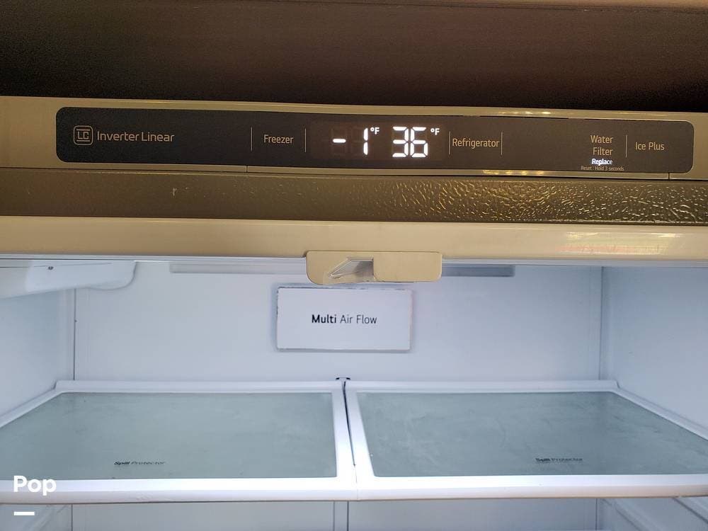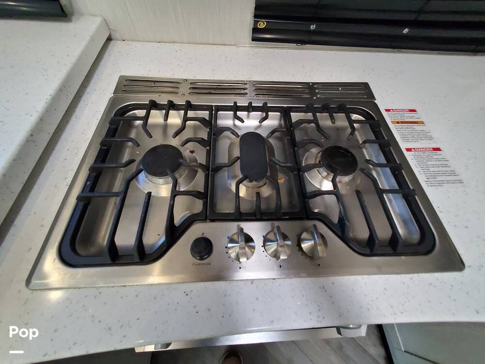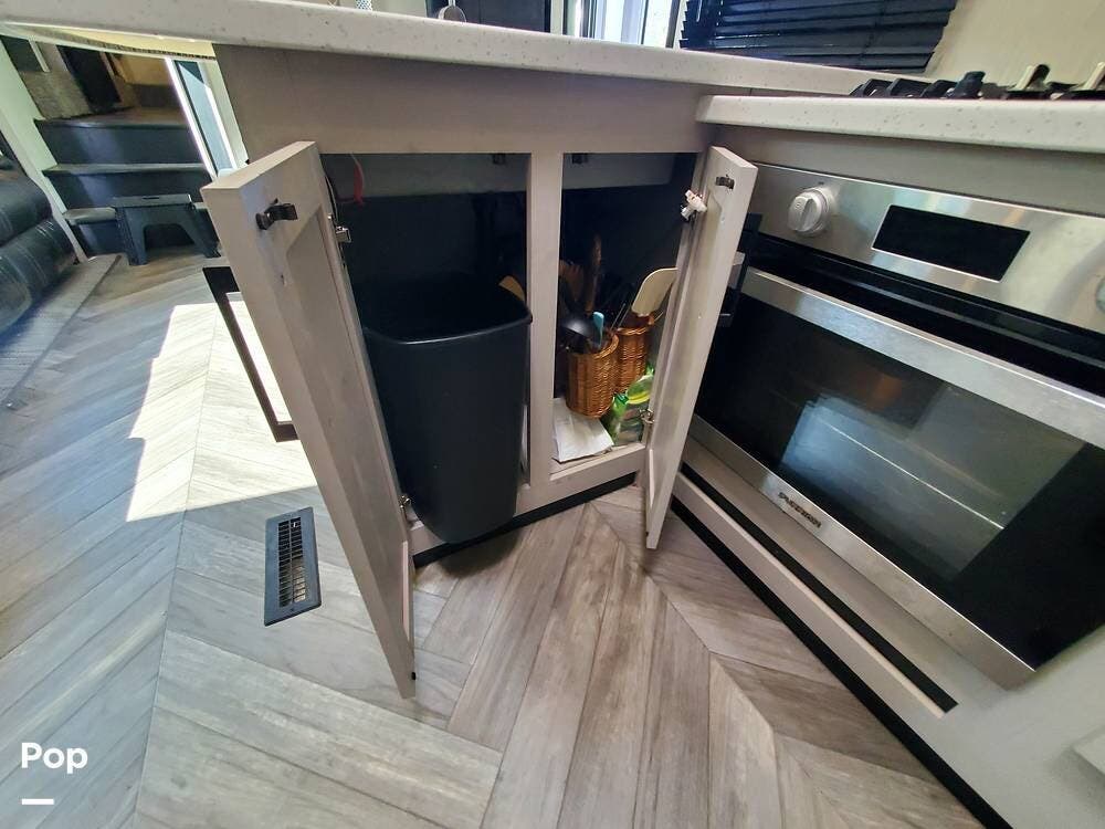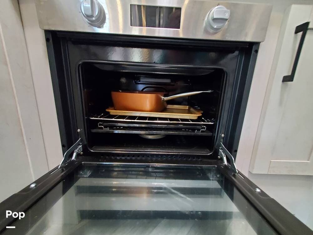 The kitchen has plenty of storage above and below the solid surface countertops. Farmhouse sink, large 3-burner cooktop, and unusually large oven support meal prep when you need to feed a full house. The residential refrigerator/freezer includes an icemaker... one less thing to do. The dinette seats six and includes a movable bench with storage underneath the hinged lid.