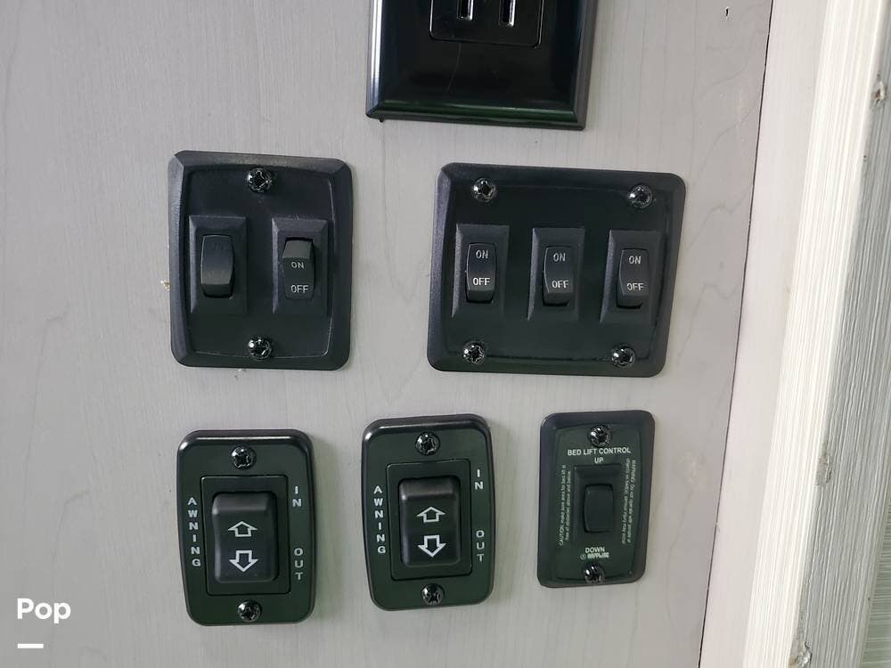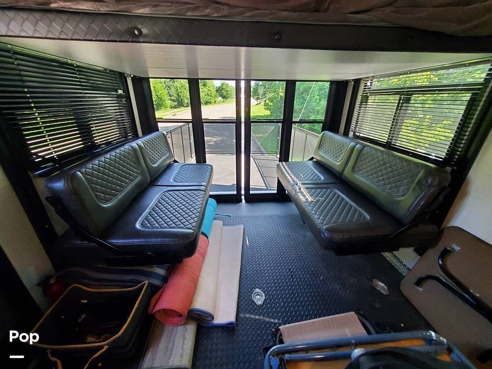 The garage is screened, featuring sliding glass doors that provide privacy, security, and air-conditioned comfort when needed. Yes, the garage has its own conditioner (and thermostat), plus a half-bath, access door, TV, and even a washer/dryer hookup. The elevated queen bed and bench seating lower electrically to provide seating and sleeping. Including the single bunk at the back, you can sleep up to 5 in the garage "bunkhouse".