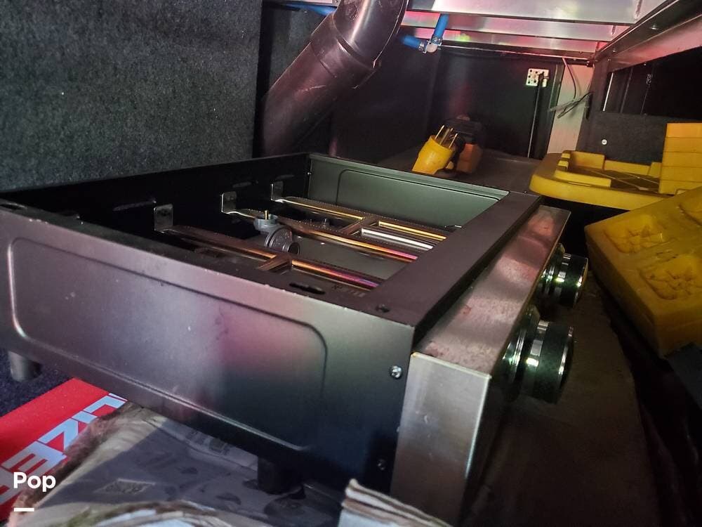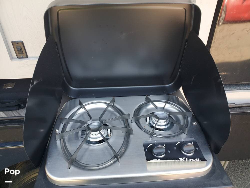 Of course, you'd probably rather cook outside at the outdoor kitchen. You'll have a mini-fridge with a freezer at hand, next to the propane cooktop with a windscreen. Stored to the left is a flatscreen TV, in case the chef's posse needs to be entertained while vittles are in the making. The adjacent spray port makes it convenient to hose things off before packing them away.