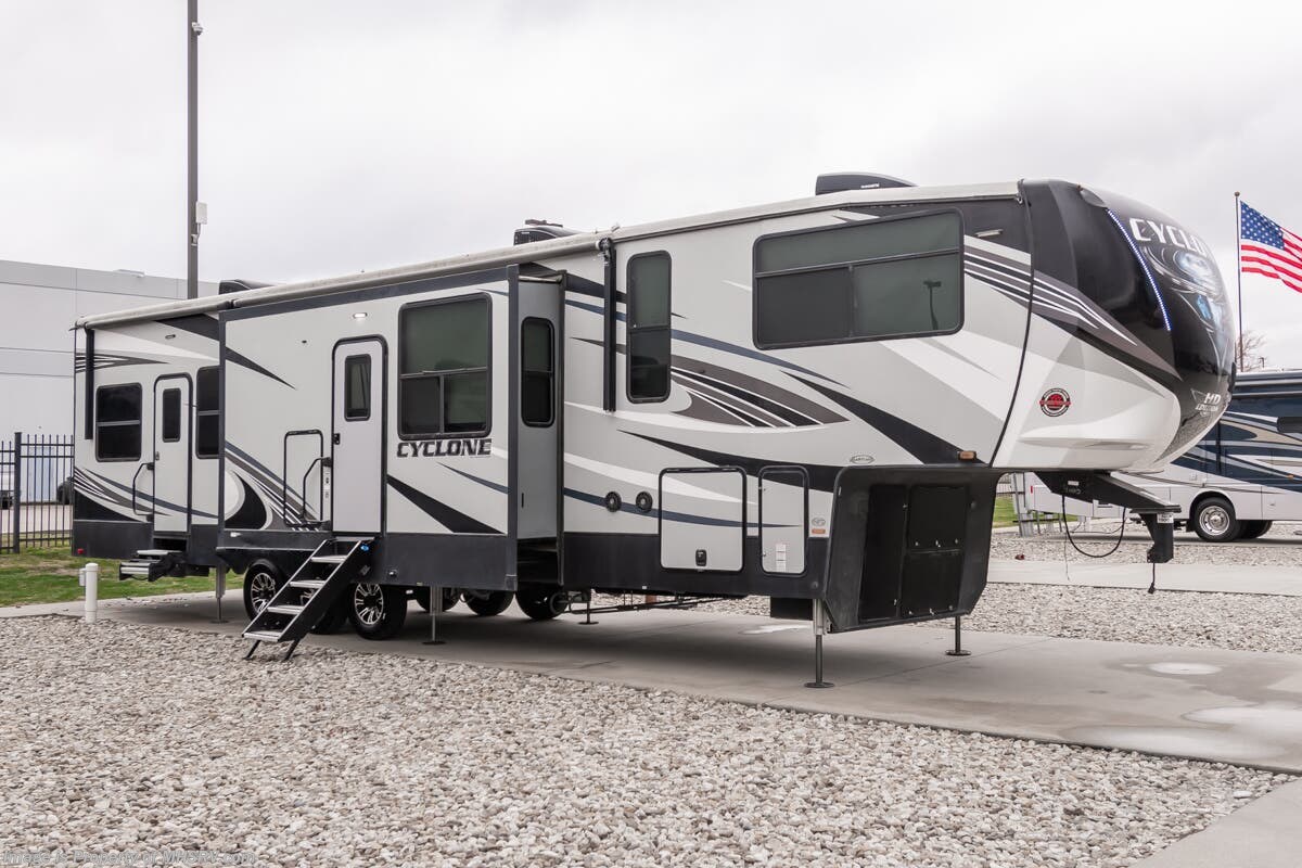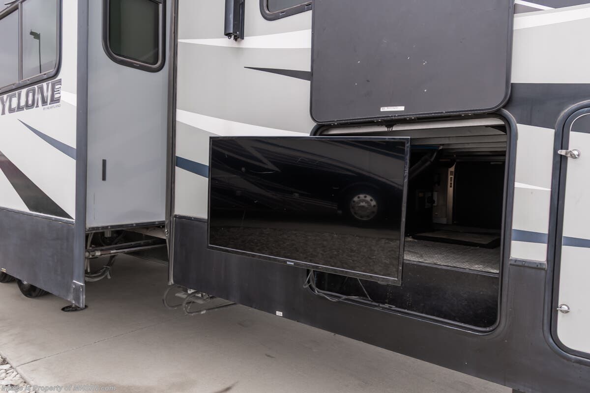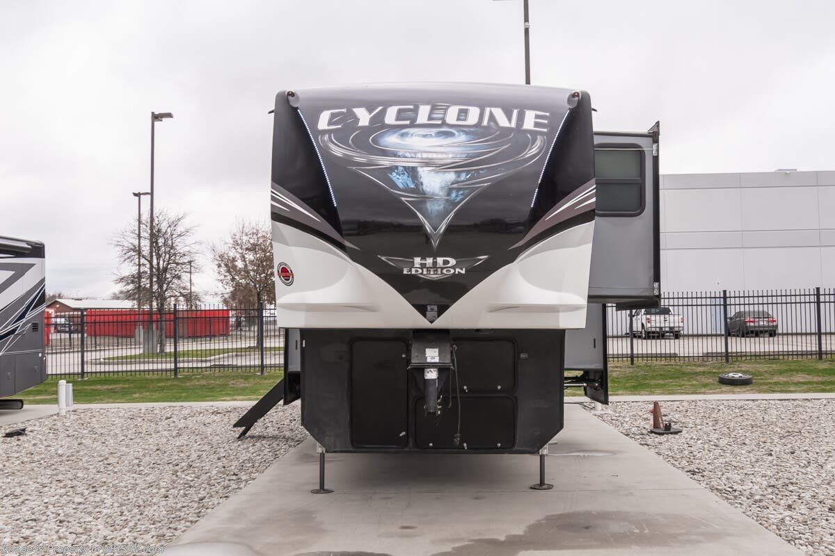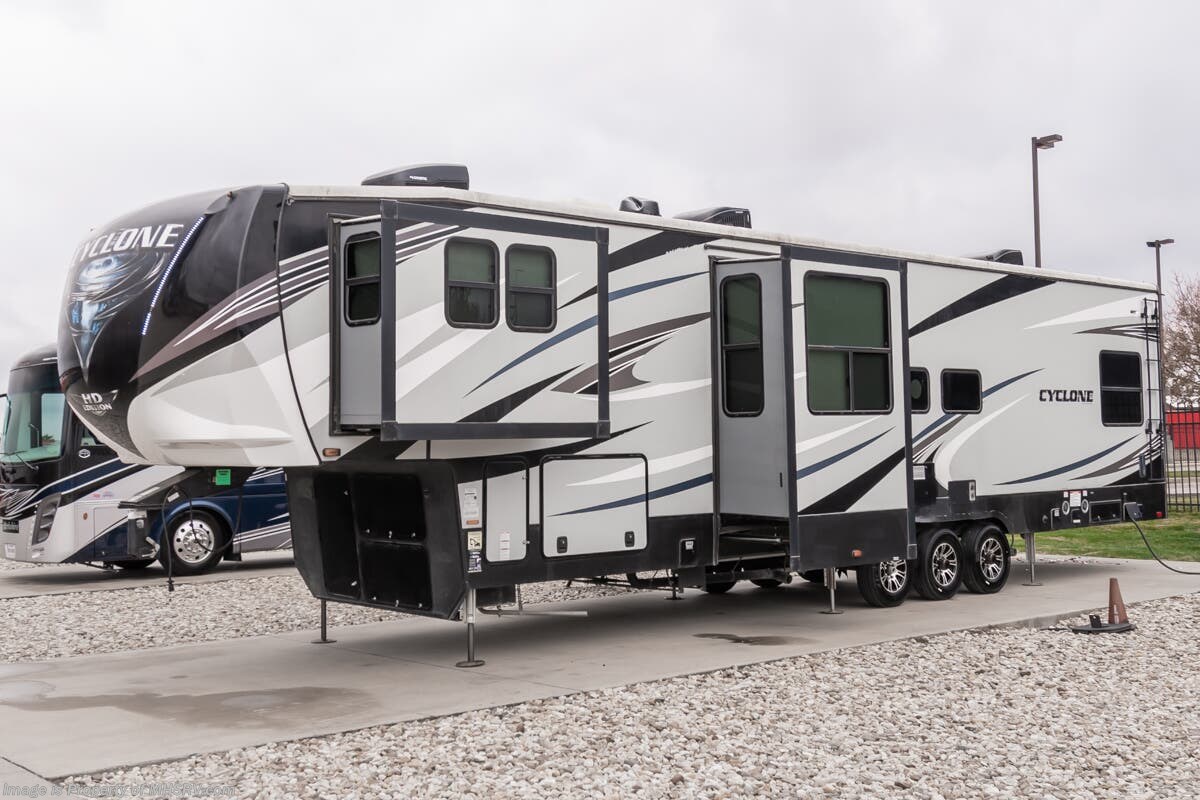 Used Heartland 5th Wheel for sale – 2021 Heartland Cyclone 4006 is approximately 45’ 0” feet in length, 3 slides and features Lippert Hydraulic leveling system, aluminum wheels, 3 A/C's, patio awning, door awning, pass through storage, baggage door side swing, black tank flush, water filtration system, power electrical reel, exterior shower, exterior TV, ladder, inverter, all electric coach, leather seating, washer/dryer, central vacuum, fireplace, multi-plex control panel, convection microwave, residential refrigerator, 3 burner gas range with oven and much more. For more details on this unit, our full inventory, brochures, window stickers, videos, photos, and customer reviews, visit or call 800-335-6054 for the Texas location or 334-288-0331 for our Alabama location. At Motor Home Specialist, we DO NOT charge any prep or orientation fees like you will find at other dealerships. Read Thousands upon Thousands of 5-Star Reviews at and See What They Had to Say About Their Experience at Motor Home Specialist. WHY PAY MORE? WHY SETTLE FOR LESS?