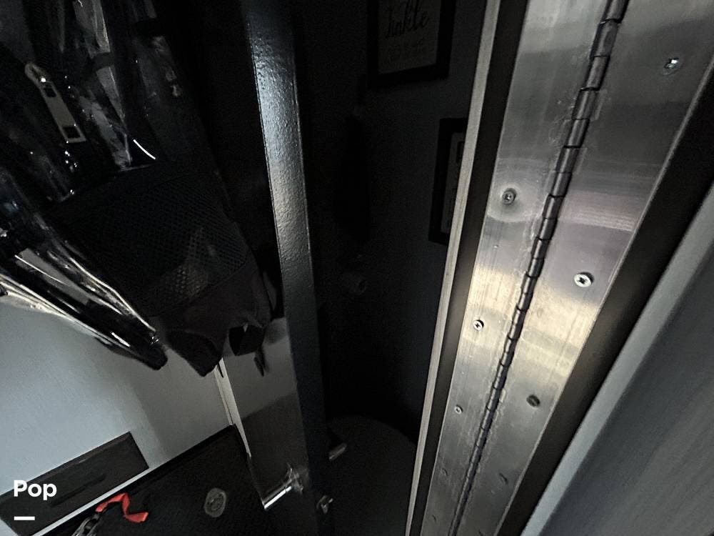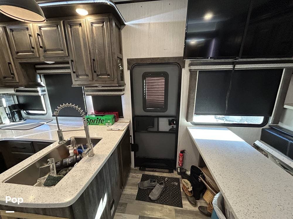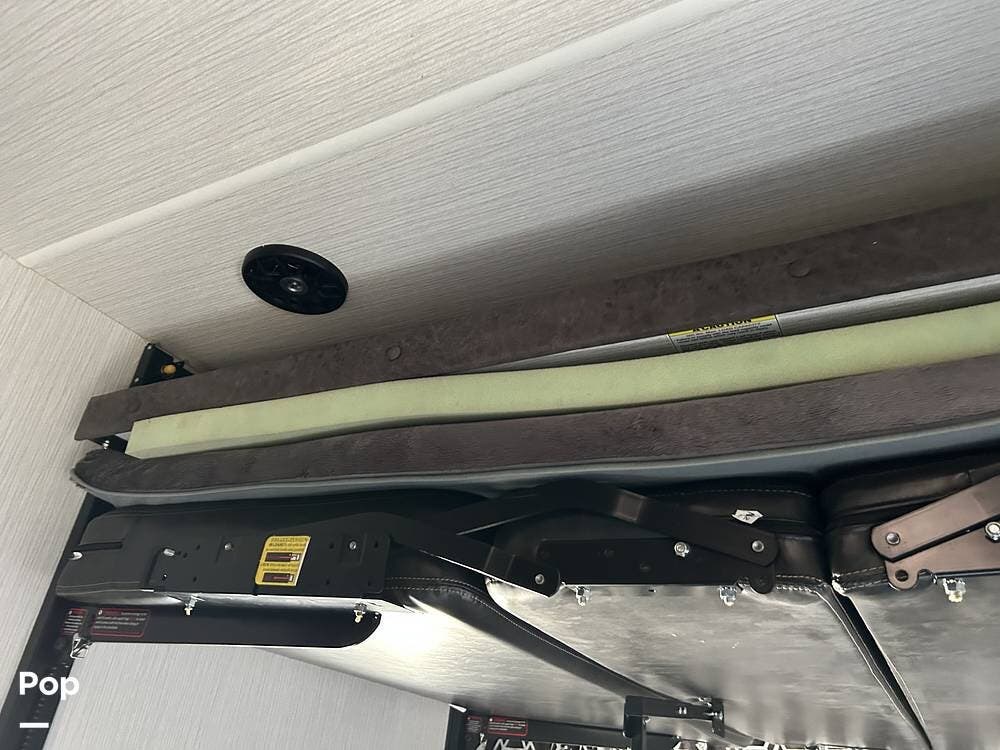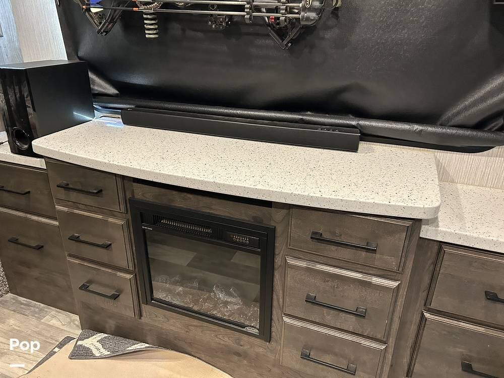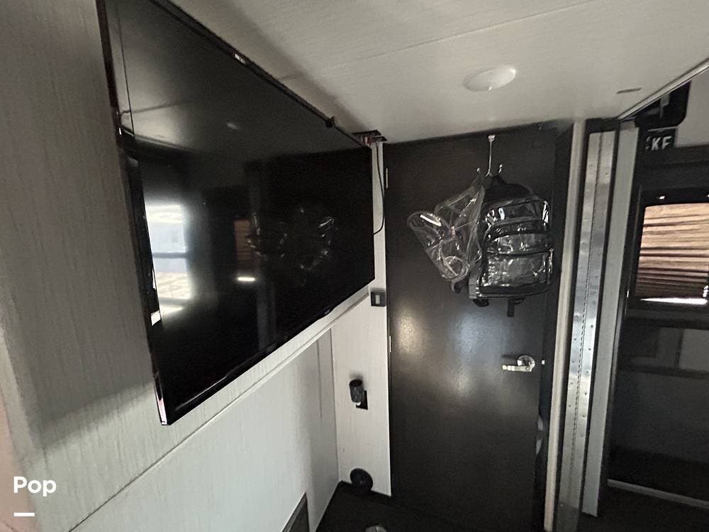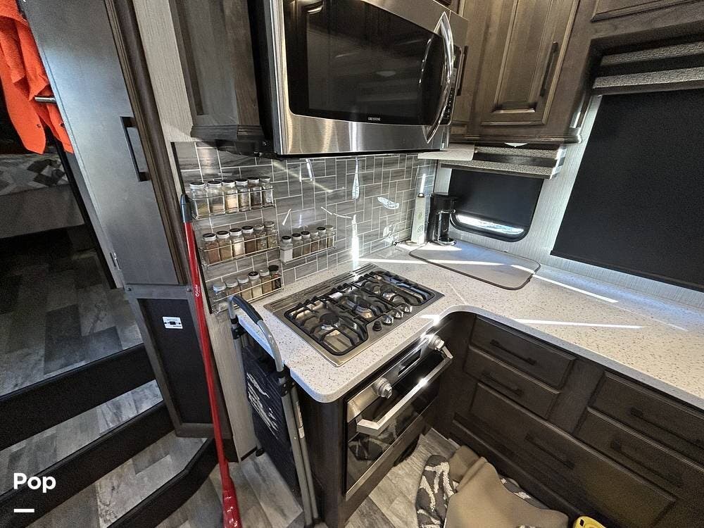 On the exterior, the unit features a fully equipped outdoor kitchen, perfect for cooking and dining outside while enjoying the company of friends and family. The half bath in the garage adds extra convenience, allowing those in the back of the RV to have easy access to a bathroom without entering the main living area.