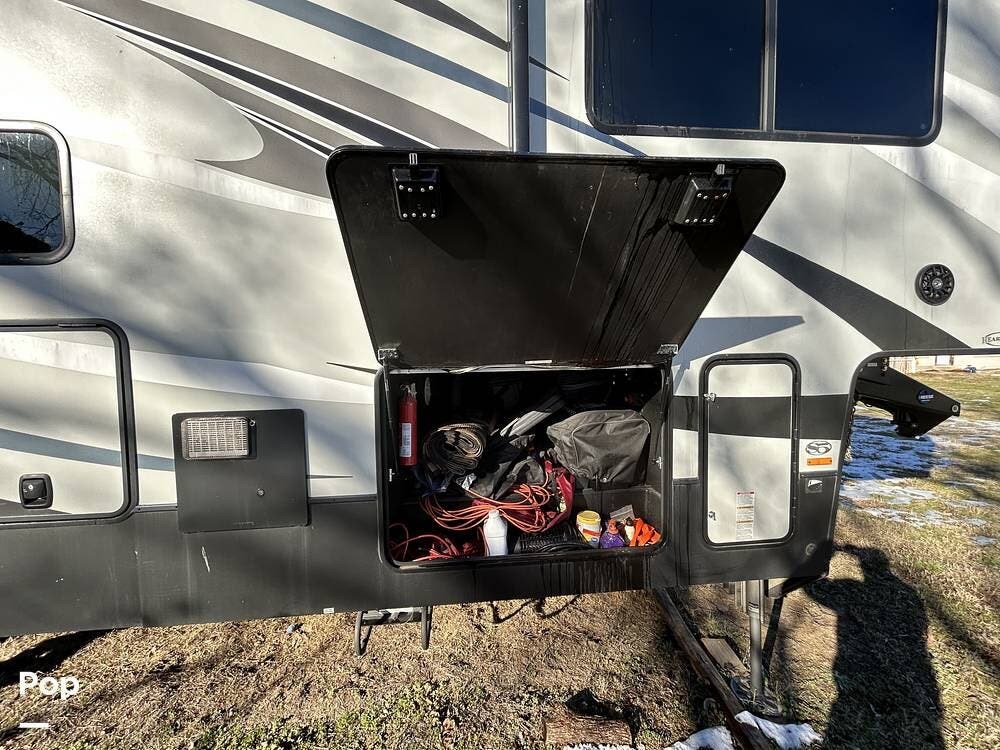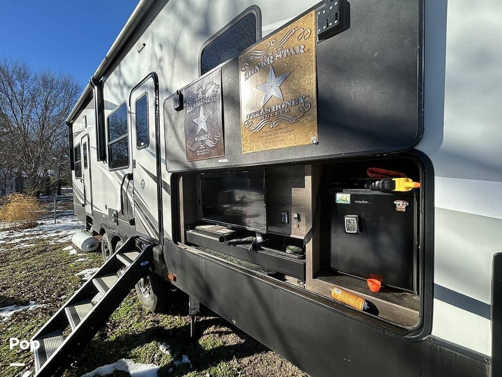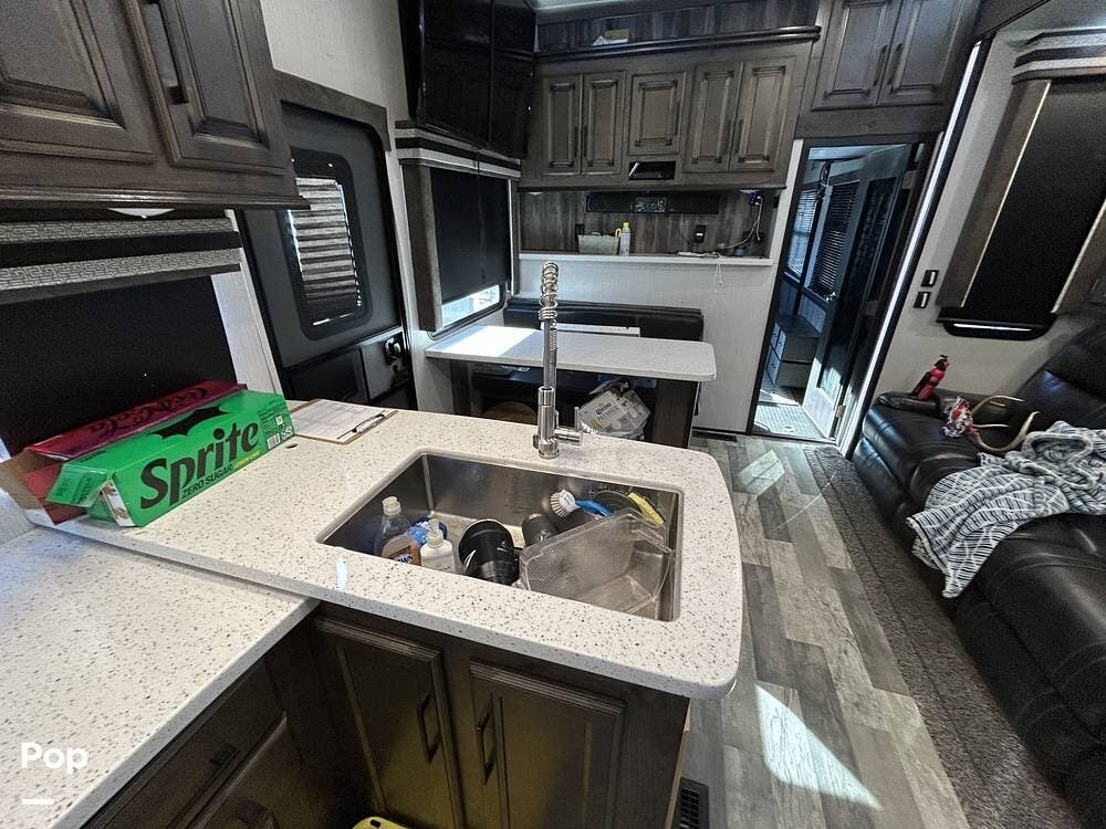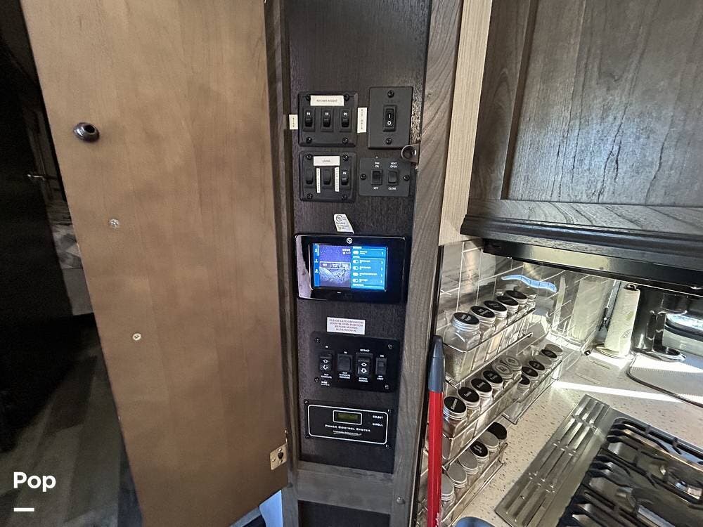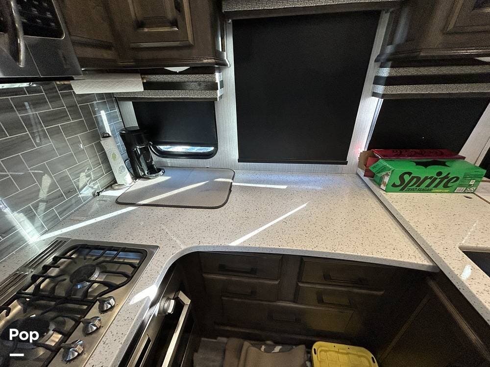 On the exterior, the unit features a fully equipped outdoor kitchen, perfect for cooking and dining outside while enjoying the company of friends and family. The half bath in the garage adds extra convenience, allowing those in the back of the RV to have easy access to a bathroom without entering the main living area.