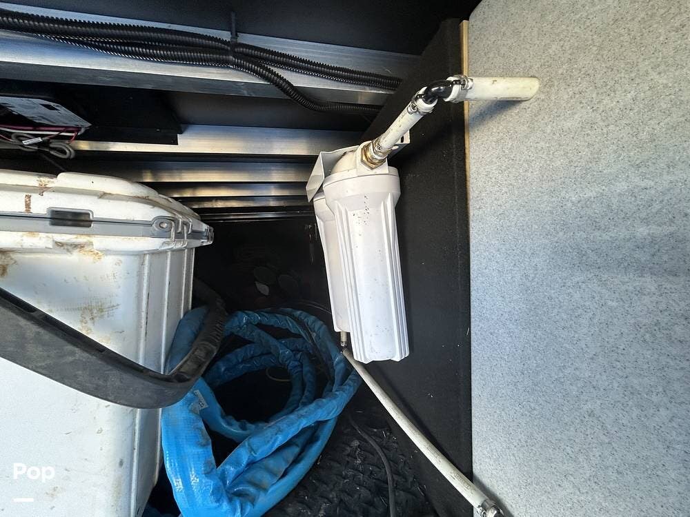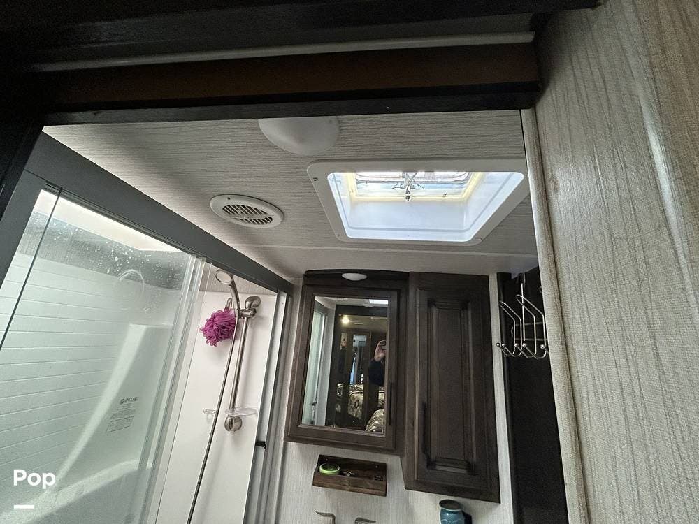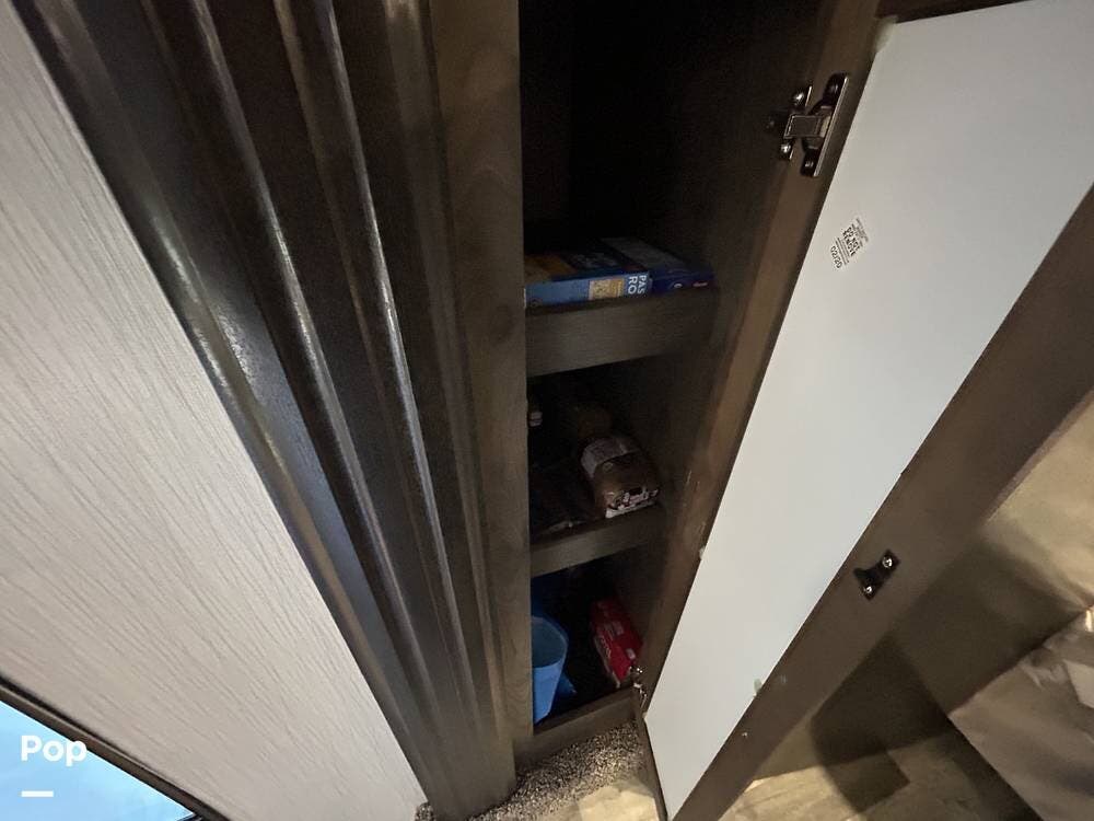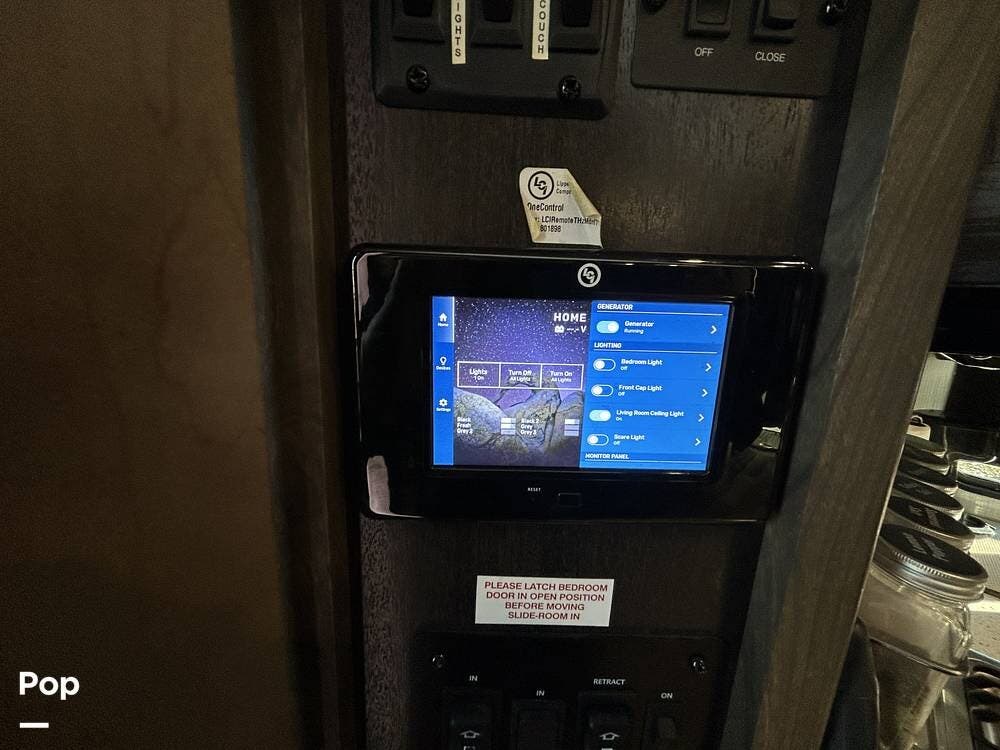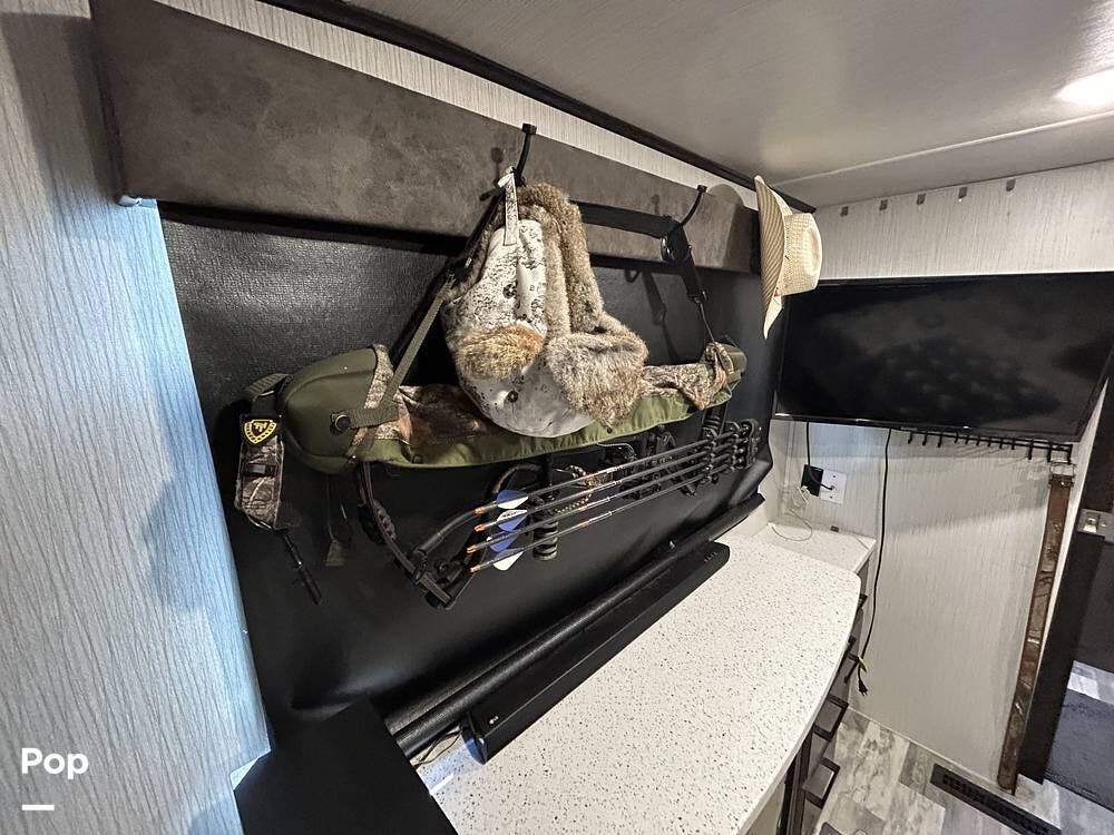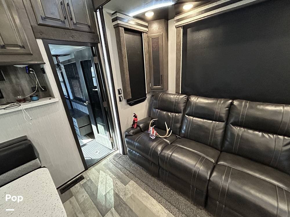On the exterior, the unit features a fully equipped outdoor kitchen, perfect for cooking and dining outside while enjoying the company of friends and family. The half bath in the garage adds extra convenience, allowing those in the back of the RV to have easy access to a bathroom without entering the main living area.