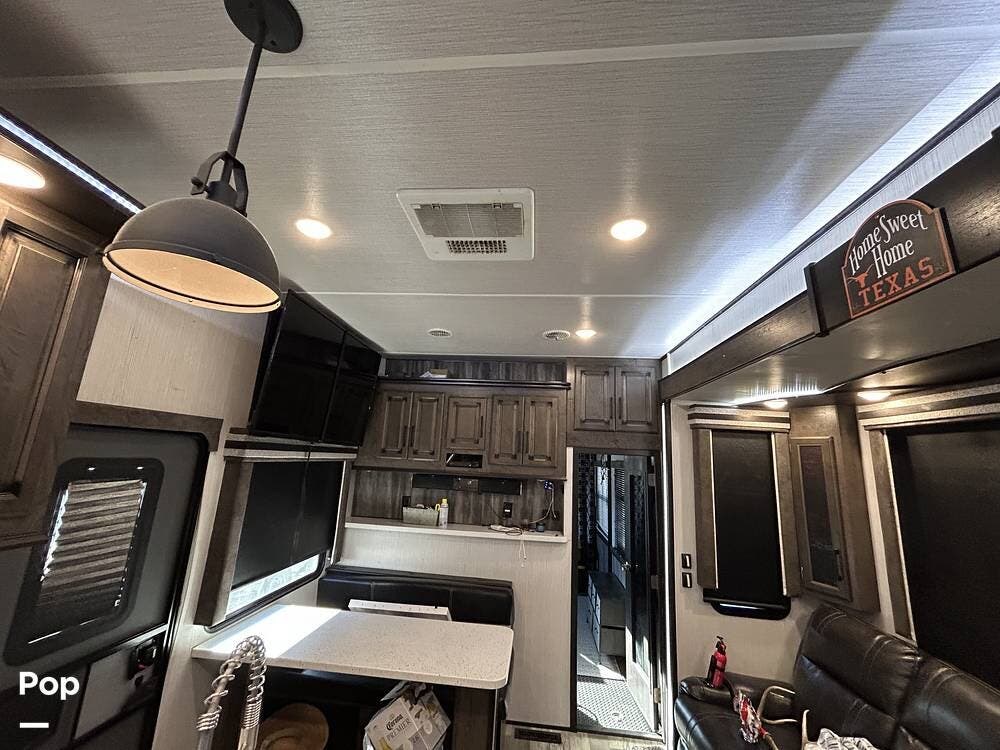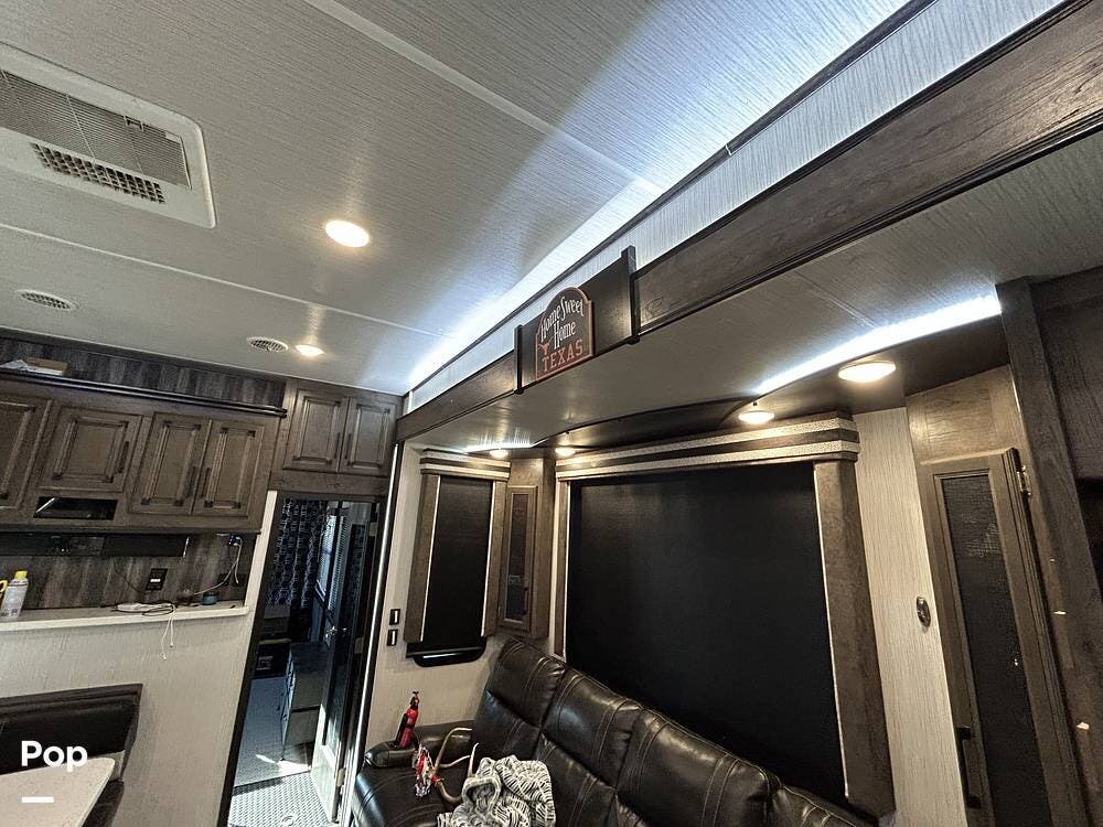 The unit's interior is thoughtfully laid out, with a half dinette near the entrance, a large sofa, and a spacious kitchen area. Accent lights throughout, even under the dinette, create a welcoming atmosphere.