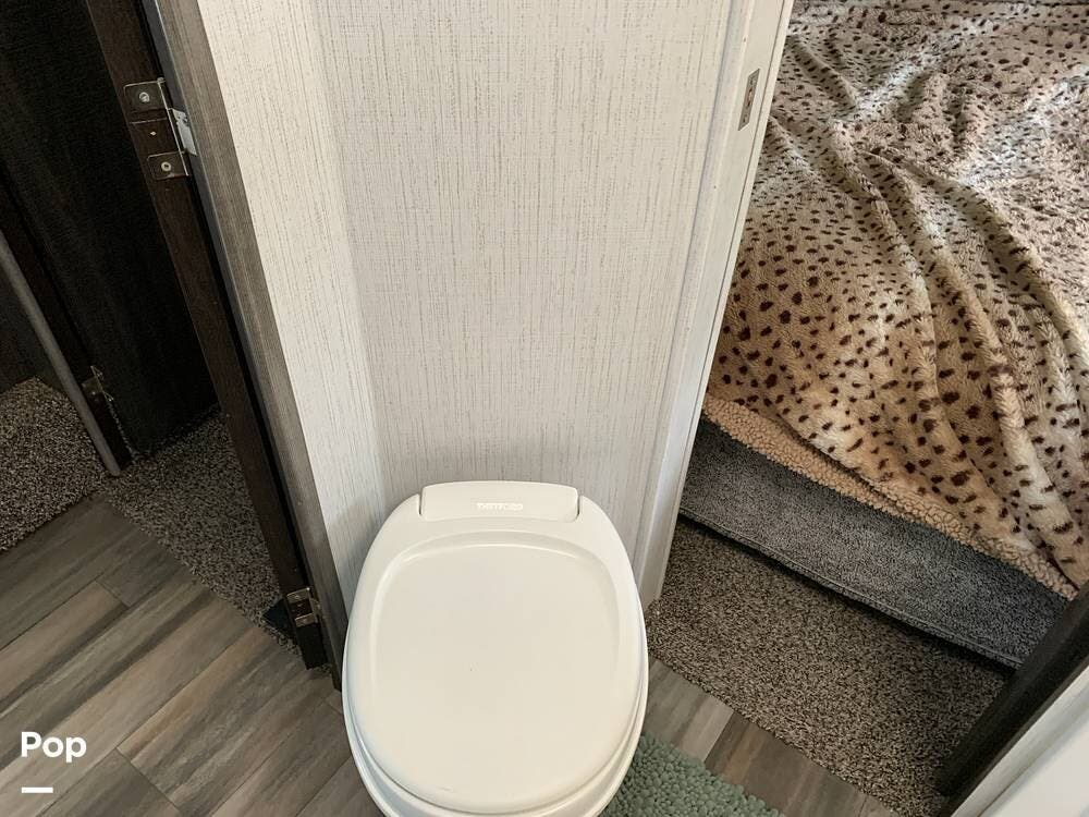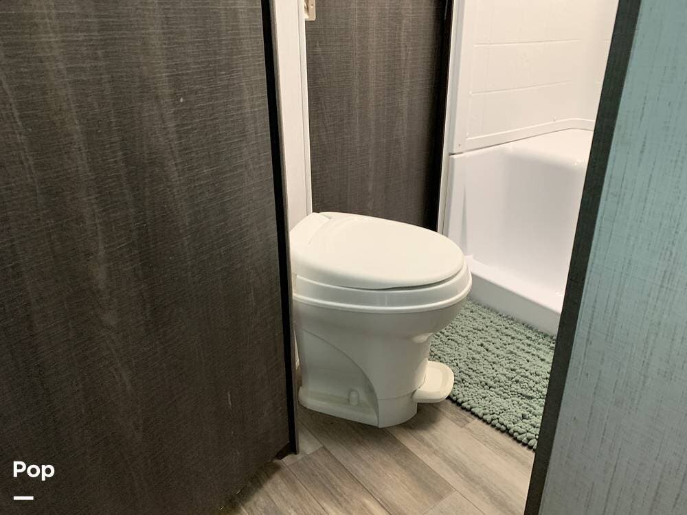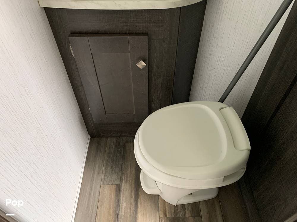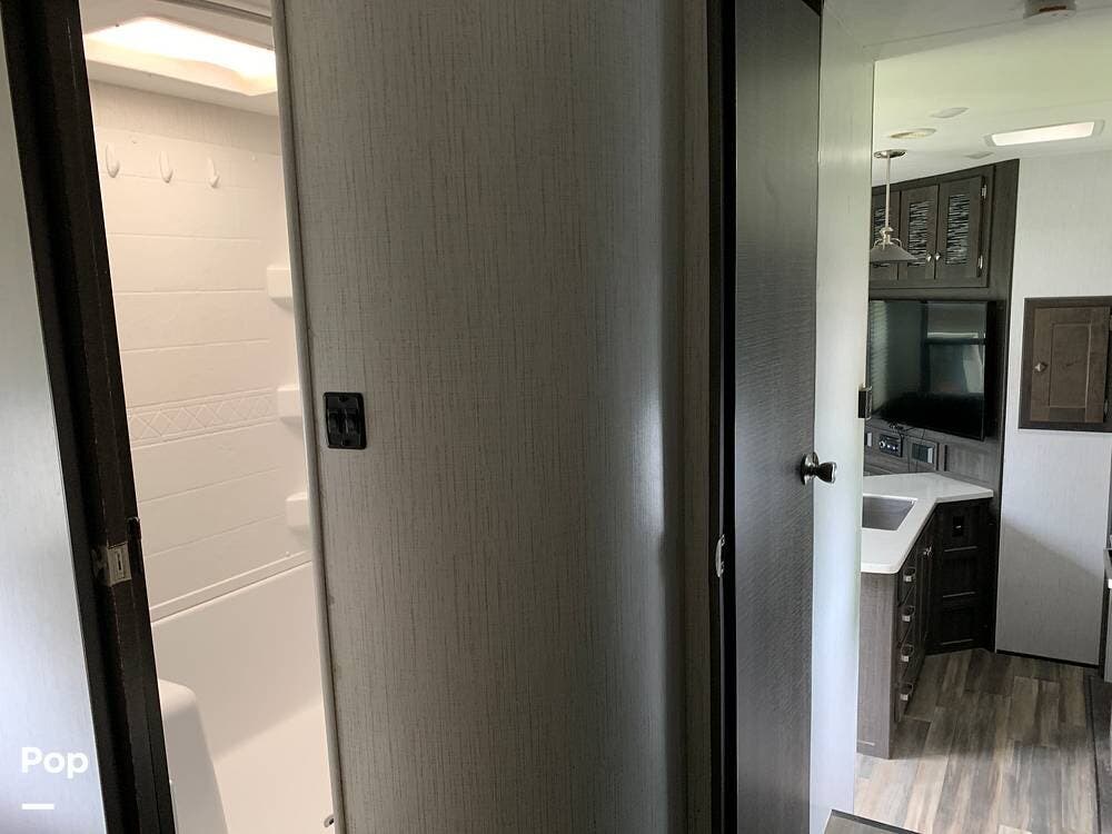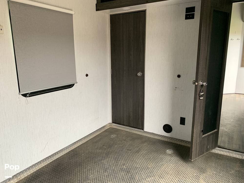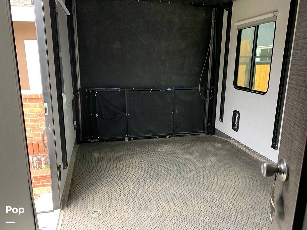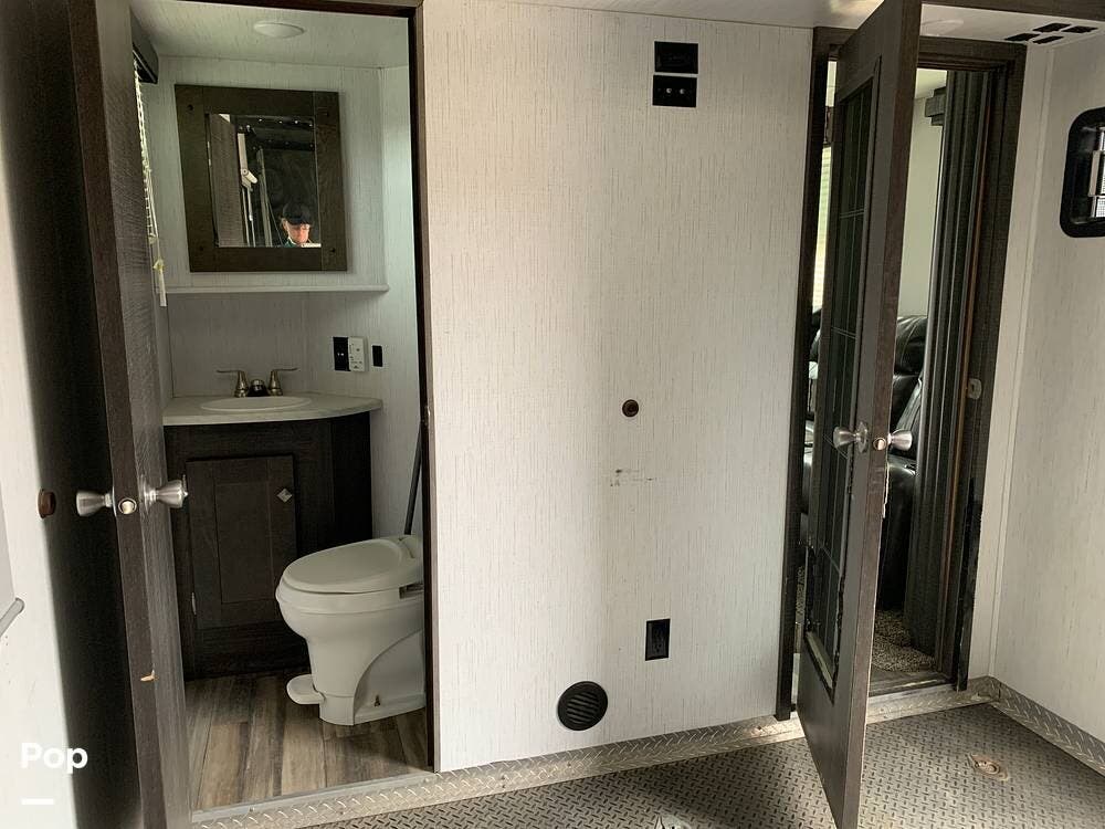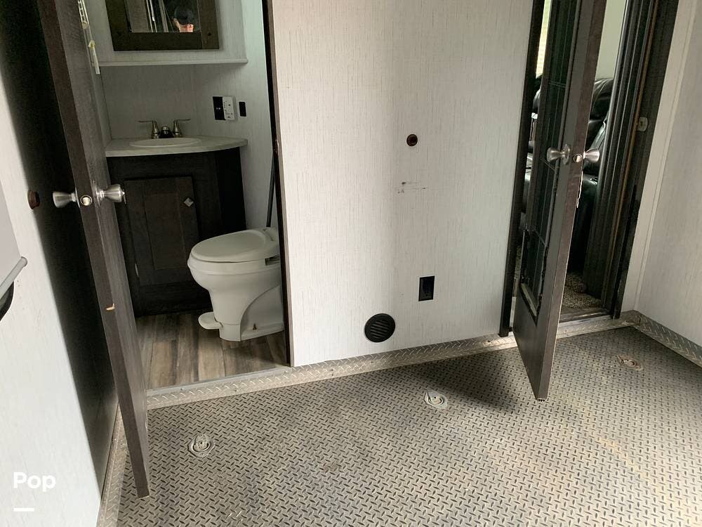 This toy hauler has dual entries and a half bath in the garage area.