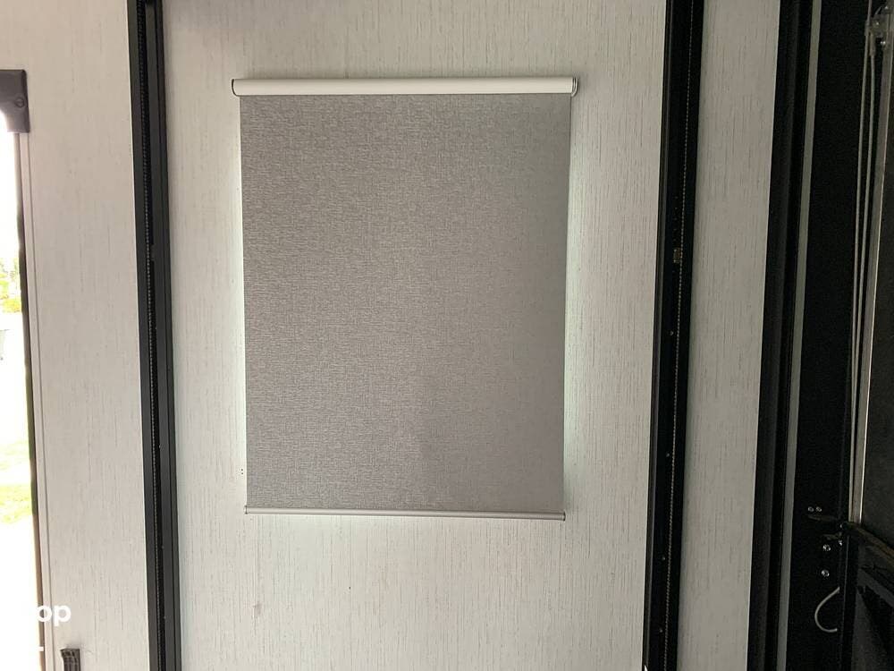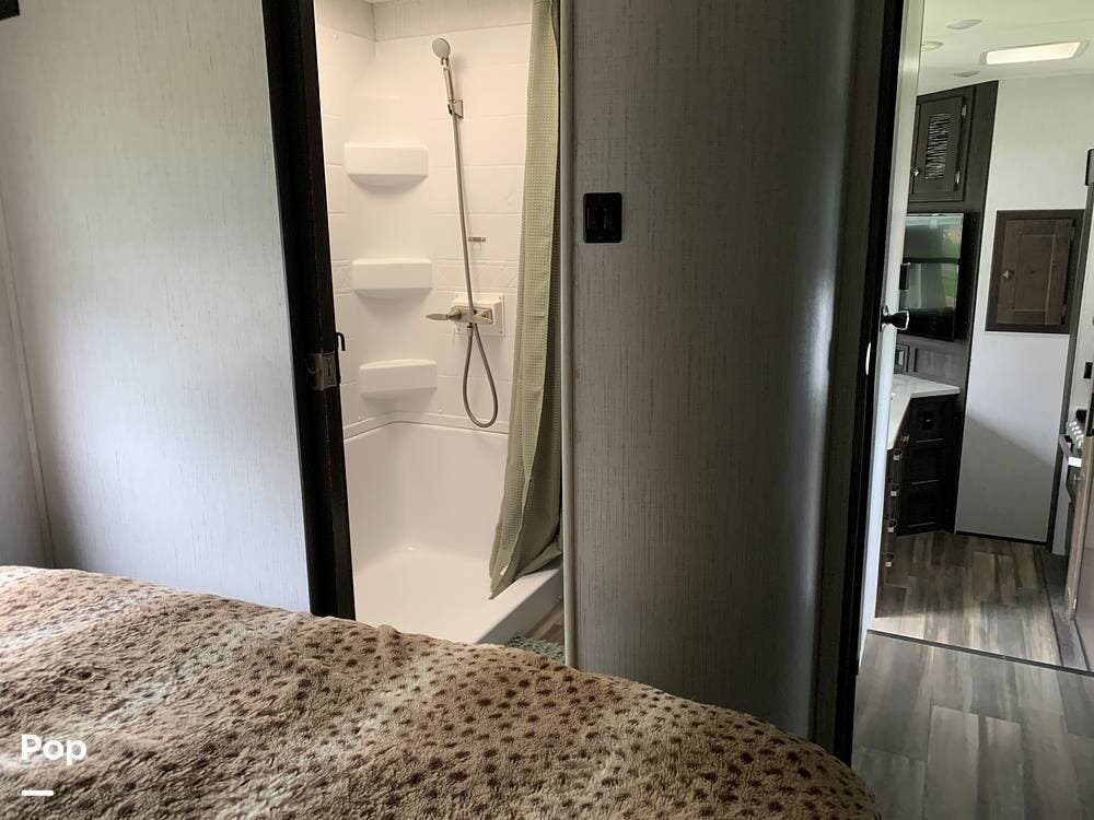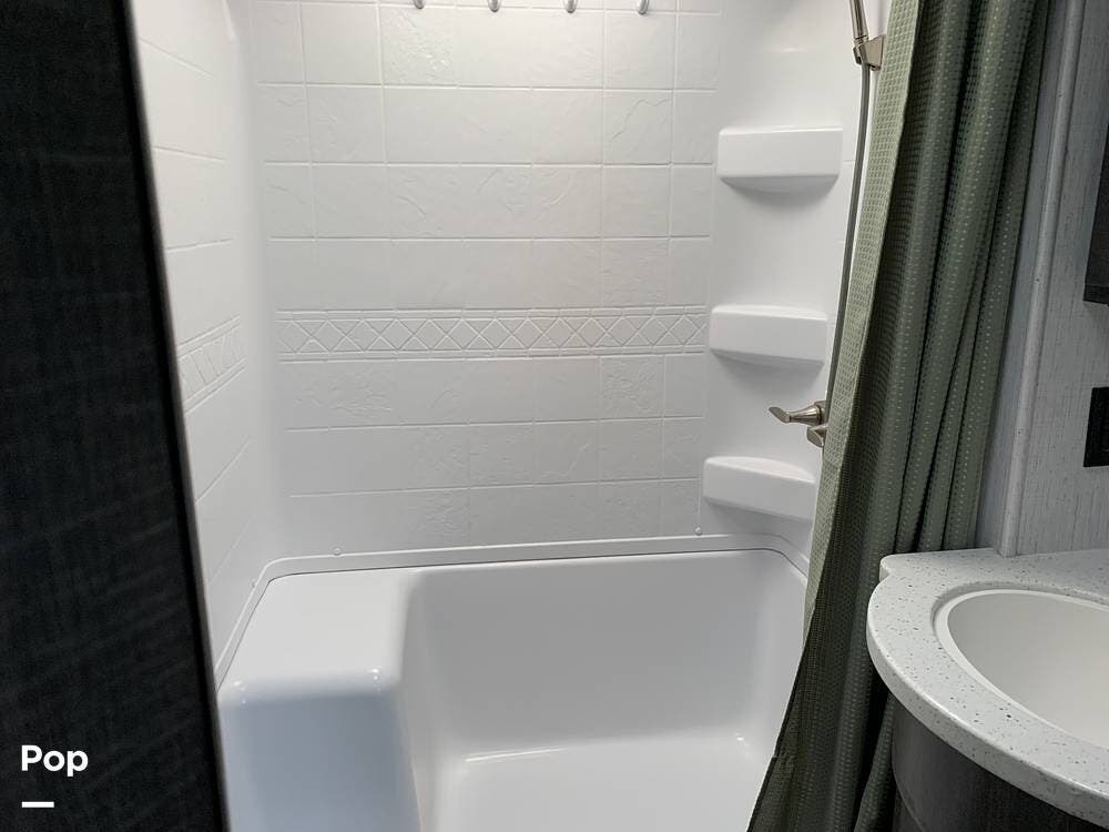 As you make your way to the front of the RV, you will pass a modern kitchen and lounge area with a TV. Up the hallway is a full bathroom with a seated shower.