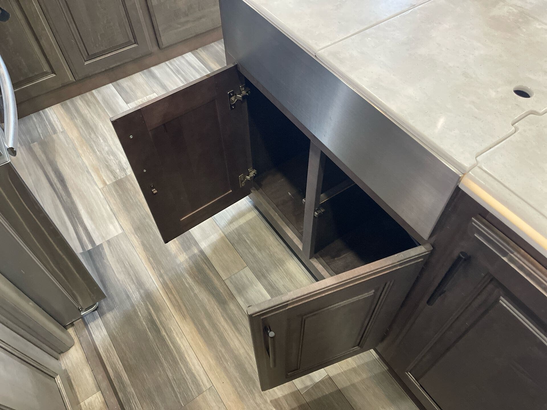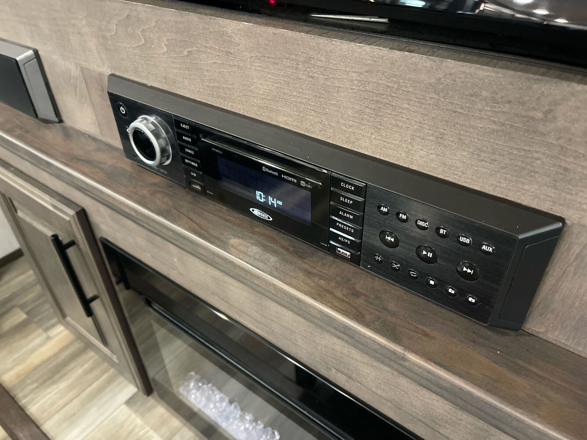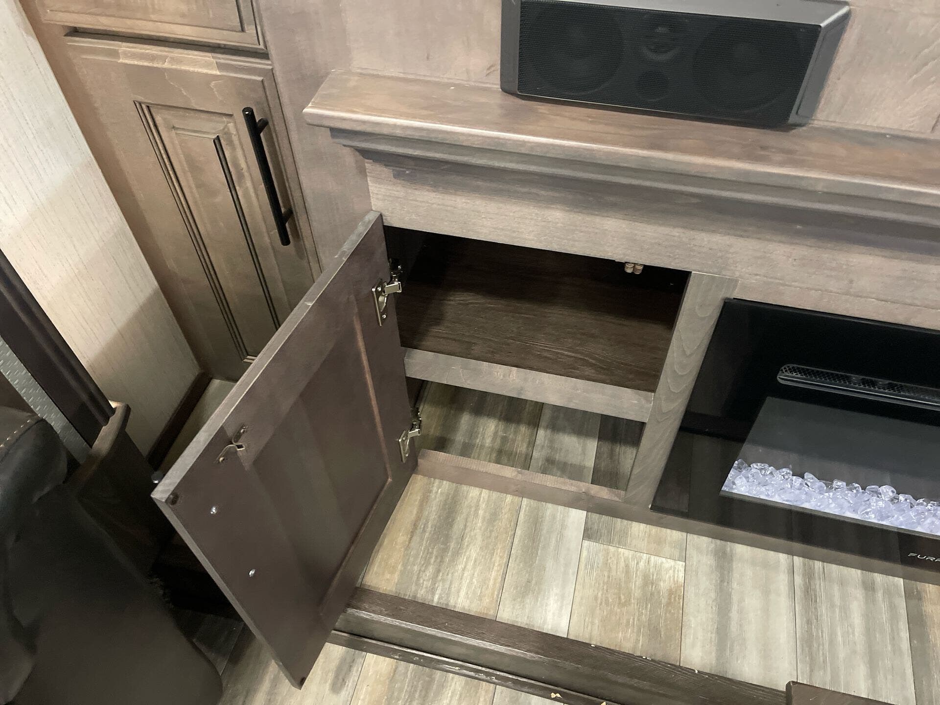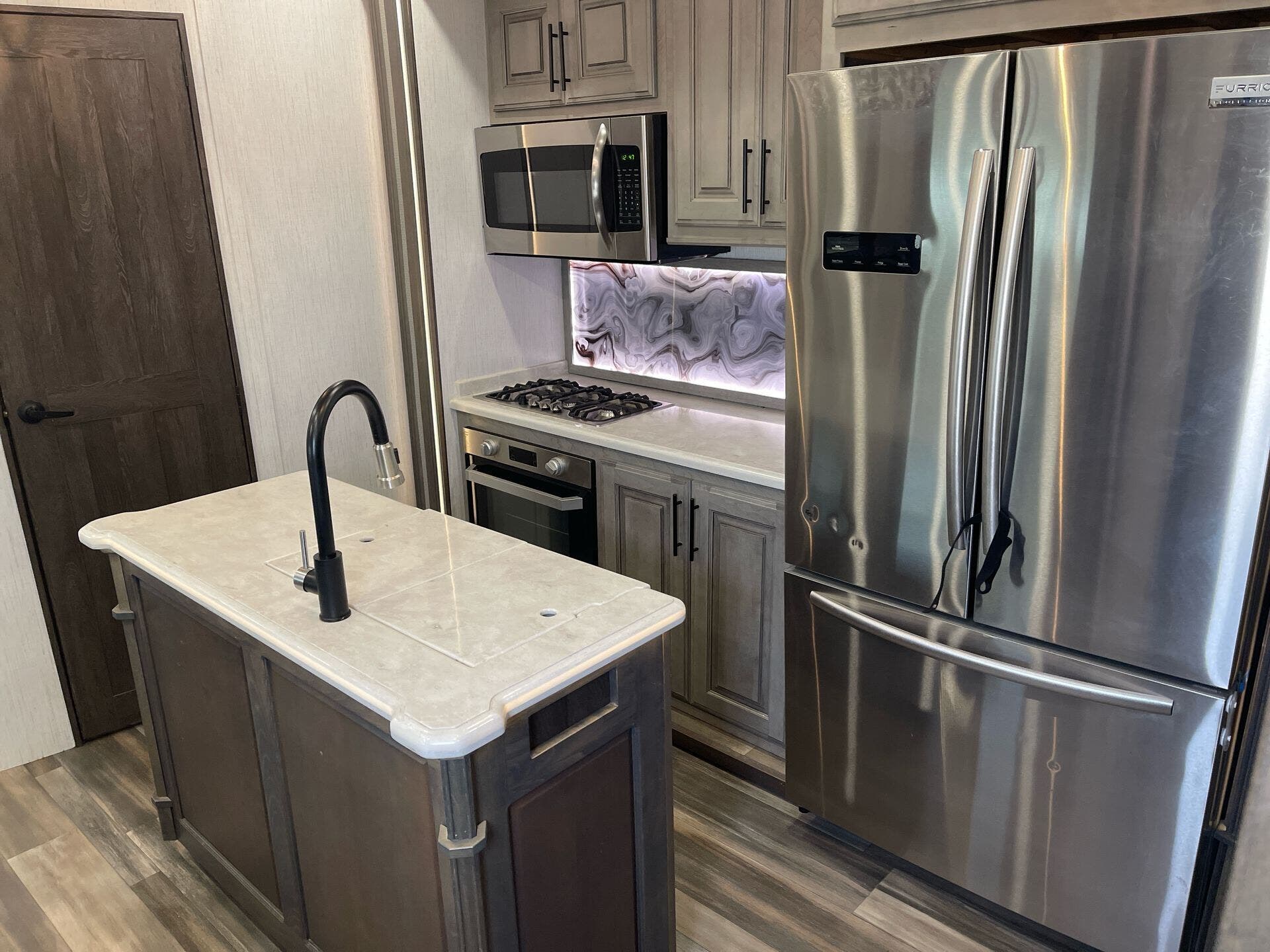As you step inside, you’re greeted by a large living area featuring cozy theater seating and a sofa, positioned around an entertainment center with a large TV and fireplace — perfect for relaxing evenings. The well-appointed kitchen boasts a residential-style stainless refrigerator, three-burner range with oven, microwave, and solid-surface countertops, plus a large center island with deep sink and abundant storage. A spacious free-standing dinette provides a comfortable setting for meals and games.