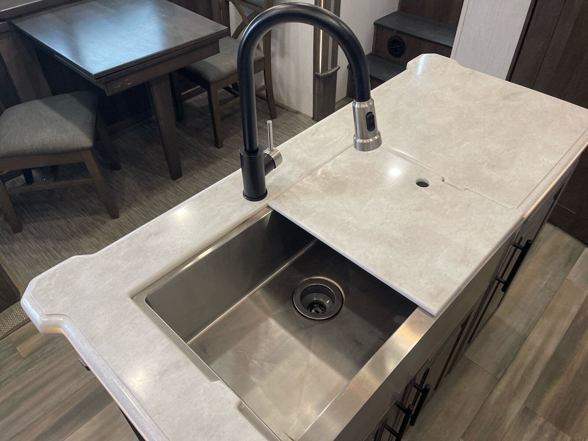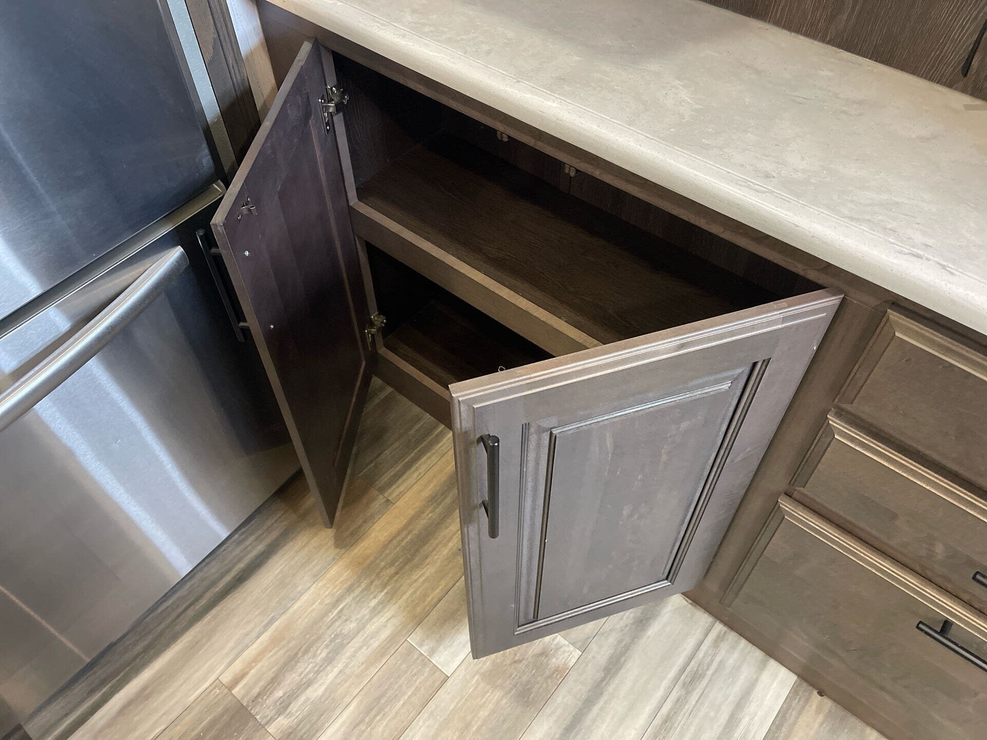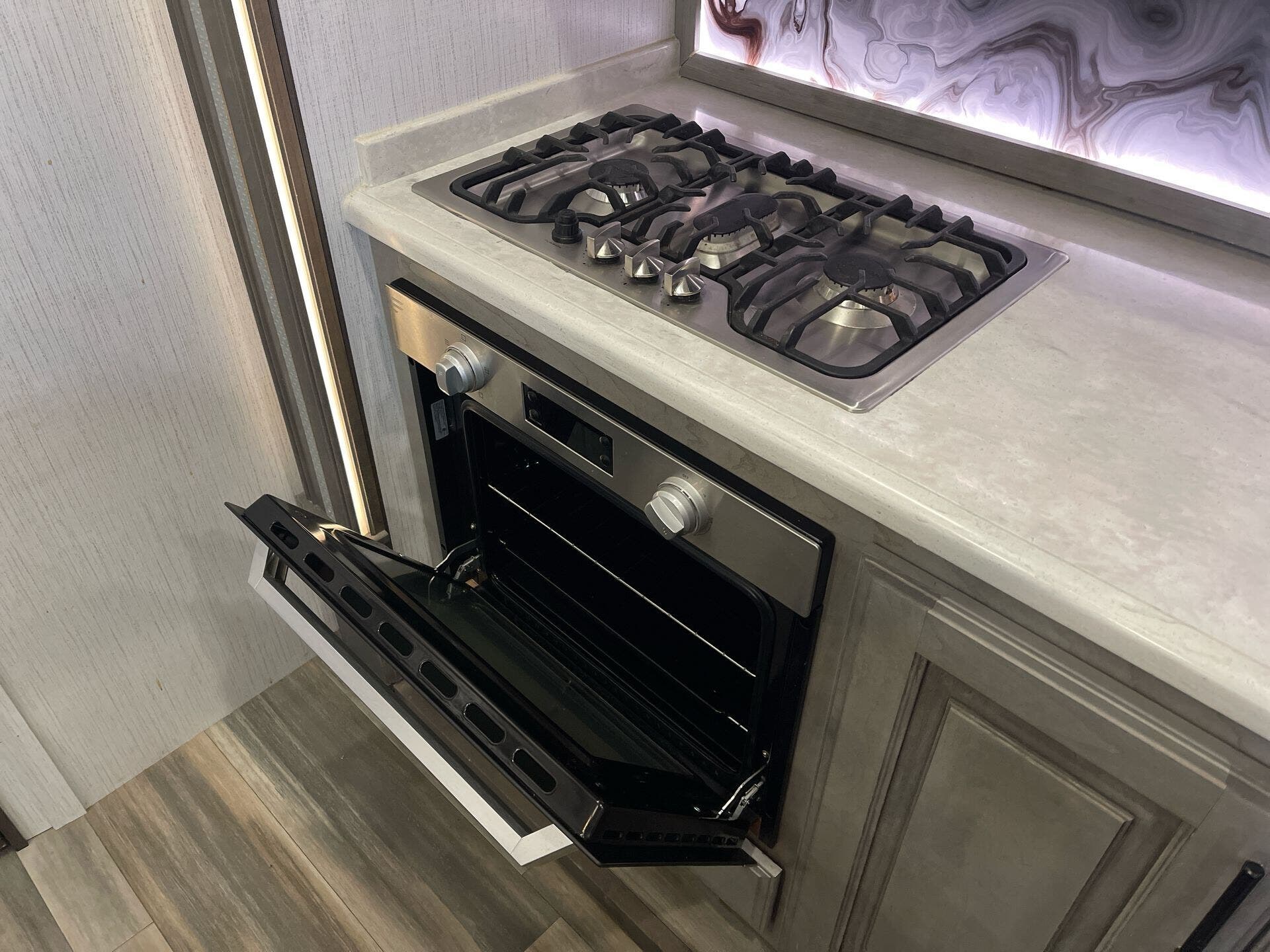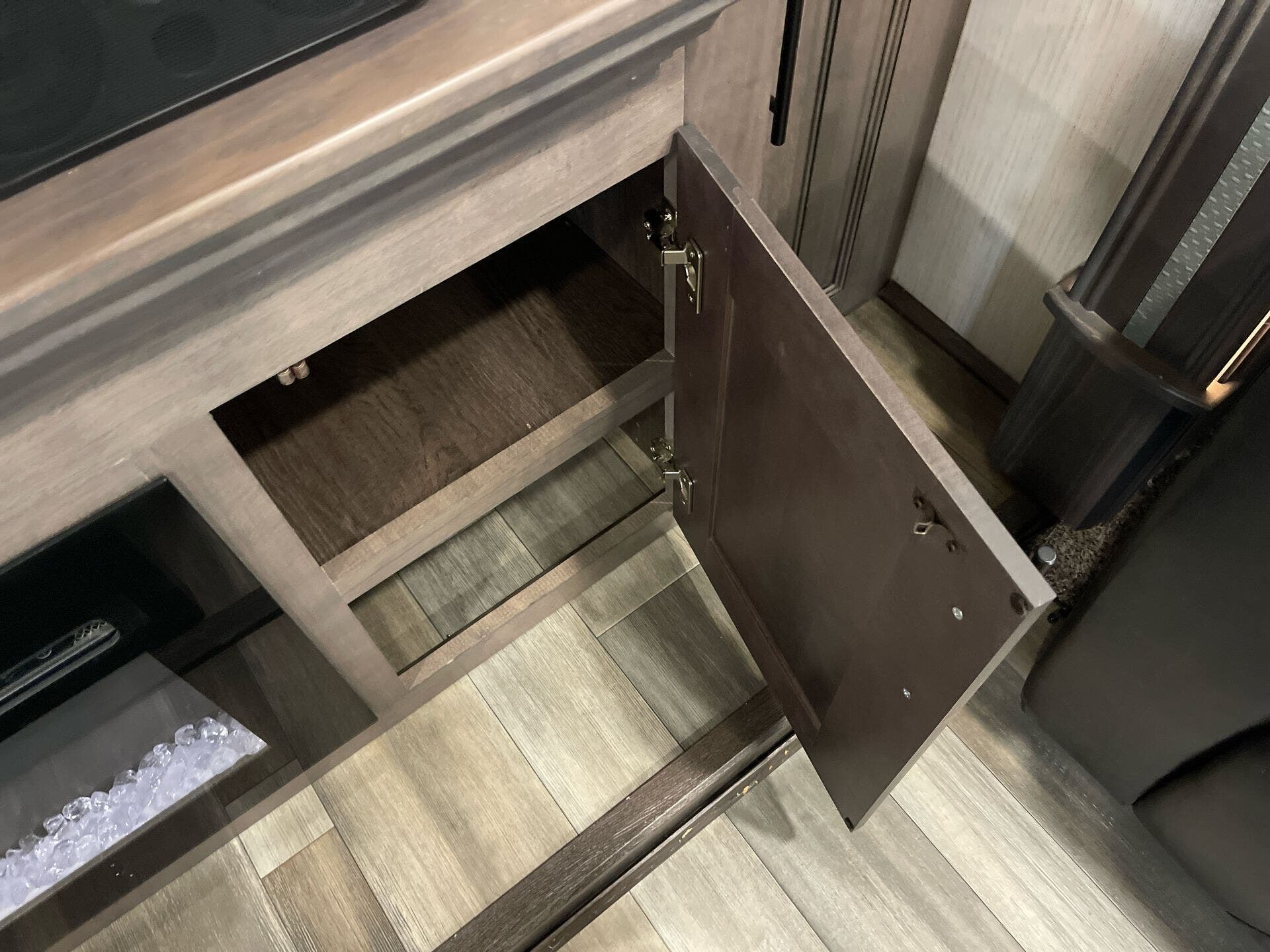 As you step inside, you’re greeted by a large living area featuring cozy theater seating and a sofa, positioned around an entertainment center with a large TV and fireplace — perfect for relaxing evenings. The well-appointed kitchen boasts a residential-style stainless refrigerator, three-burner range with oven, microwave, and solid-surface countertops, plus a large center island with deep sink and abundant storage. A spacious free-standing dinette provides a comfortable setting for meals and games.