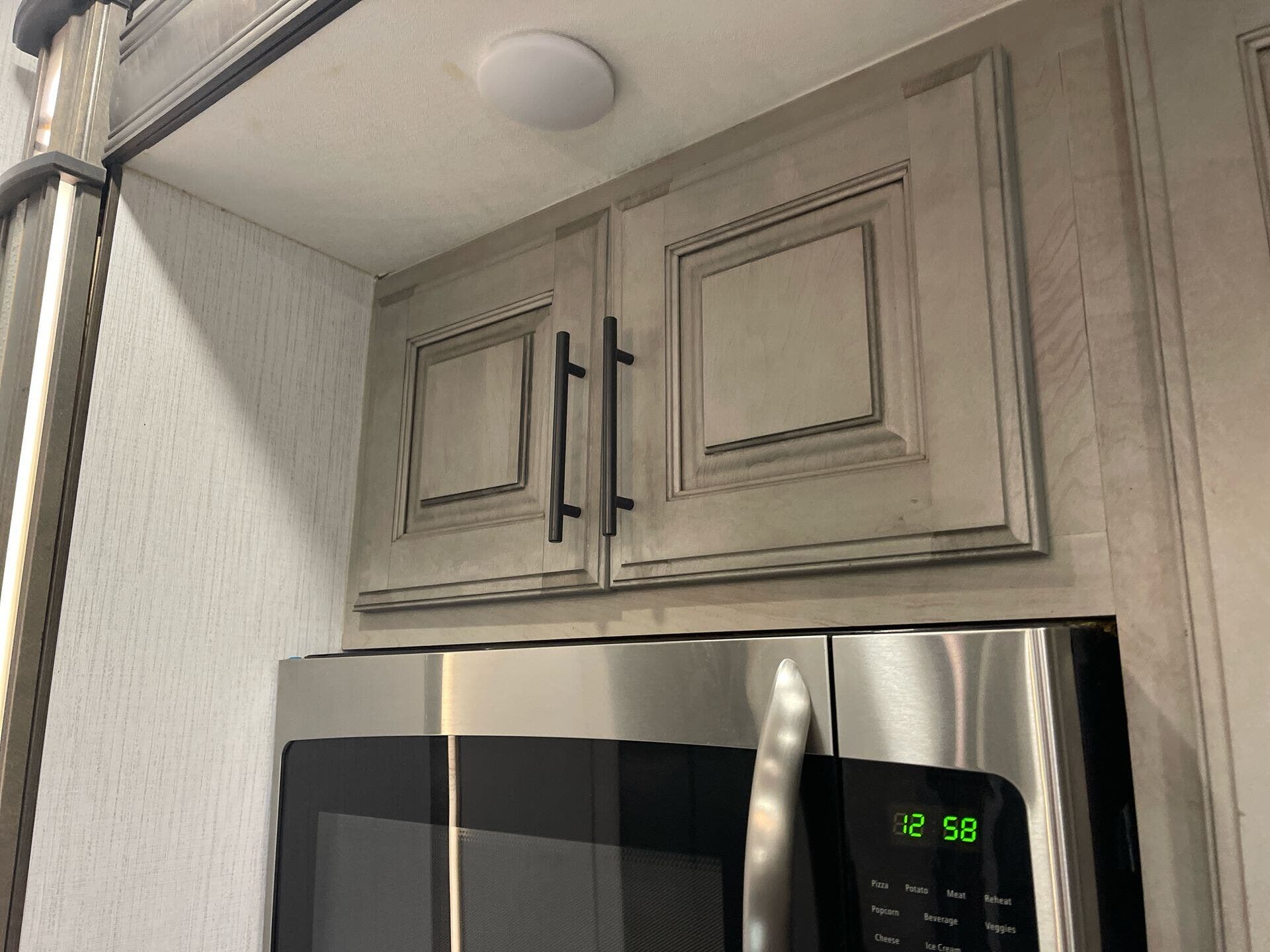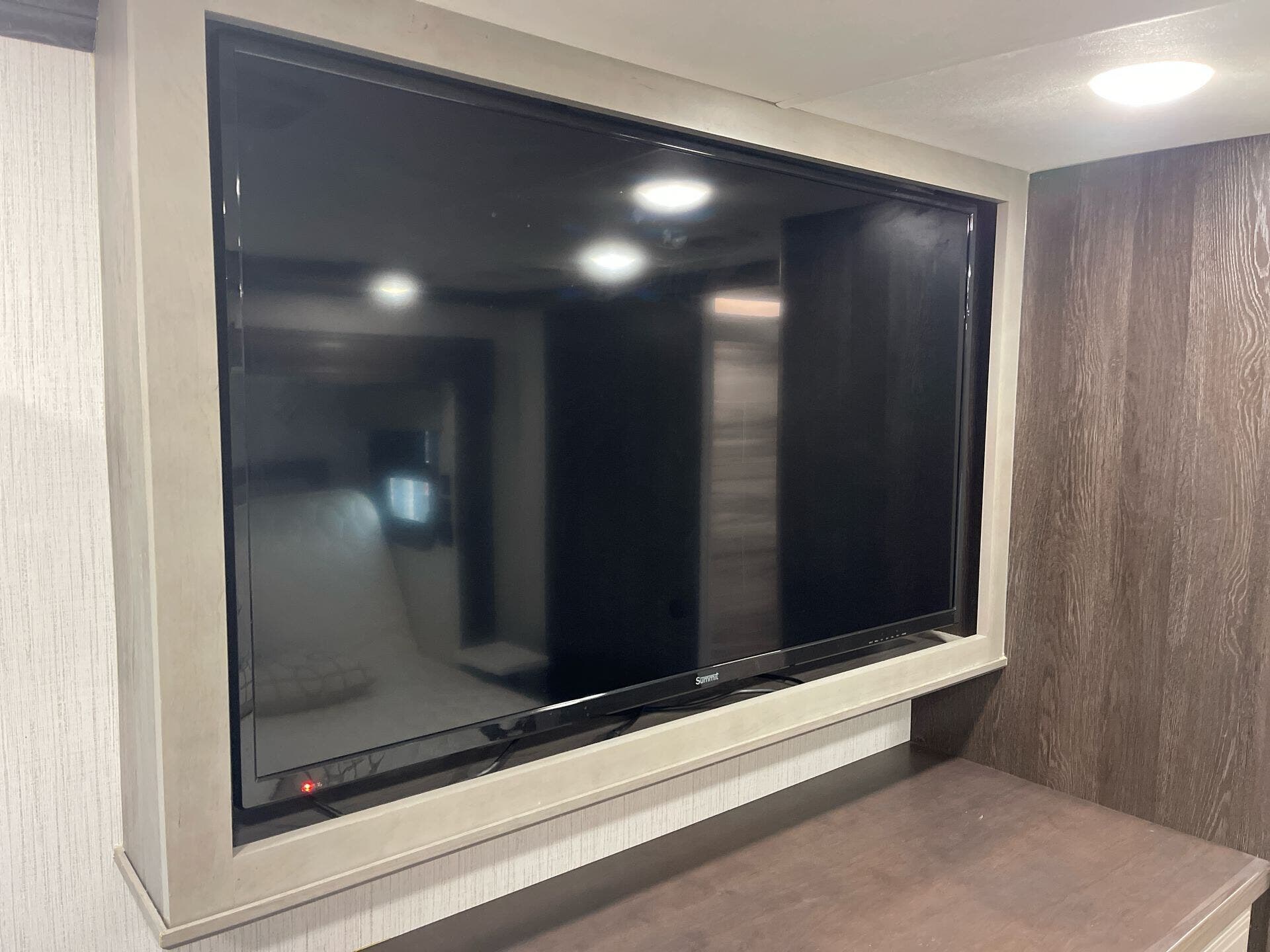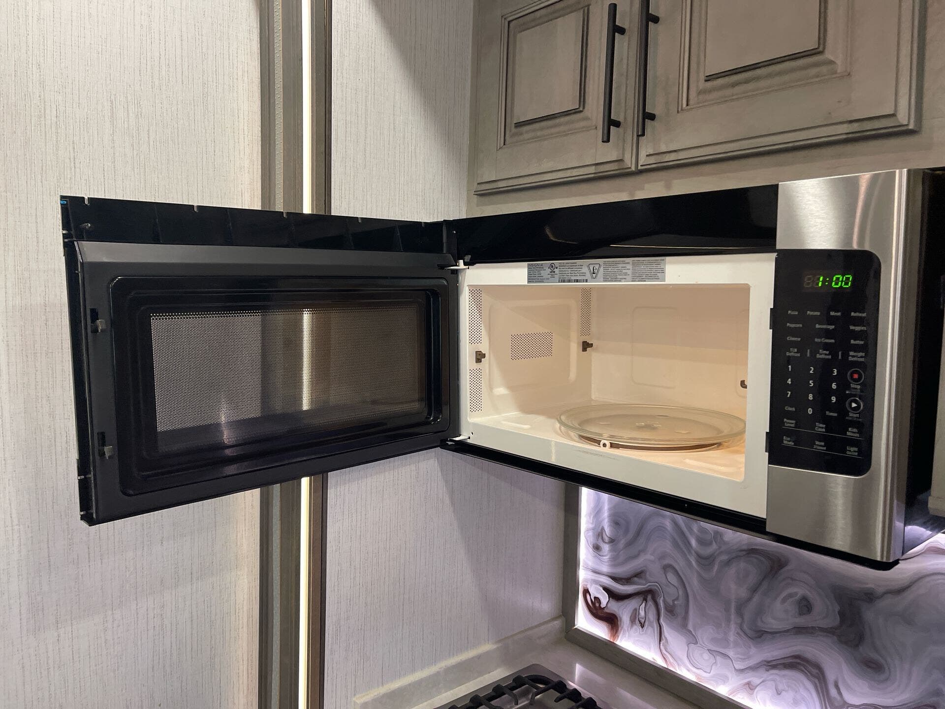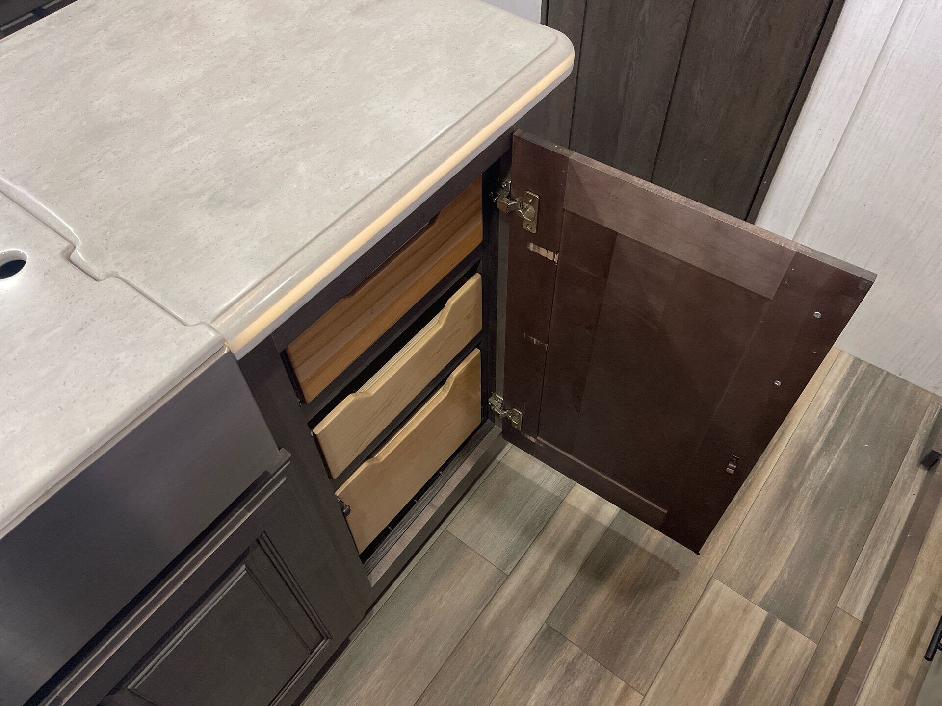 As you step inside, you’re greeted by a large living area featuring cozy theater seating and a sofa, positioned around an entertainment center with a large TV and fireplace — perfect for relaxing evenings. The well-appointed kitchen boasts a residential-style stainless refrigerator, three-burner range with oven, microwave, and solid-surface countertops, plus a large center island with deep sink and abundant storage. A spacious free-standing dinette provides a comfortable setting for meals and games.