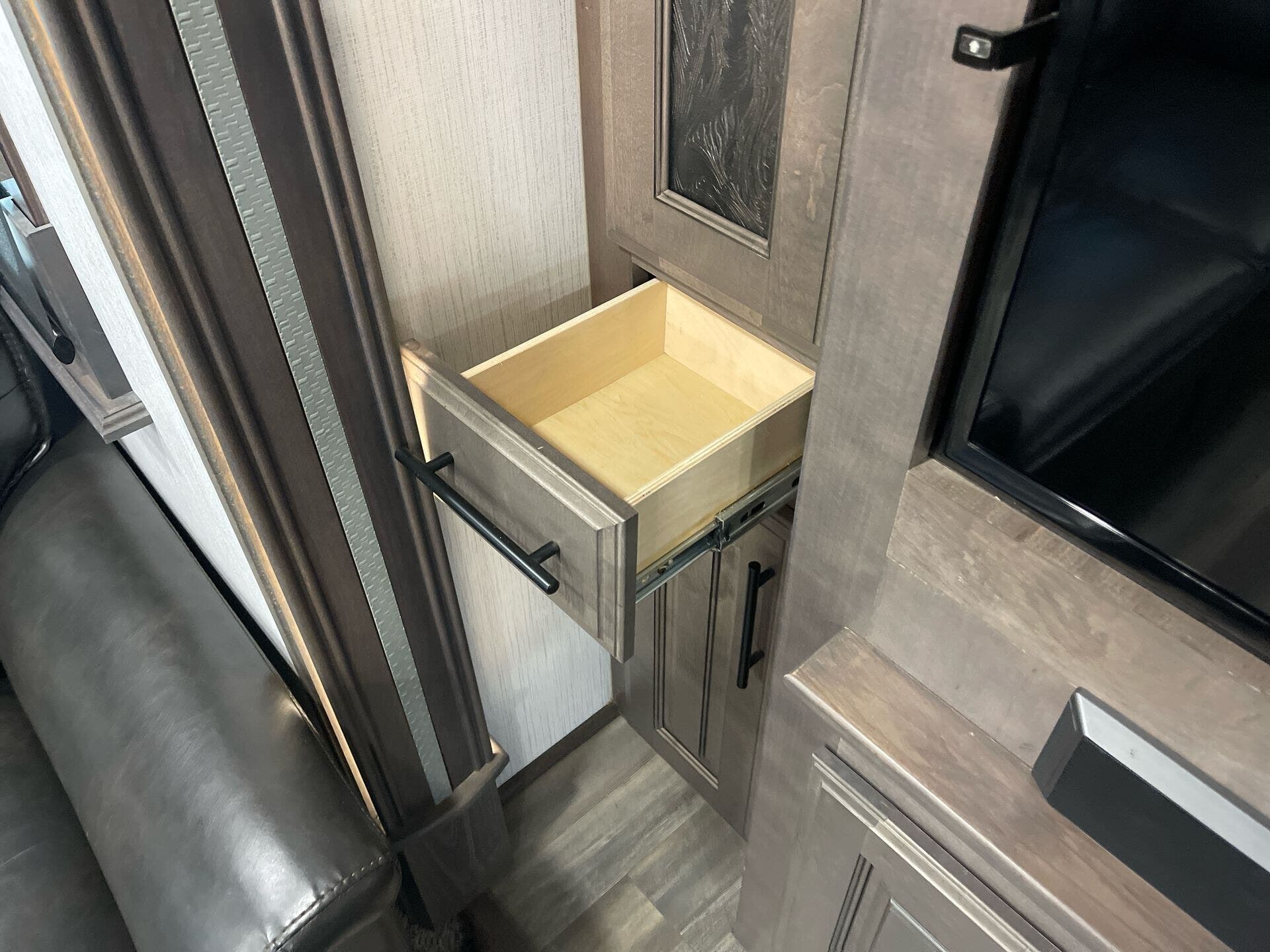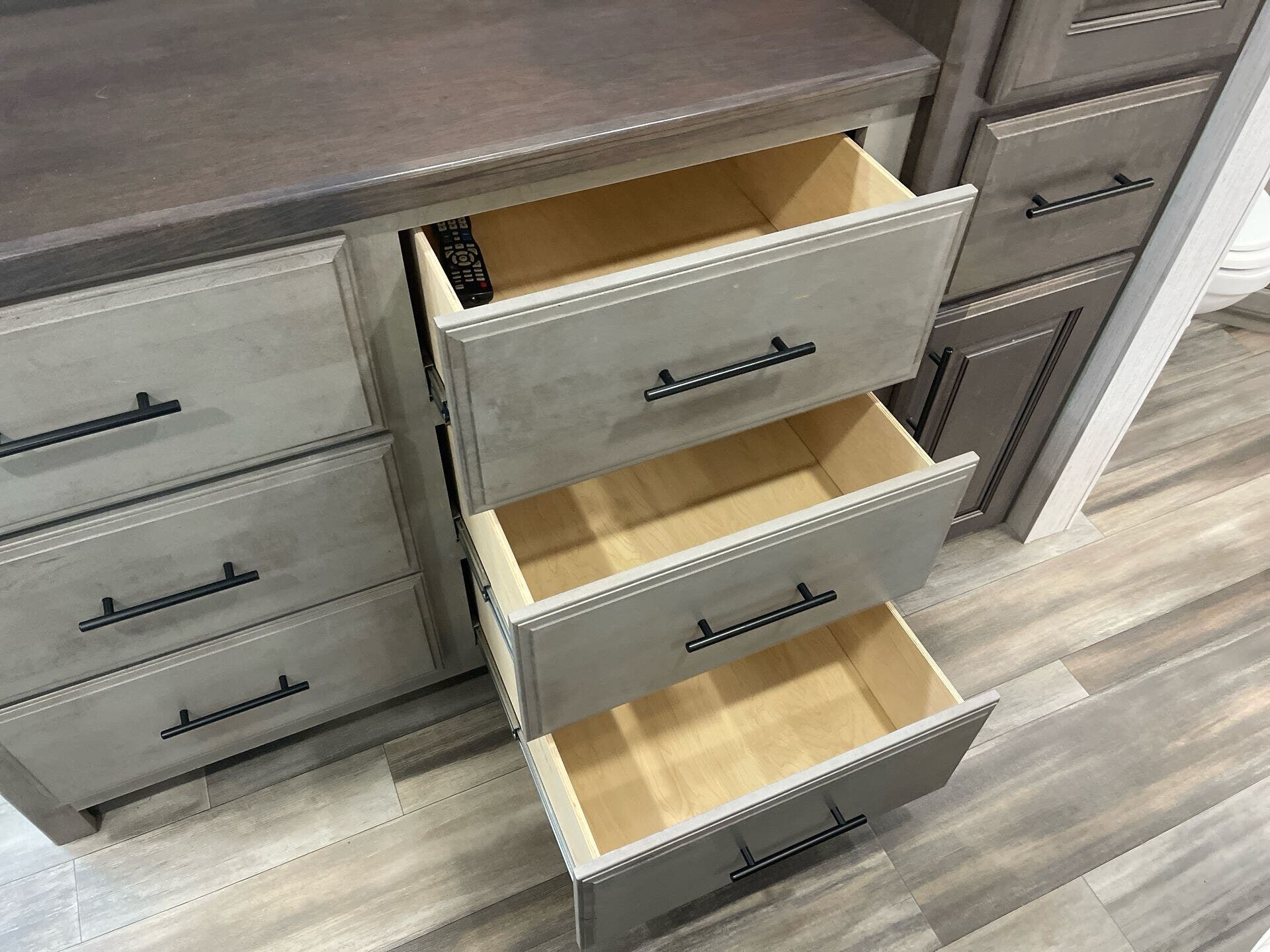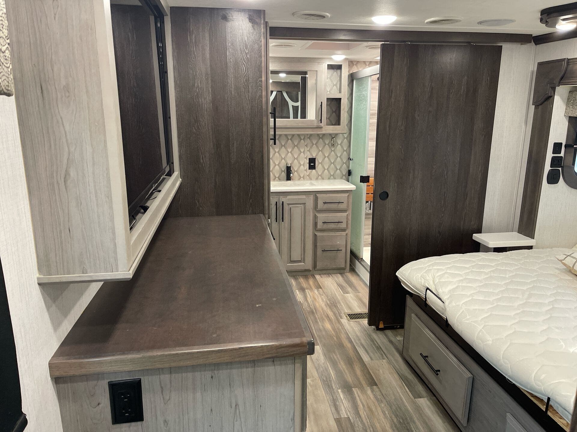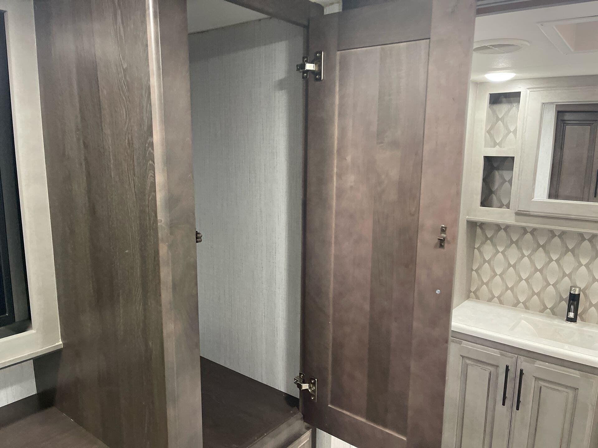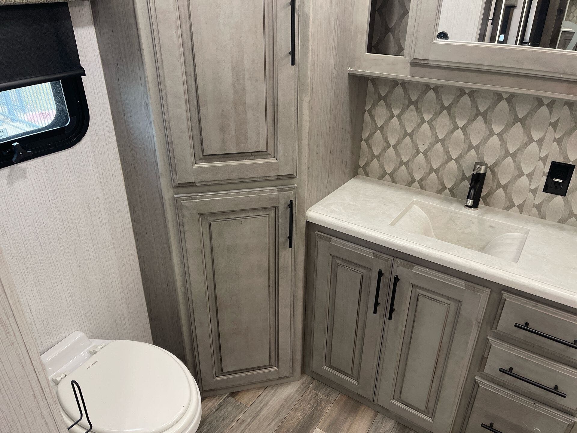 The master bedroom is a true retreat, with a king-size bed, plentiful closet space, and washer/dryer prep, offering the conveniences of home life on the road. The full bathroom includes a roomy residential shower with seat, linen storage, and quality fixtures.