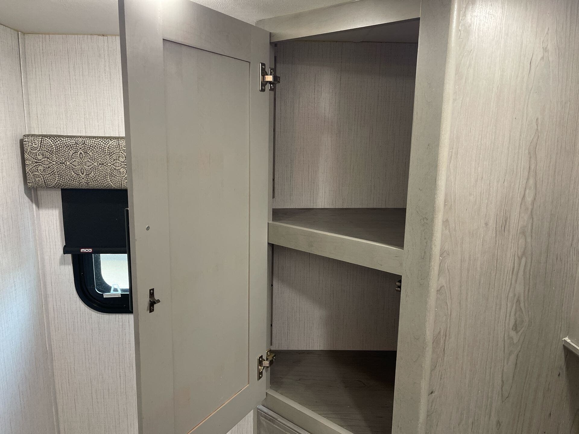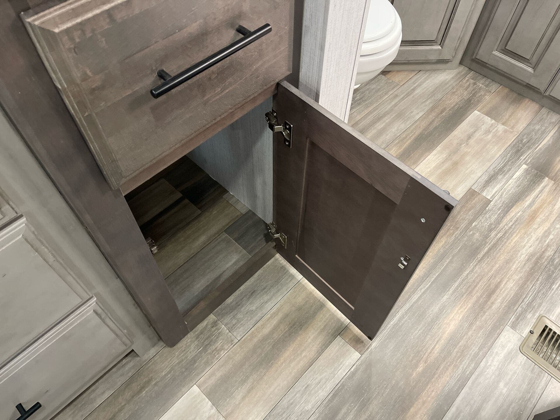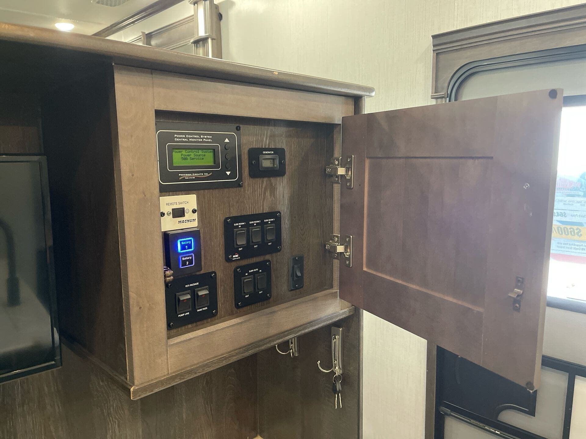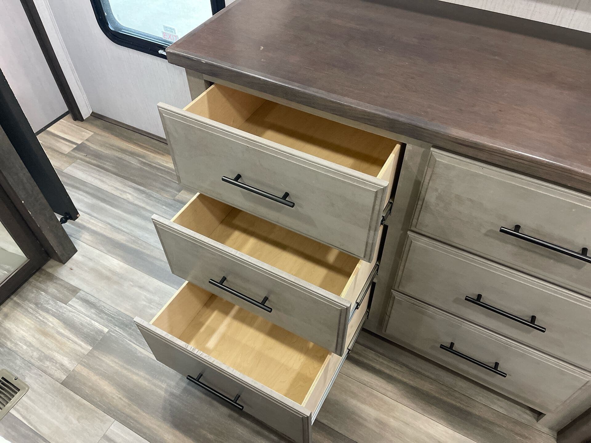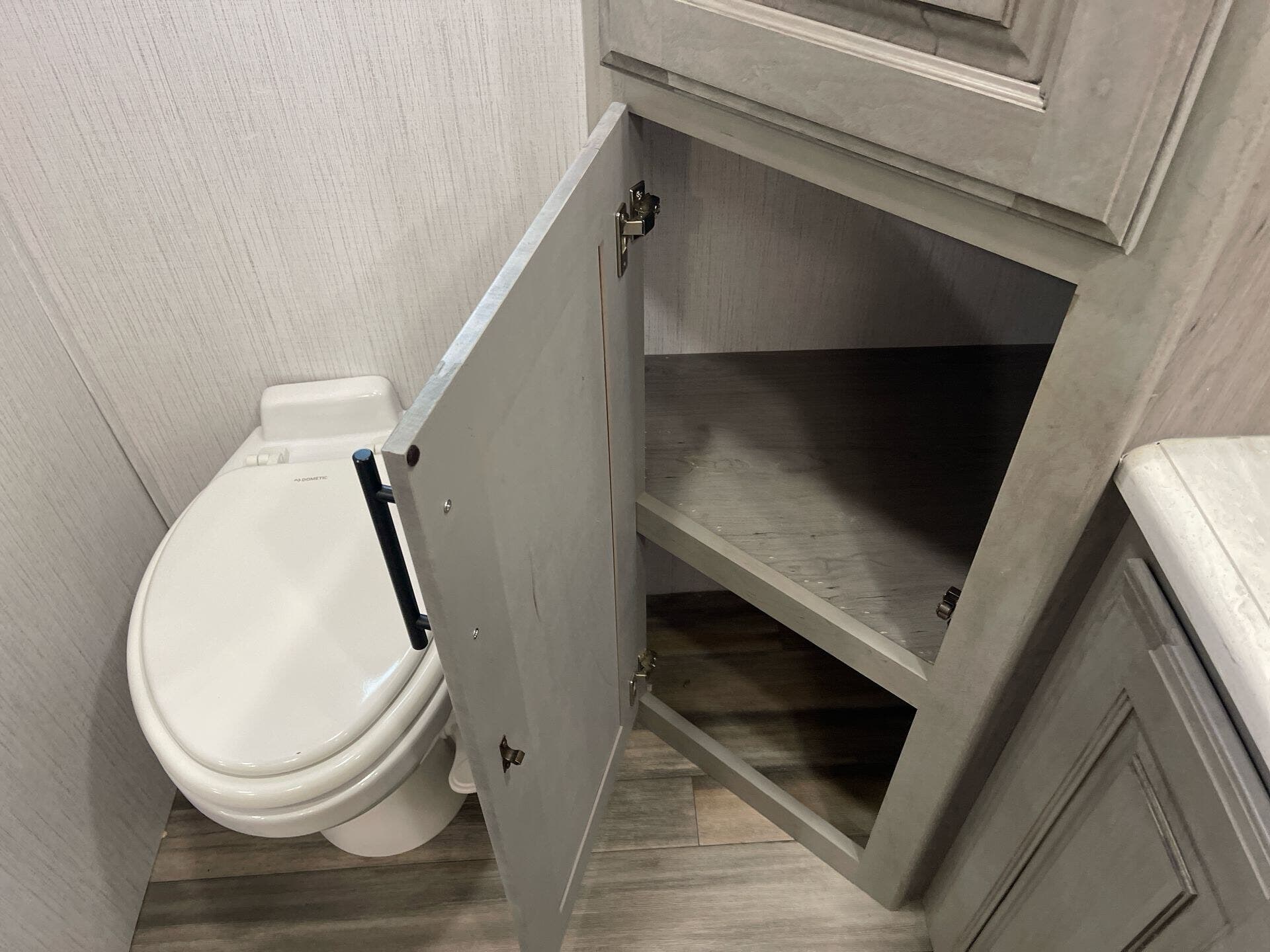 The master bedroom is a true retreat, with a king-size bed, plentiful closet space, and washer/dryer prep, offering the conveniences of home life on the road. The full bathroom includes a roomy residential shower with seat, linen storage, and quality fixtures.