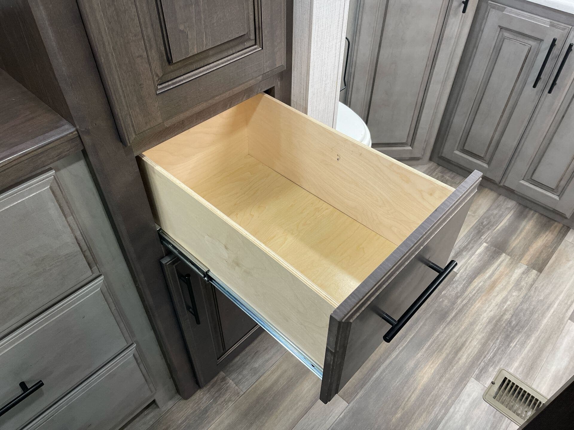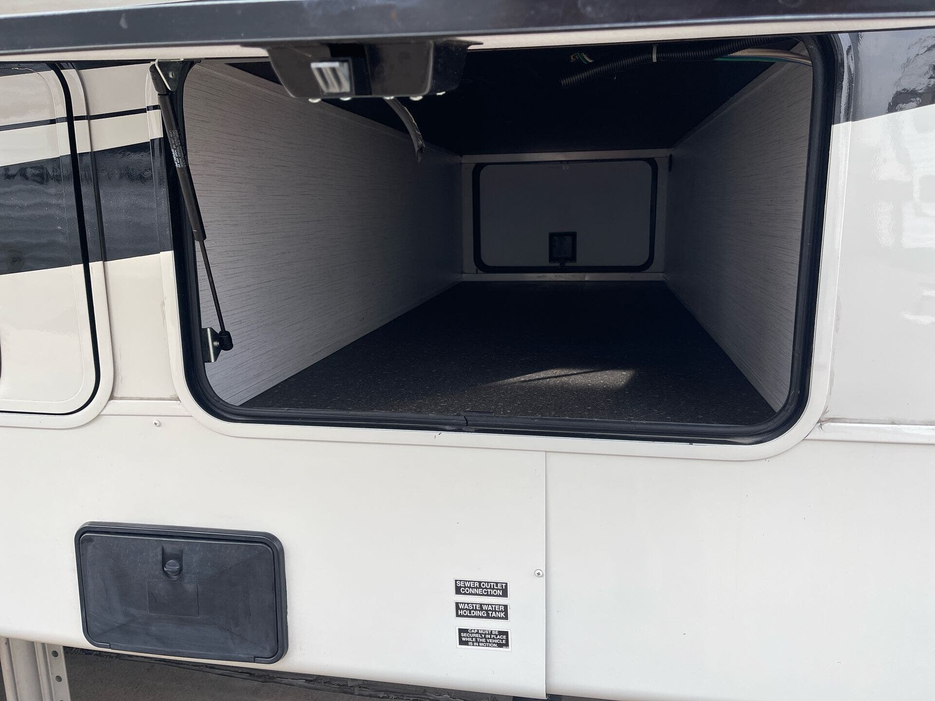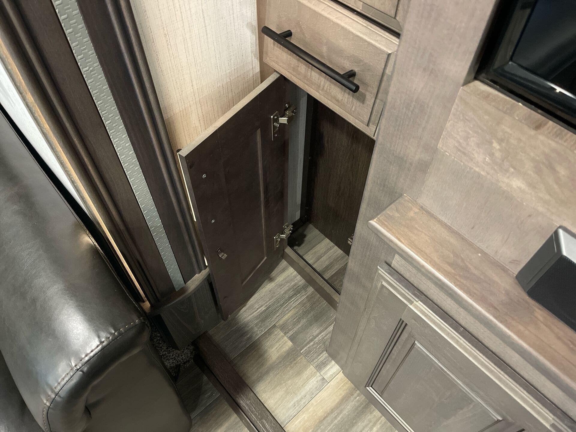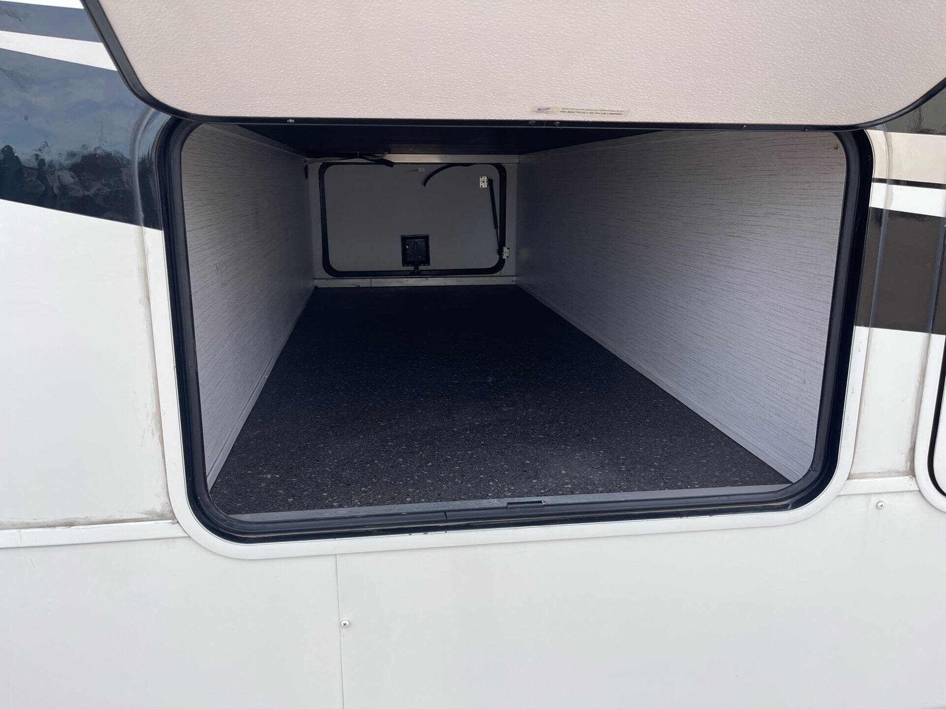 The master bedroom is a true retreat, with a king-size bed, plentiful closet space, and washer/dryer prep, offering the conveniences of home life on the road. The full bathroom includes a roomy residential shower with seat, linen storage, and quality fixtures.