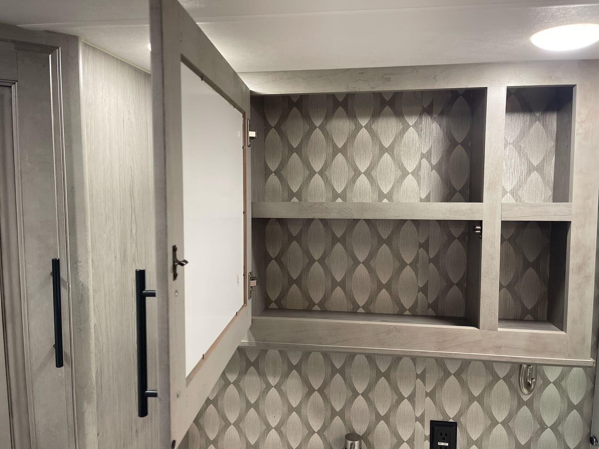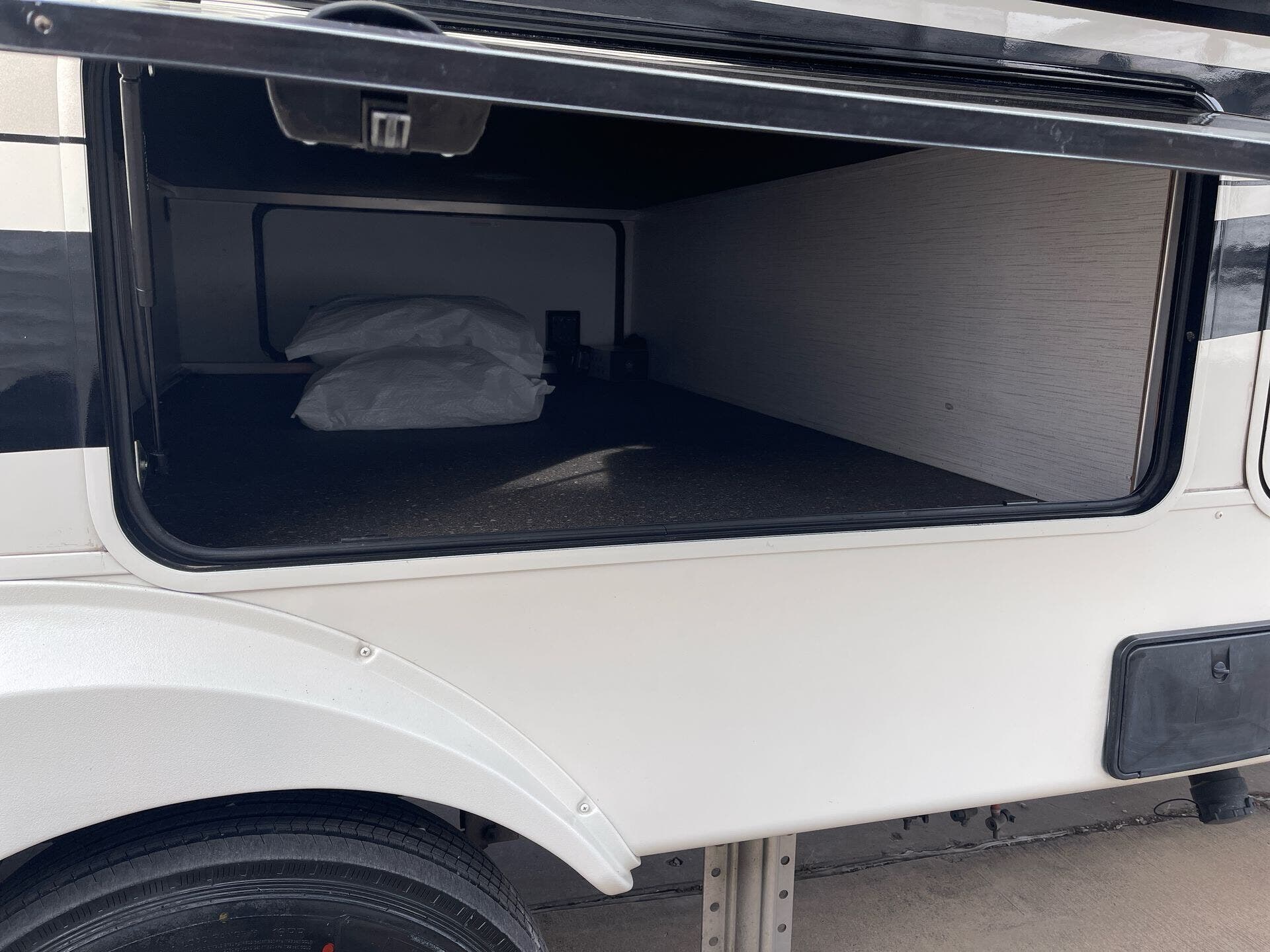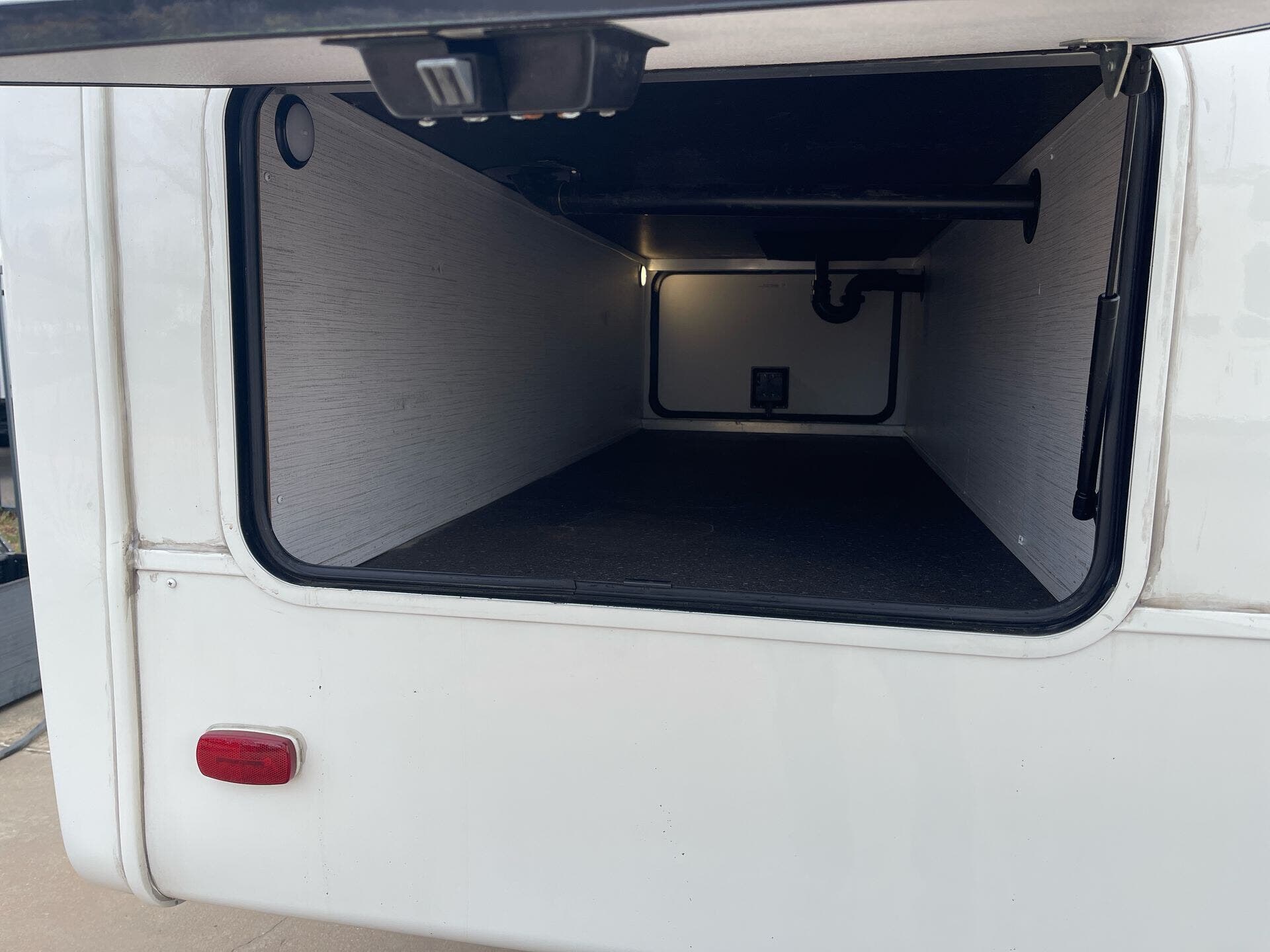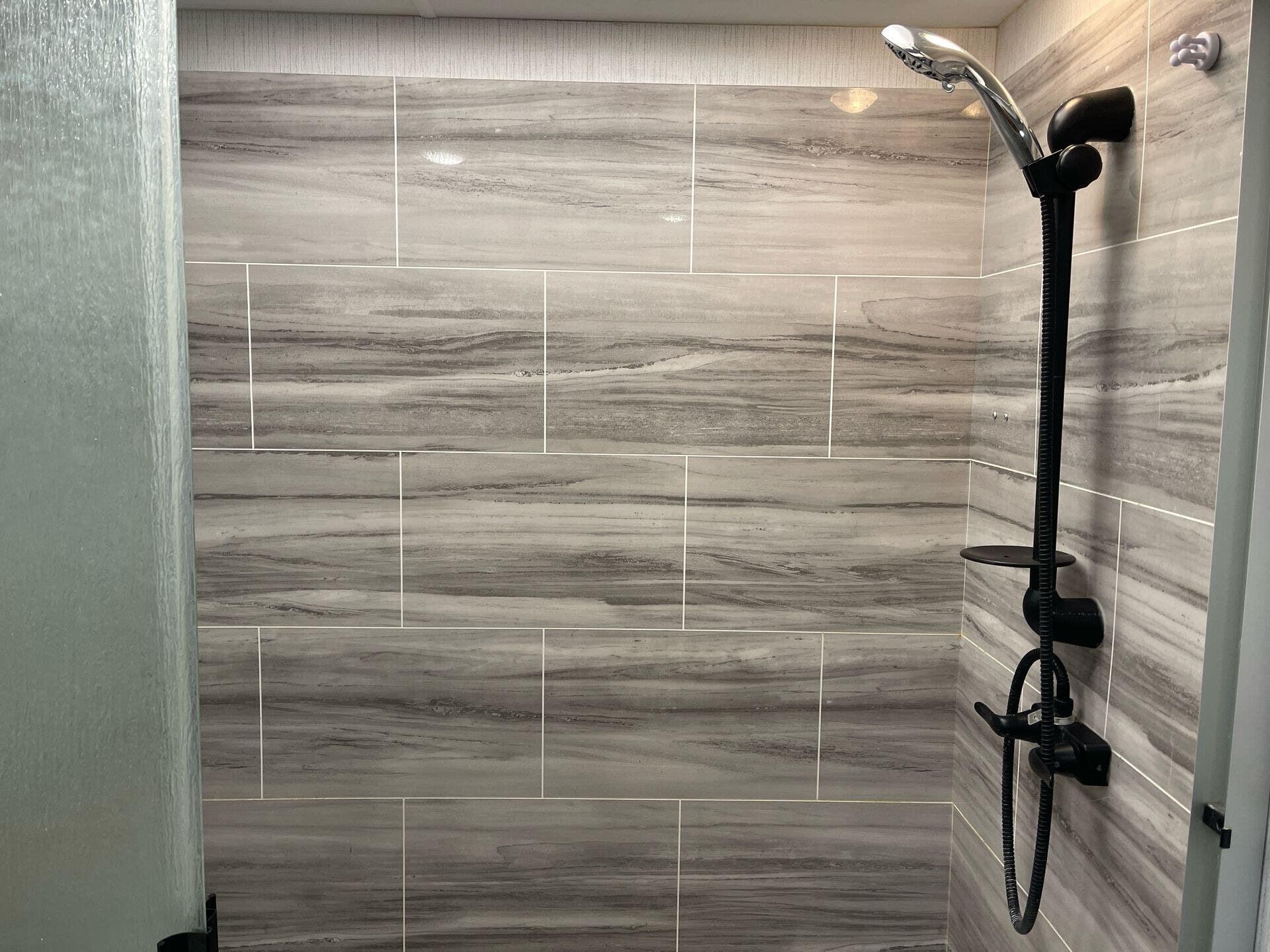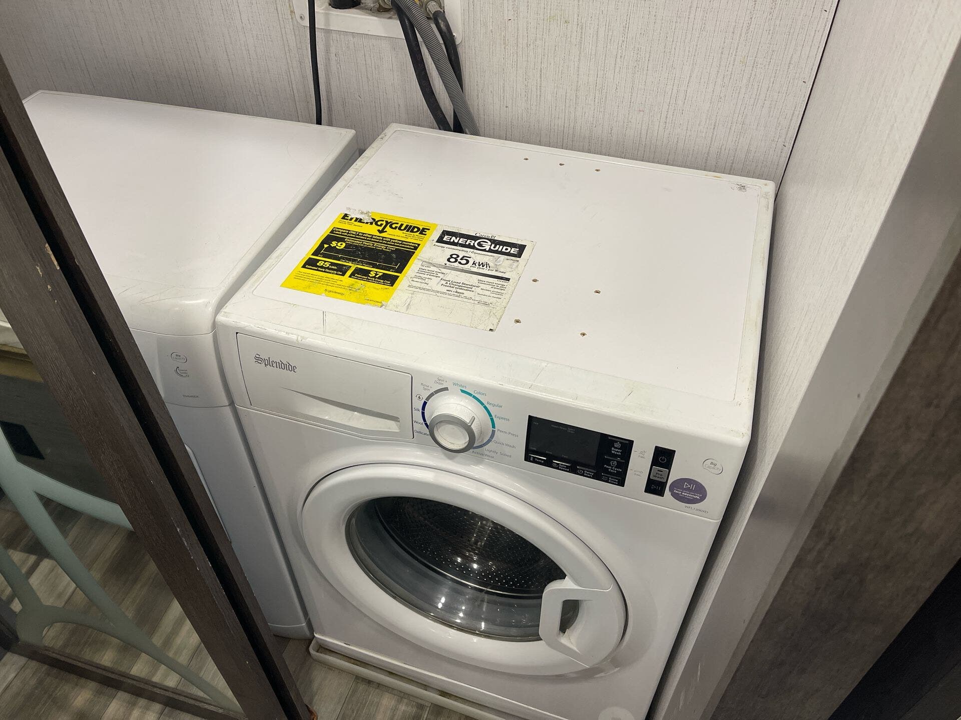 The master bedroom is a true retreat, with a king-size bed, plentiful closet space, and washer/dryer prep, offering the conveniences of home life on the road. The full bathroom includes a roomy residential shower with seat, linen storage, and quality fixtures.