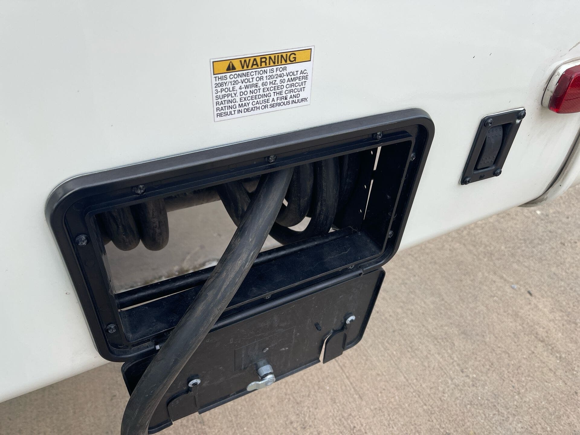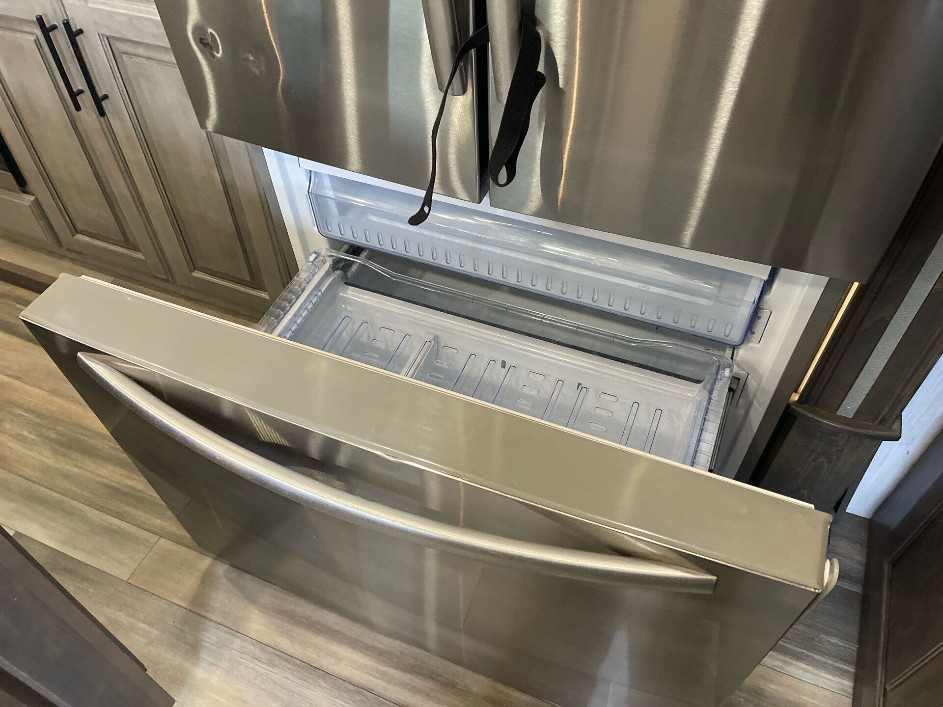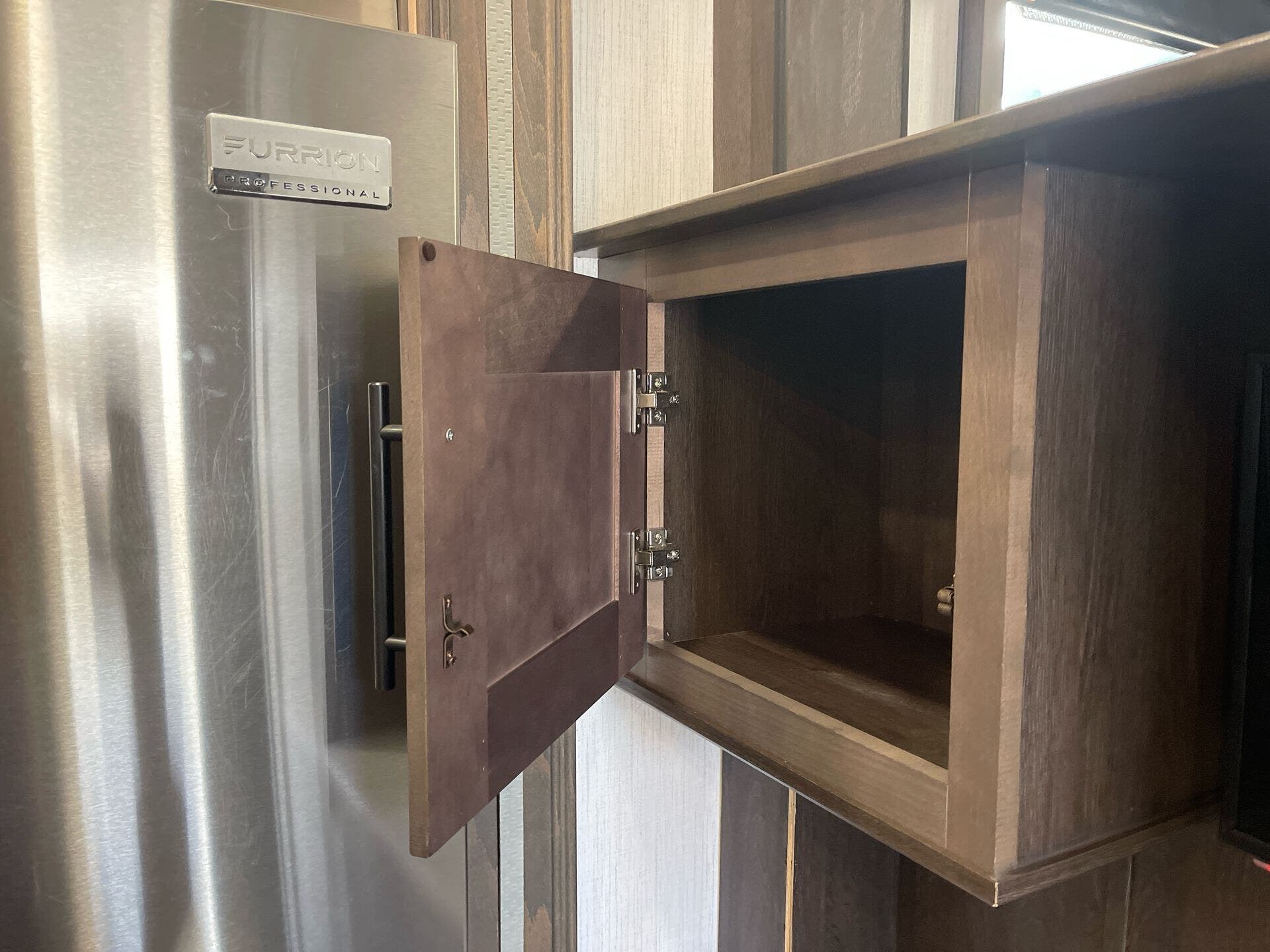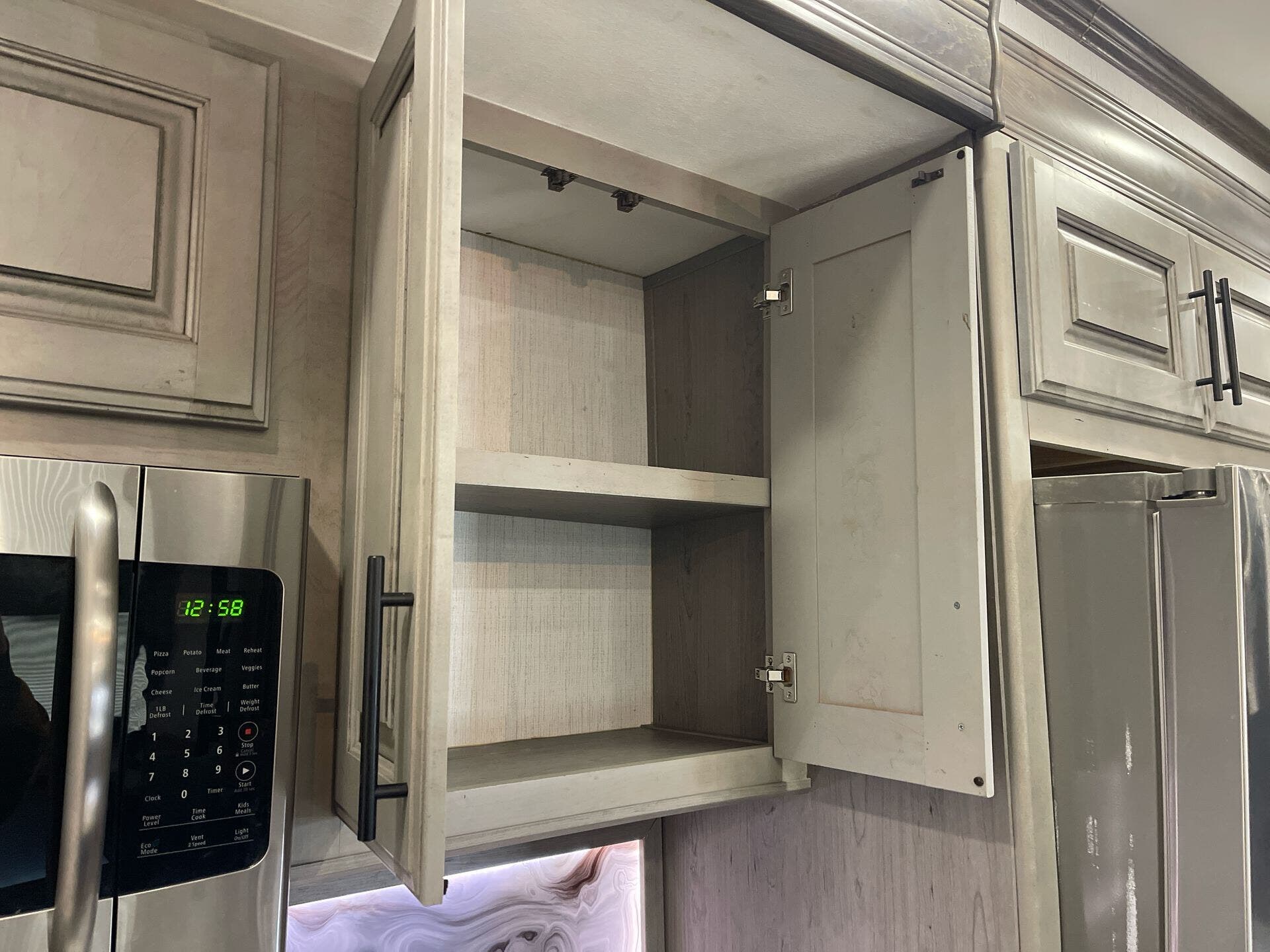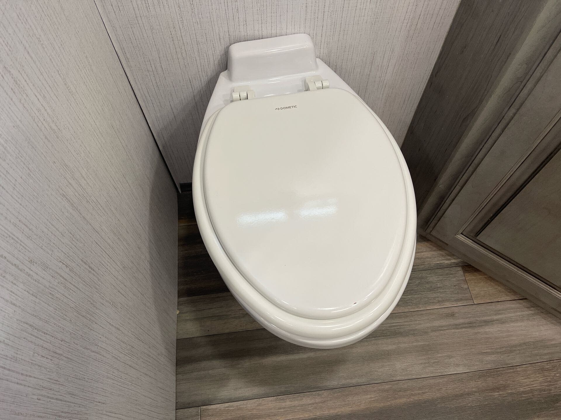 The master bedroom is a true retreat, with a king-size bed, plentiful closet space, and washer/dryer prep, offering the conveniences of home life on the road. The full bathroom includes a roomy residential shower with seat, linen storage, and quality fixtures.
