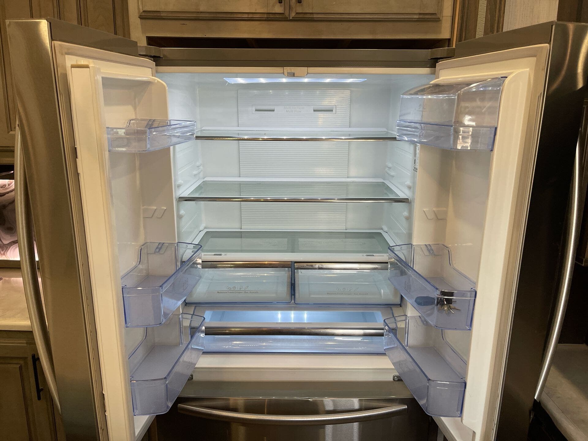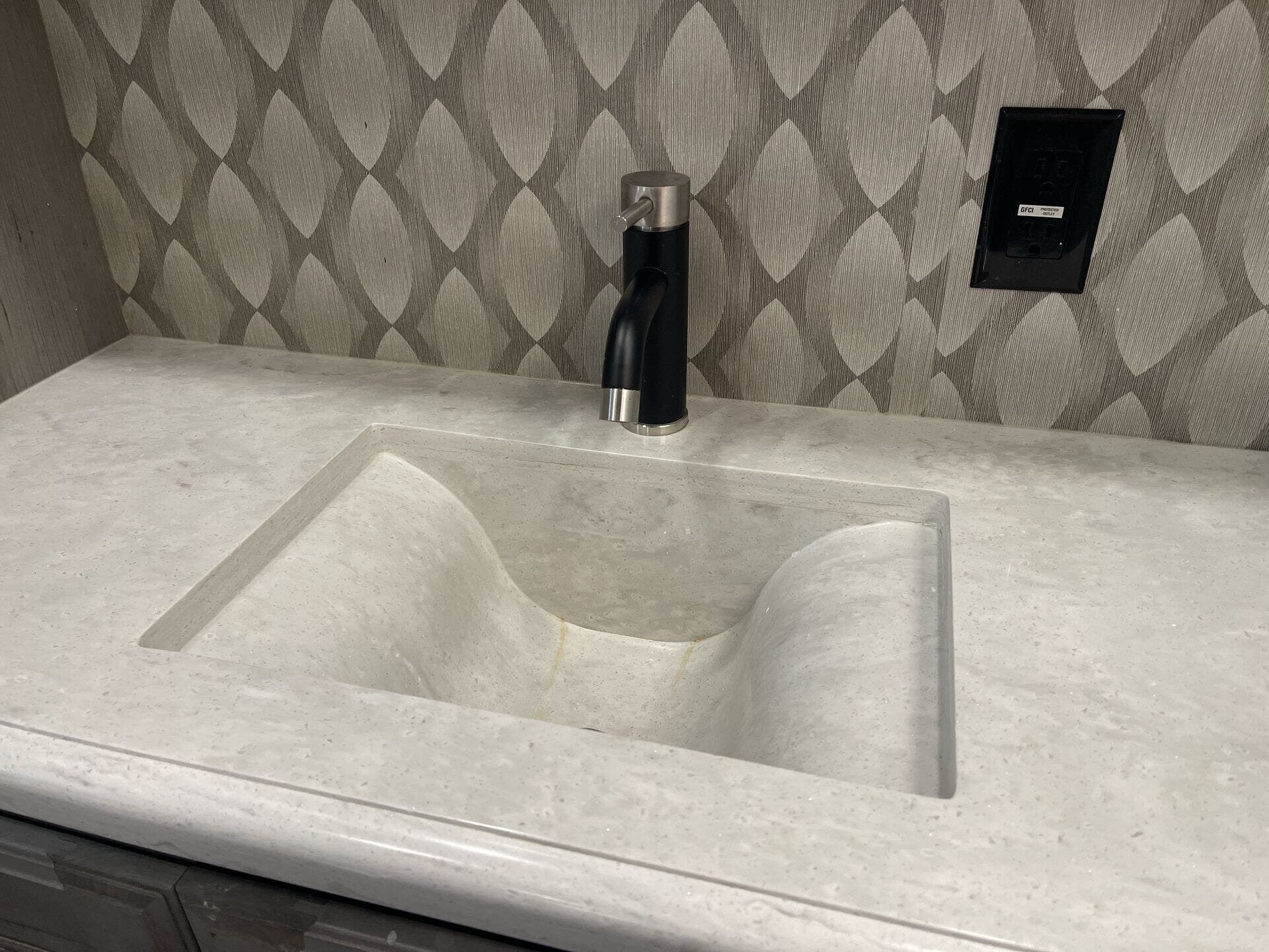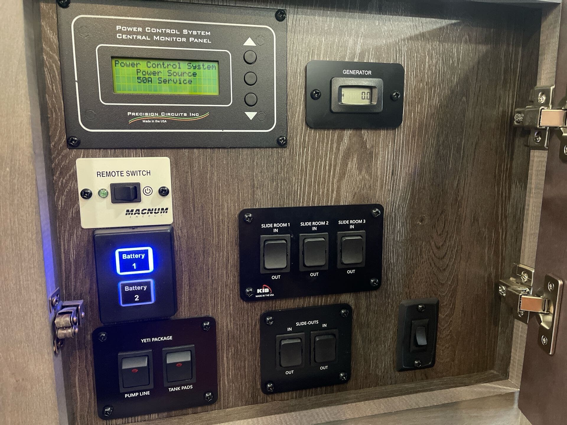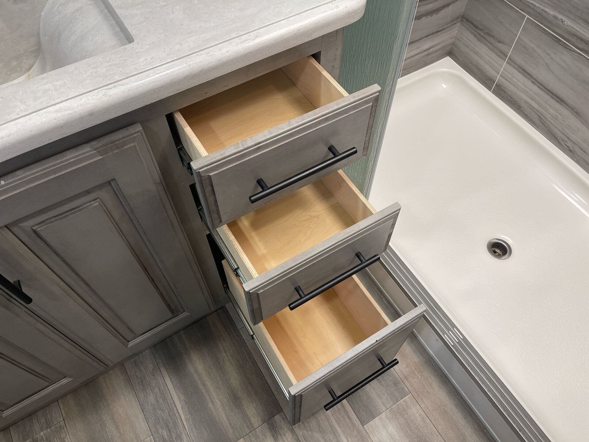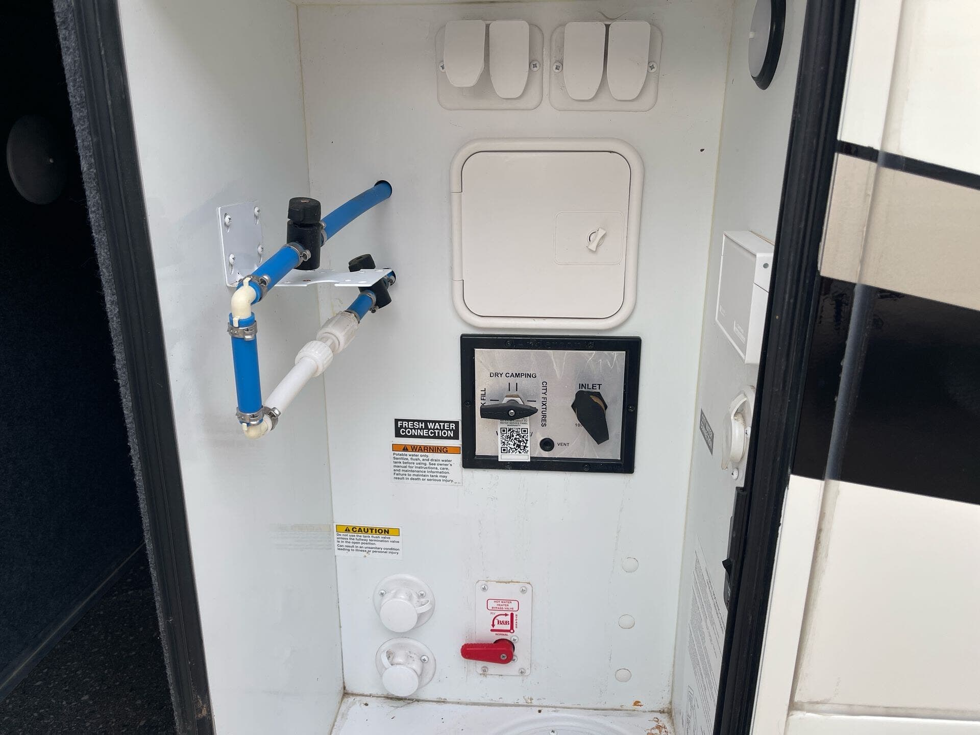 The master bedroom is a true retreat, with a king-size bed, plentiful closet space, and washer/dryer prep, offering the conveniences of home life on the road. The full bathroom includes a roomy residential shower with seat, linen storage, and quality fixtures.