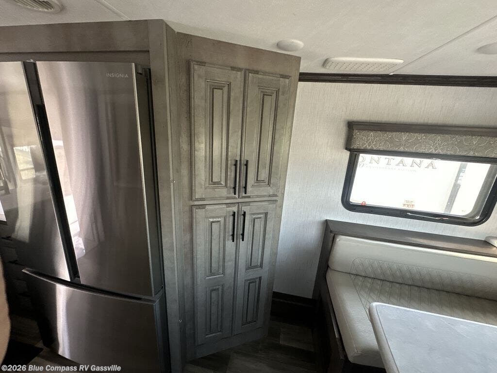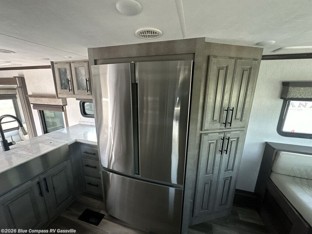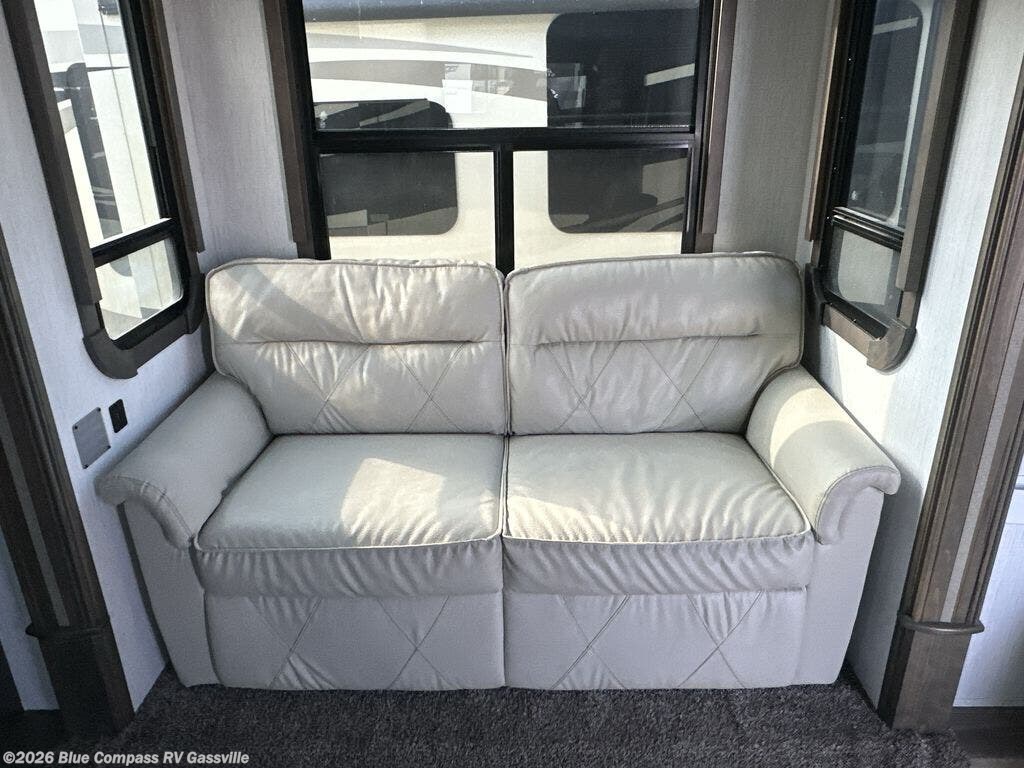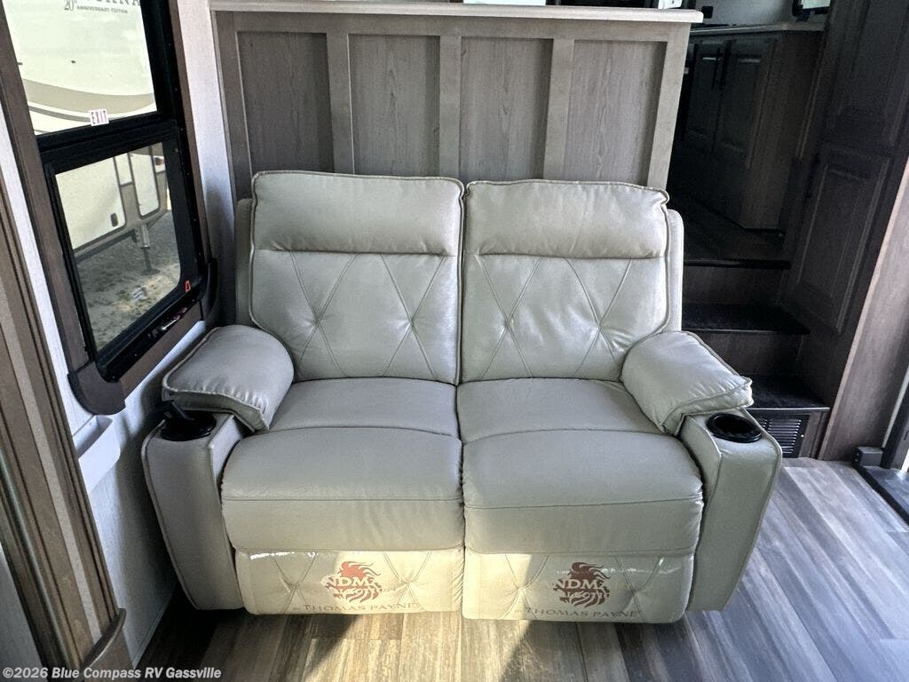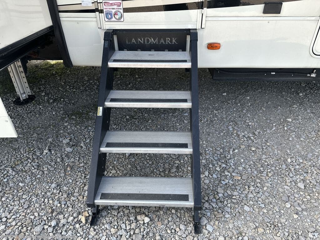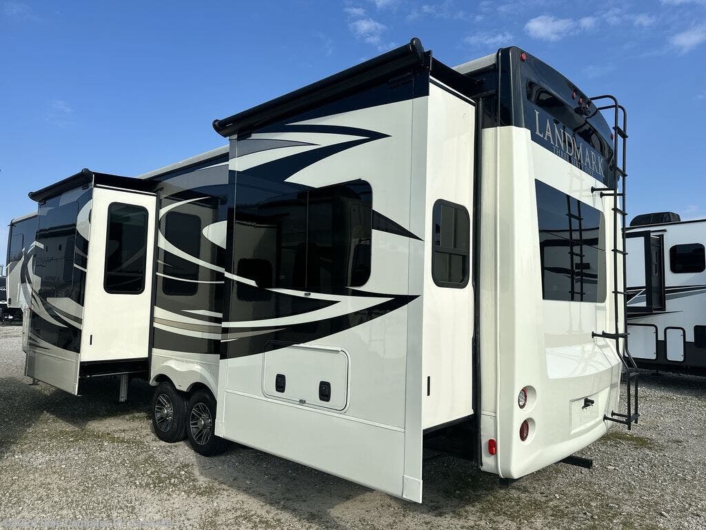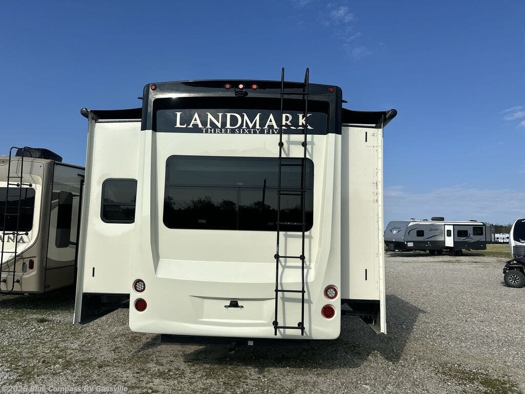 Everyone will love camping in this Landmark 365 fifth wheel! The rear private bedroom is fit for a King with a tilting king-size bed, a TV, adjustable reading lights, and a closet prepped for the optional washer and dryer. Just outside the bedroom is the full bathroom equipped with everything you will need to start each morning squeaky clean. The chef of the group is going to love whipping up delicious meals in the full kitchen and love having the front dinette close by even more for others to socialize too. After you have filled yourself to the brim, you can head into the middle living area and choose to relax on one of the two sofas or the power theatre seating with heat and massage for the ultimate relaxation!