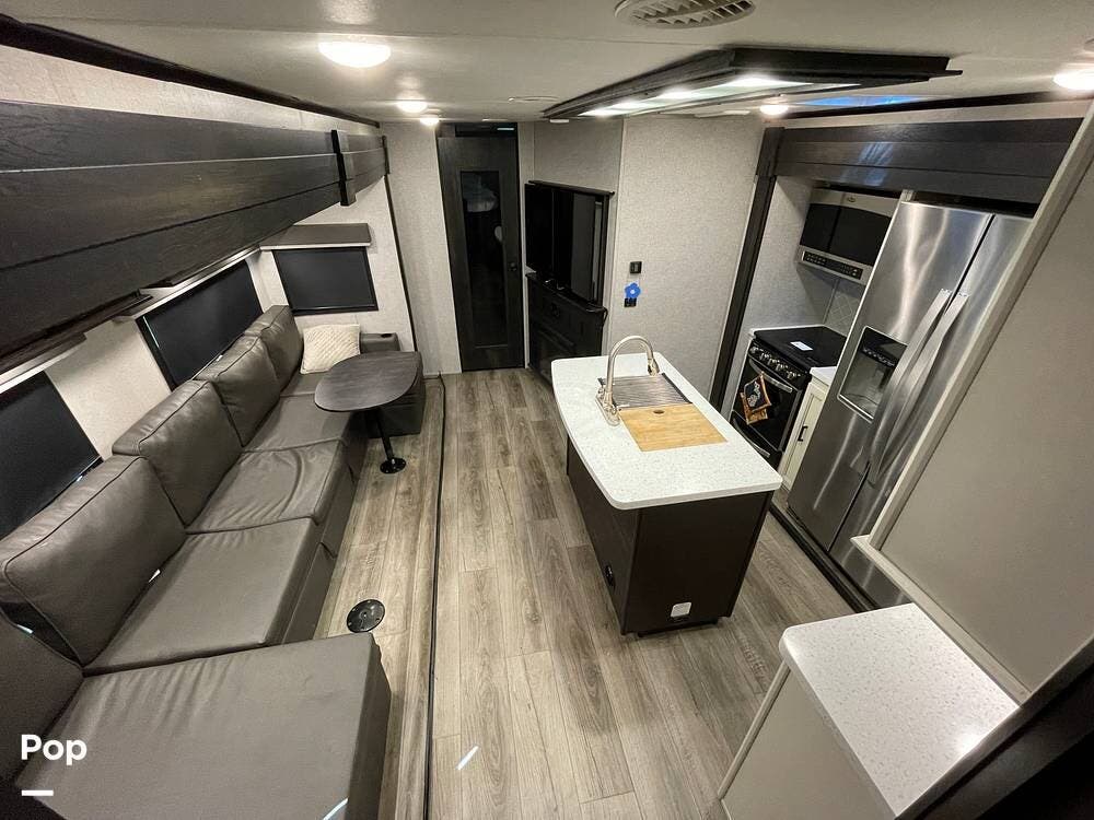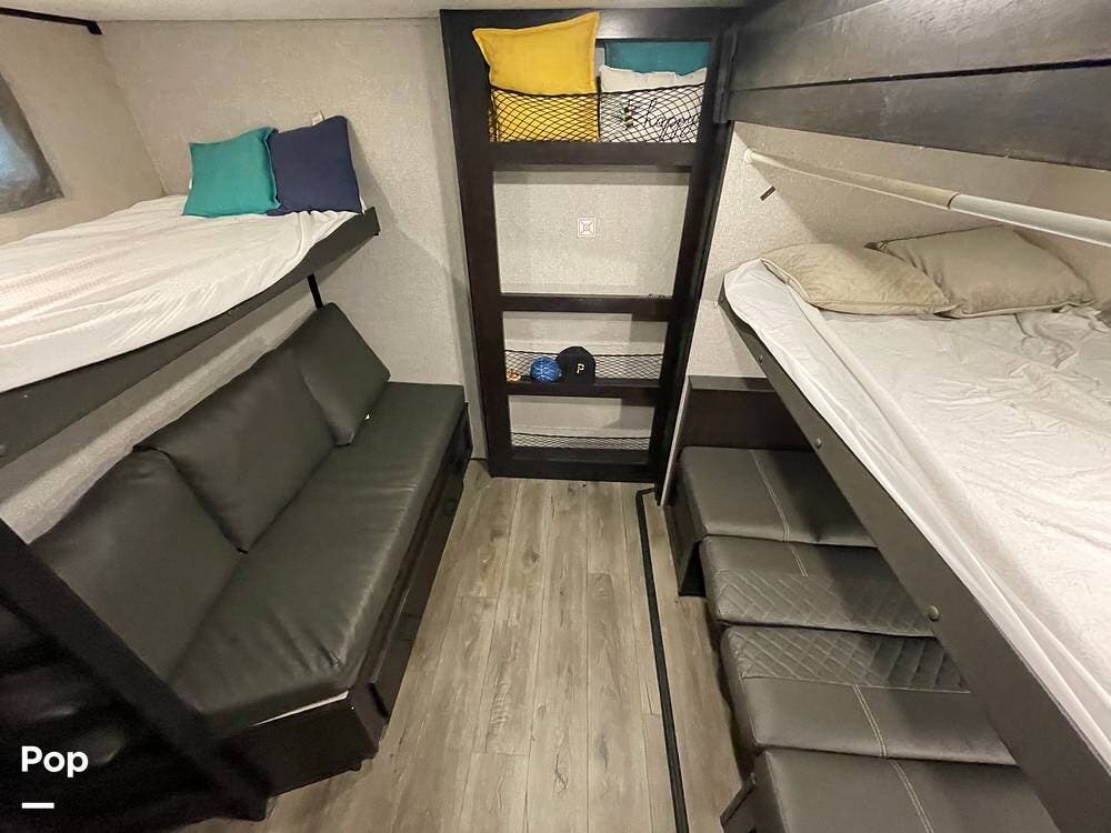 This 2021 Highland Ridge 338BHS is a roomy, family-oriented travel trailer with an accommodating layout. It can sleep up to 10 people, including a bunk house and a king bed in the master bedroom.