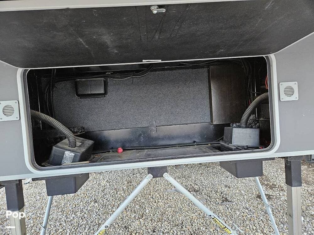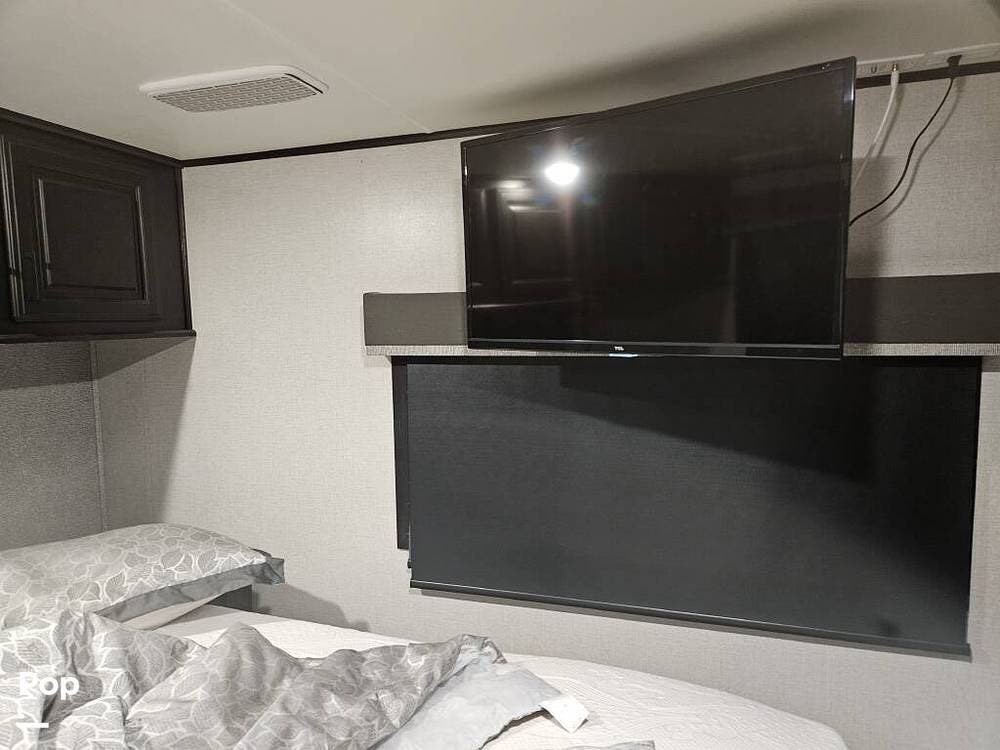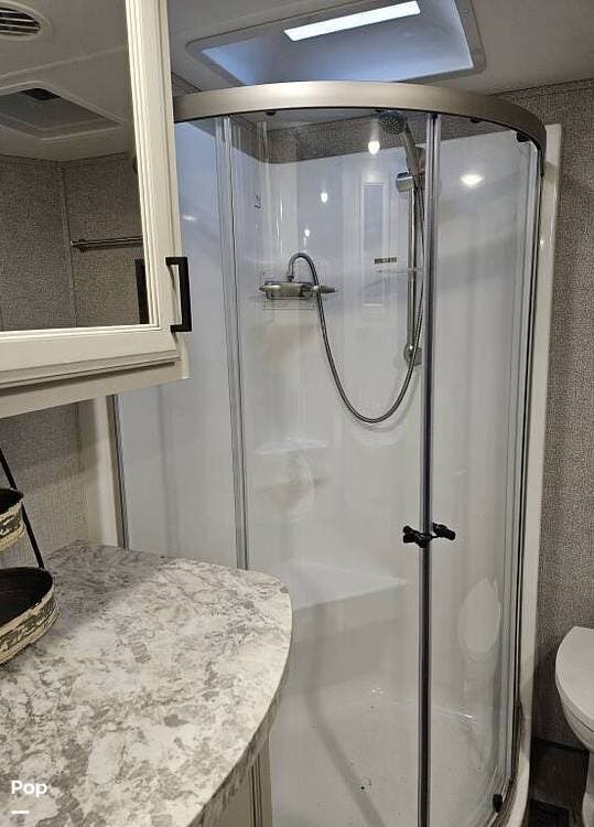 One of its standout features is the unique front living area, which includes dual tri-fold sofas, a 40-inch TV, and a half bath. This makes it ideal for entertaining guests.