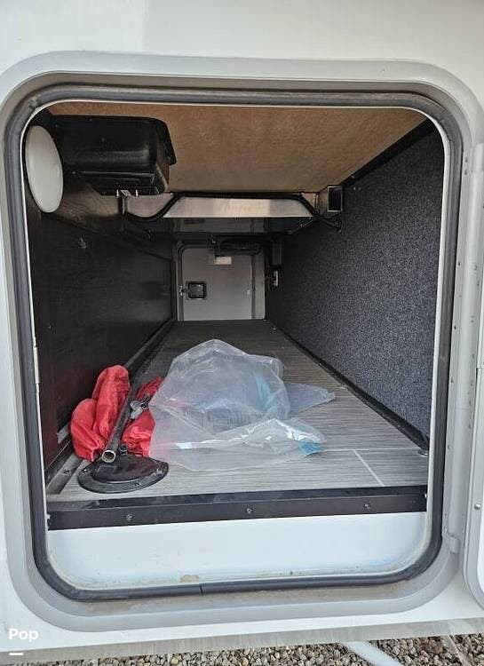 The RV's construction includes a 100-inch-wide body frame, ACCU-SLIDE slide system, and LevelLoc automatic leveling with JT's Strong Arms, which provide stability and ease of setup.